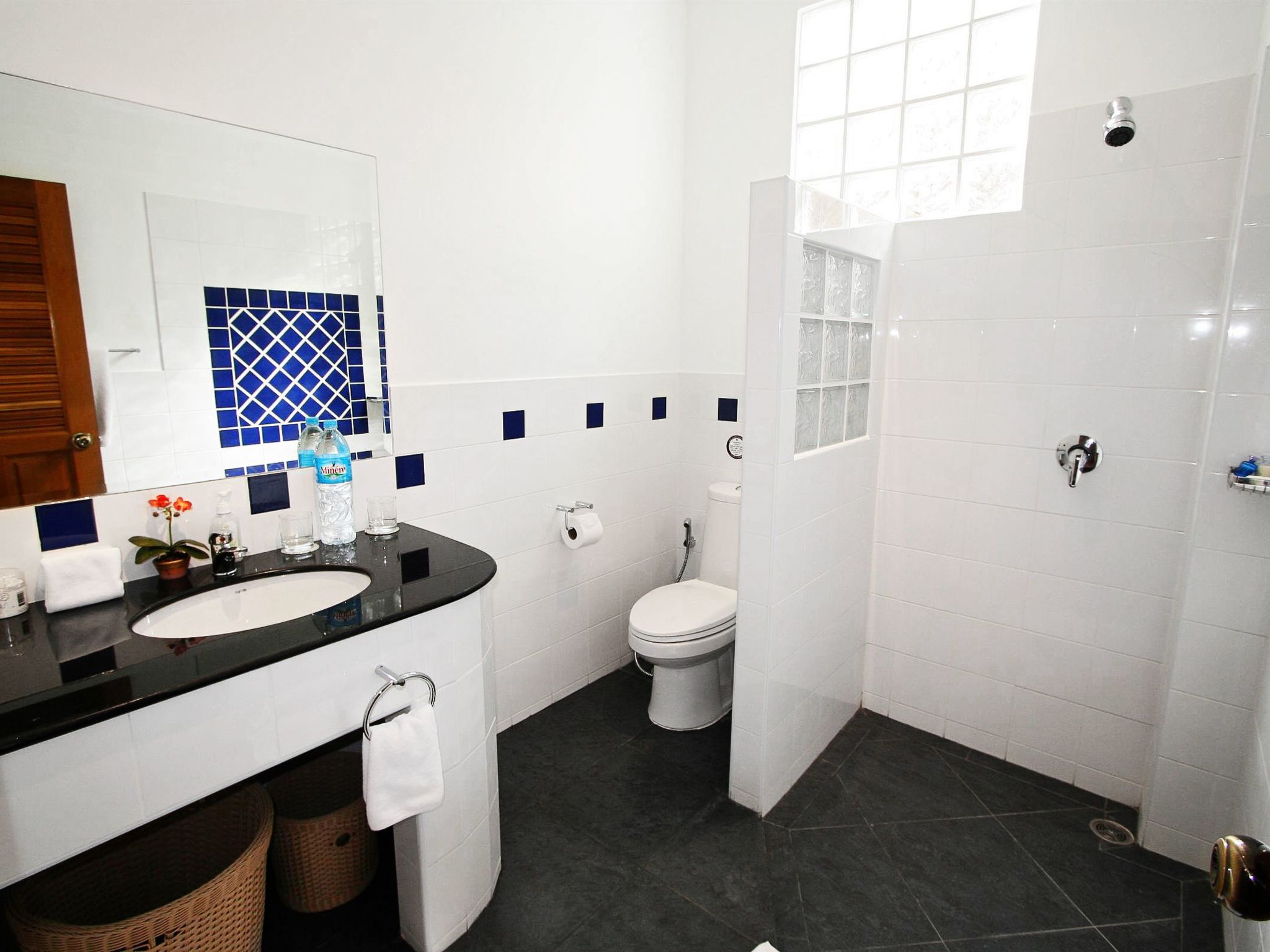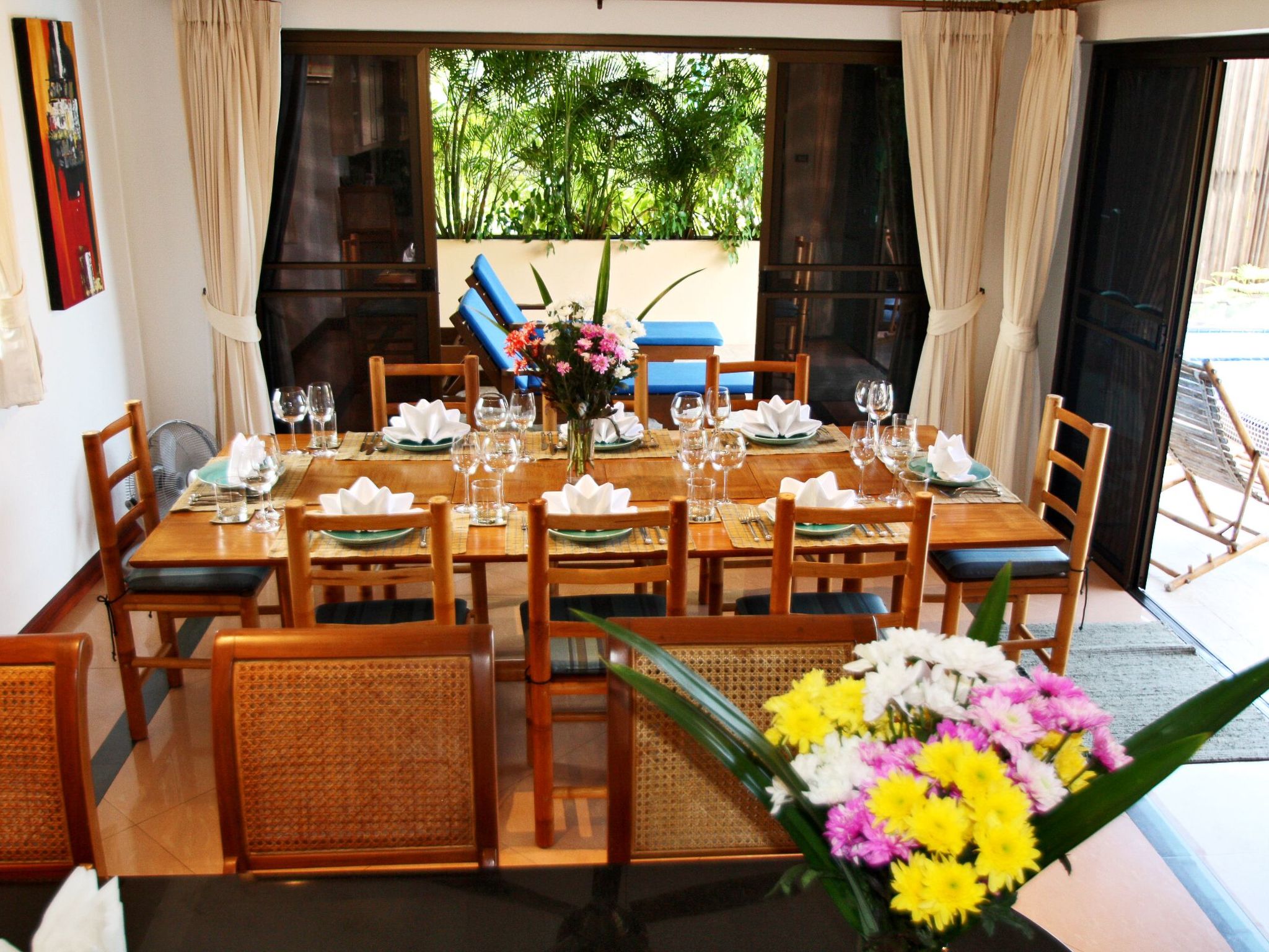 Im Erdgeschoss befindet sich ein geräumiger Flur mit vier großen Doppelschlafzimmern, alle mit eigenem Bad. Drei Schlafzimmer haben Kingsize-Doppelbetten und das vierte Schlafzimmer hat zwei Einzelbetten, die als Kinderzimmer mit dem Hauptschlafzimmer verbunden oder als separates Doppelbett genutzt werden können. Das Hauptschlafzimmer hat ein riesiges Bambus-Himmelbett, und das Hauptbadezimmer hat eine doppelte Jacuzzi-Badewanne, eine begehbare Dusche und zwei Waschbecken in einer schwarzen Marmorplatte. Der Hauptspeisebereich bietet Platz für acht Personen und vier weitere an der Küchenbar und öffnet sich zum Pool und zum Meer hin. Das offene Wohnzimmer bietet ebenfalls Platz für acht Personen und verfügt über einen sehr großen Breitbildfernseher für Filme und DVDs. Die offene Küche befindet sich ebenfalls im Obergeschoss, wo unsere Vollzeitmitarbeiter Ihnen bei Bedarf Getränke servieren oder für Sie kochen.