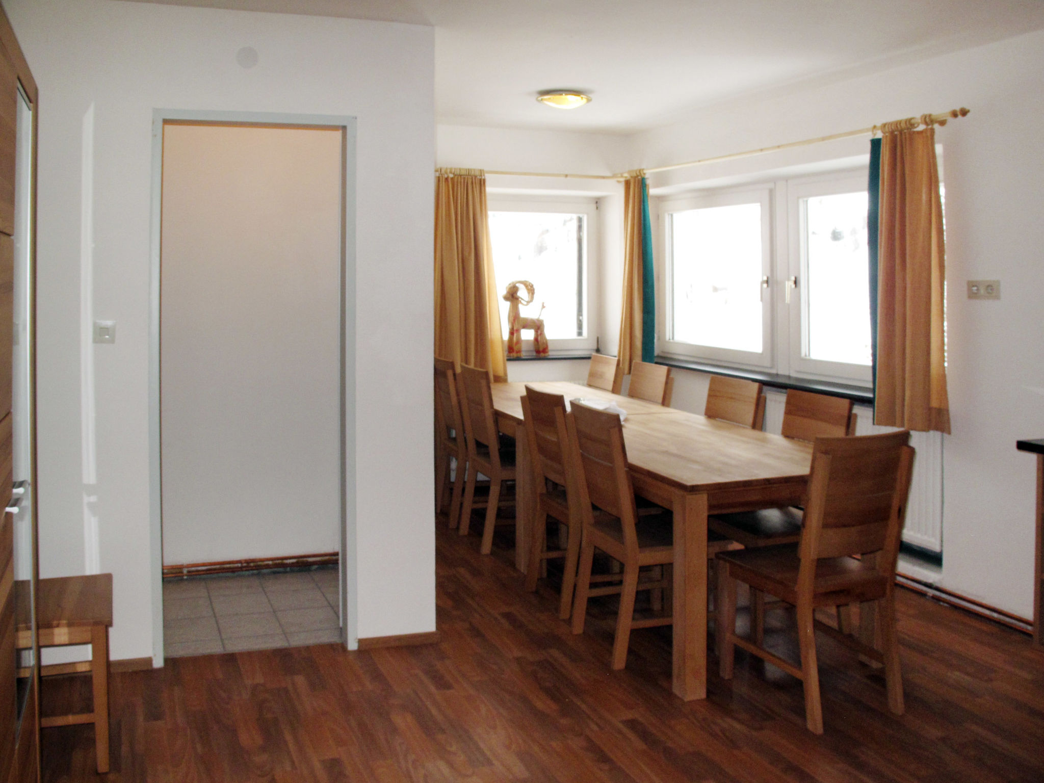 5-Zimmer-Wohnung, 1. Etage, ca. 127 m². Großer Flur. Wohnraum mit Sitzgruppe. Küche (5 Ceranfelder, Backofen, Mikrowelle, Geschirrspüler, Kühlschrank, Kaffeemaschine, Wasserkocher) mit Essplatz. 2 Doppelzimmer. Dreibettzimmer. Dusche/WC. Sep. WC. Zweibettzimmer (Laminatboden) mit Dusche/WC. Bei Belegung mit weniger Personen als der maximalen Personenzahl stehen nicht alle Wohneinheiten zur Verfügung.