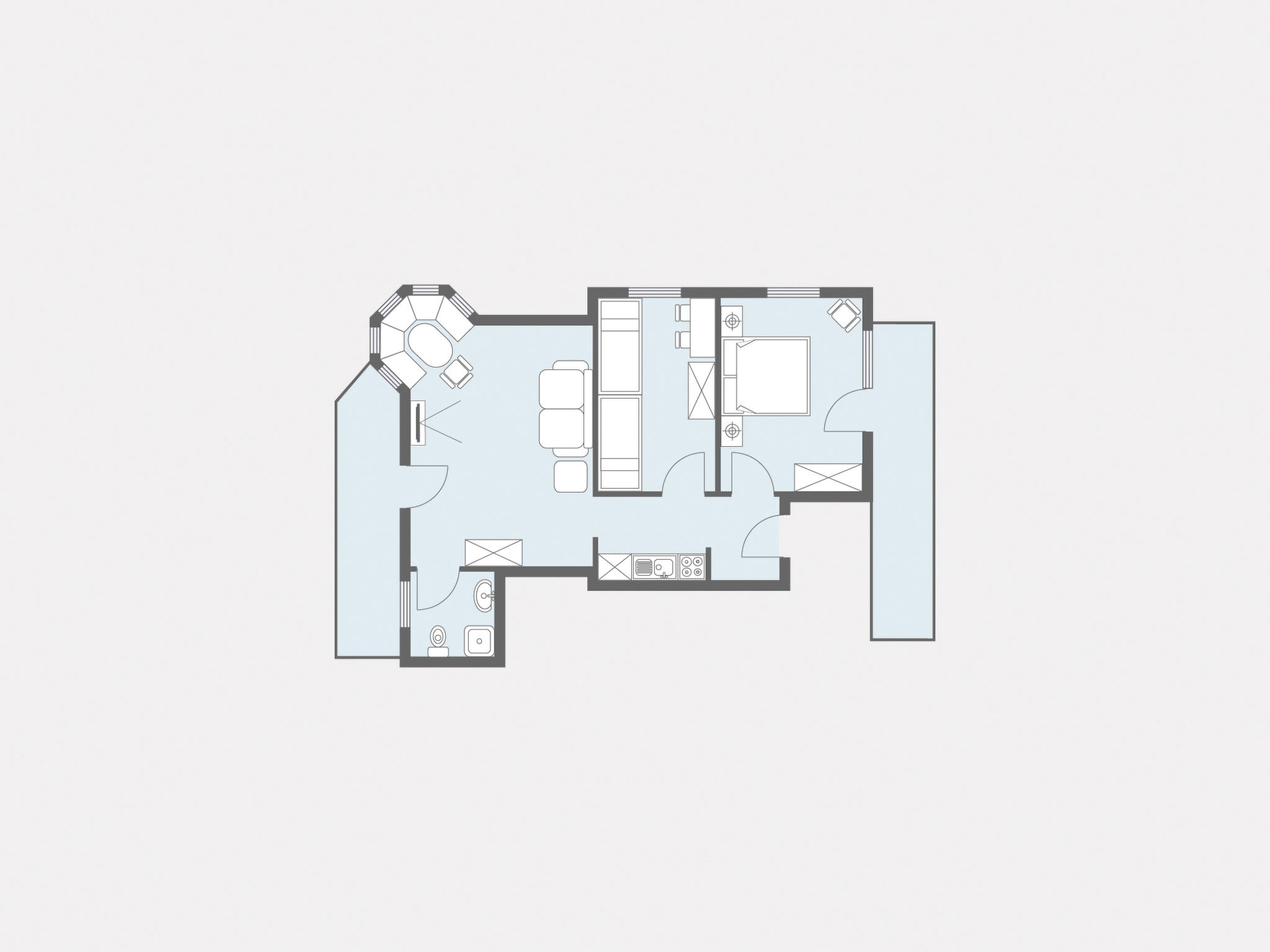 3-Zimmer Wohnung, 3. Etage, ca. 72 m². Wohnraum mit Sitzcouch, Essplatz (Eckbank) und Balkonausgang. Zum Wohnraum offene Küche (4 Platten, Backofen, Mikrowelle, Kühlschrank, Kaffeemaschine, Wasserkocher). Doppelzimmer mit Balkonausgang. Zweibettzimmer. Dusche/WC.