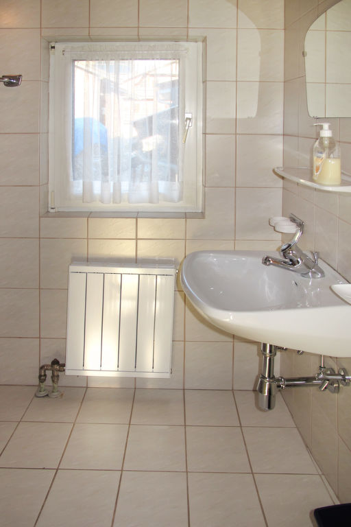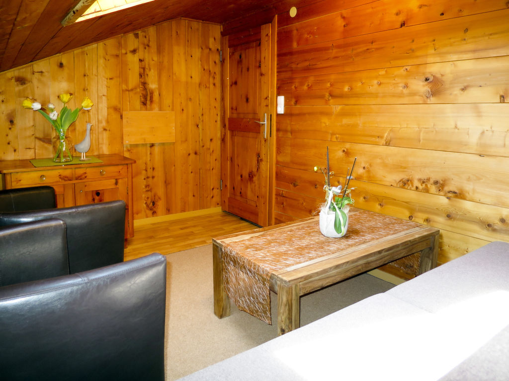 6½-Zimmer-Wohnung, 2 Etagen, ca. 120 m². 1. Obergeschoss: Wohnküche (4 Ceranfelder, Backofen, Mikrowelle, Geschirrspüler, Kühlschrank, Kaffeemaschine, Wasserkocher, Toaster) mit Essplatz (Eckbank). 2 Doppelzimmer, jeweils mit Waschbecken. Schlafzimmer mit Doppelbett und Sitzcouch, Waschbecken. Dusche/WC. Flur mit Balkonausgang, von hier Treppe ins 2. Obergeschoss: 2 Doppelzimmer, jeweils mit Balkonausgang. Kleiner Spielraum (eingeschränkte Stehhöhe) mit Sitzcouch und Sat-TV. Dusche. Sep.WC.