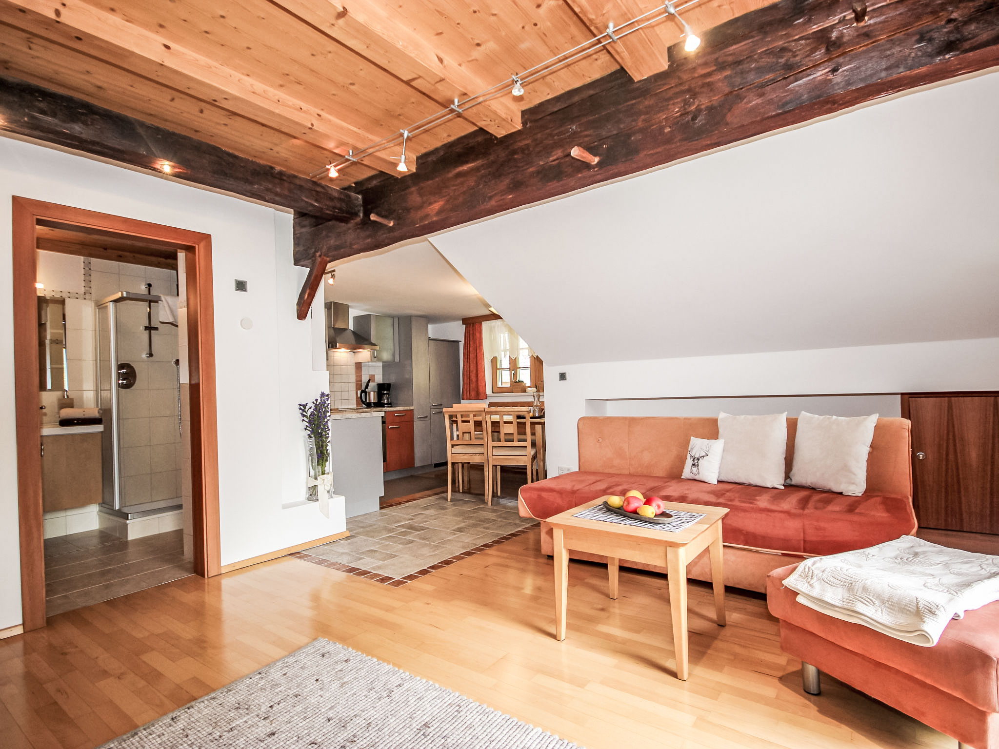 2-Zimmer-Wohnung 47 m2, im Dachgeschoss. Vollständig renoviert, geschmackvoll eingerichtet: abgeschrägtes Wohn-/Schlafzimmer mit Panoramafenster mit 1 Ausziehbett (2 Pers.), Sat-TV. Ausgang zum Balkon. 1 abgeschrägtes Doppelzimmer. Offene Küche (Backofen, Geschirrspüler, 4 Glaskeramikherd Platten) mit Esstisch. Dusche/WC. Grosser Balkon, Südlage. Panoramasicht. Zur Verfügung: Safe, Haartrockner. Bitte beachten: Nichtraucher-Unterkunft. Bitte beachten: Falls diese Wohnung in Kombination mit dem Doppelzimmer AT6450.200.3 gebucht wird, sind maximal 5 Personen gesamt erlaubt (aus Komfortgründen).
