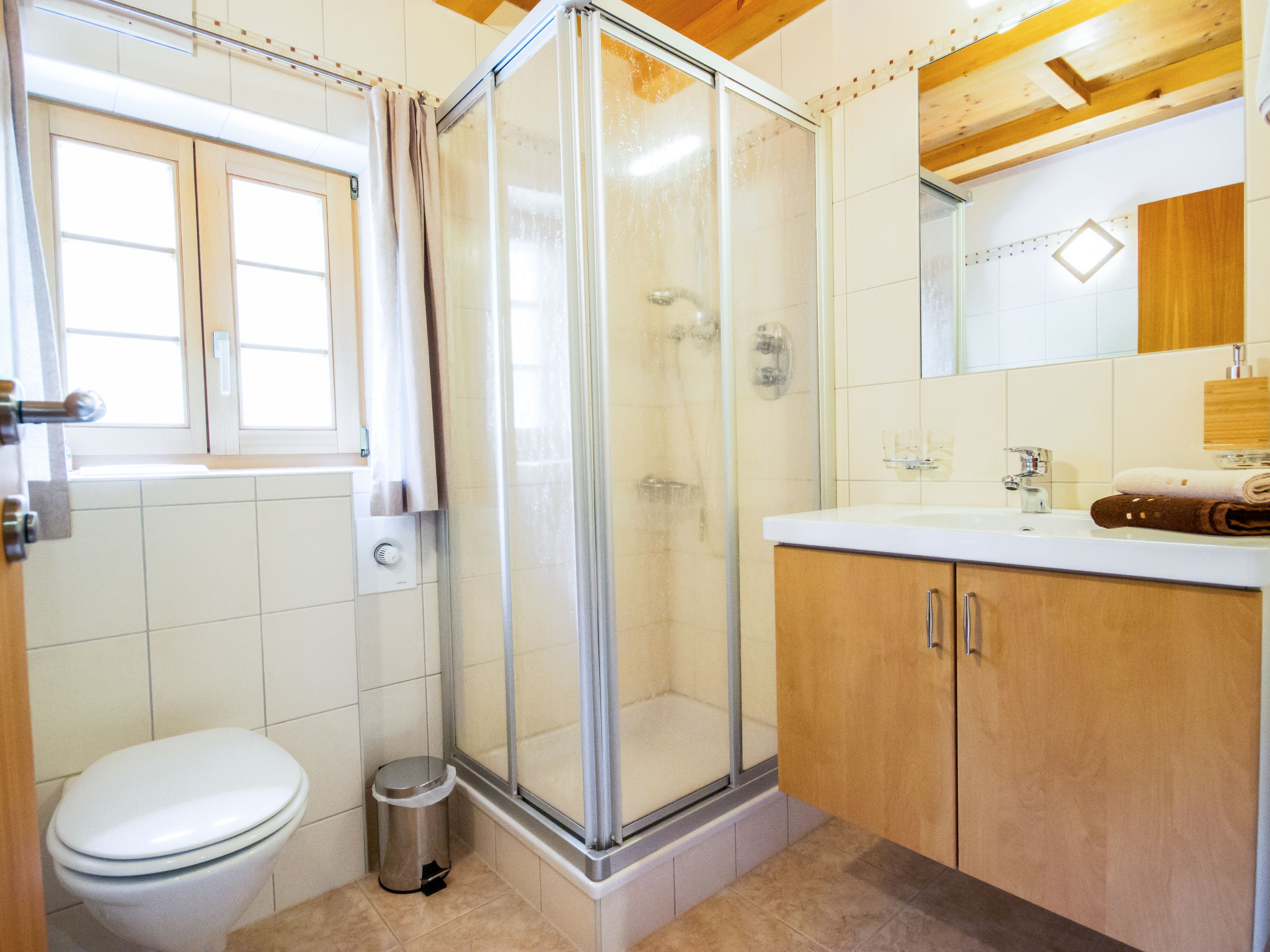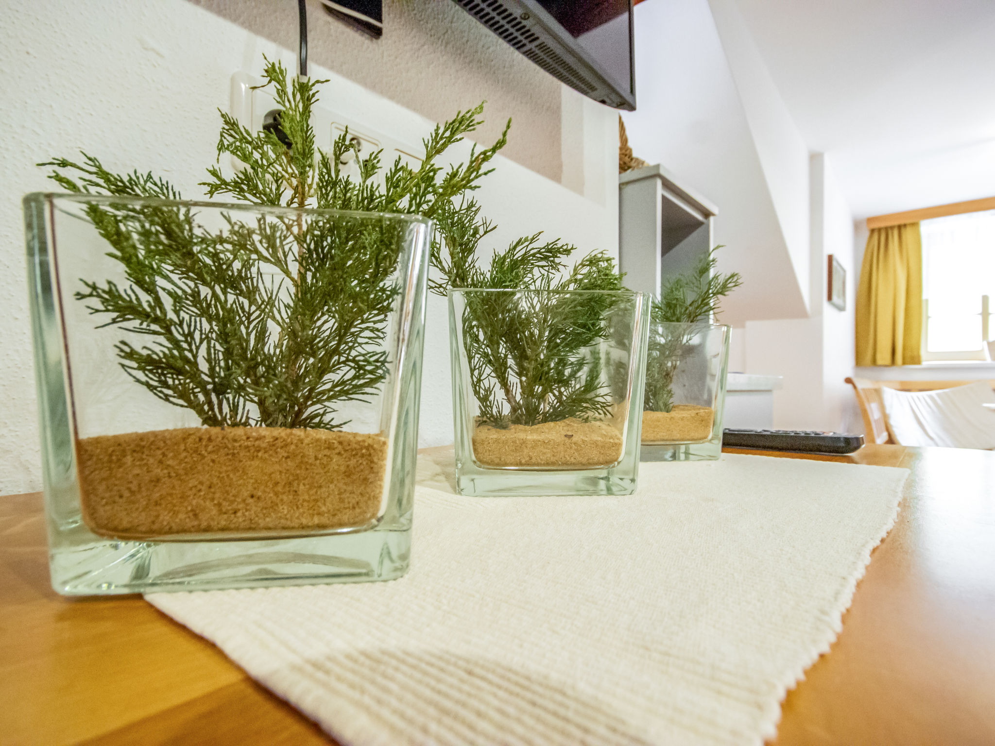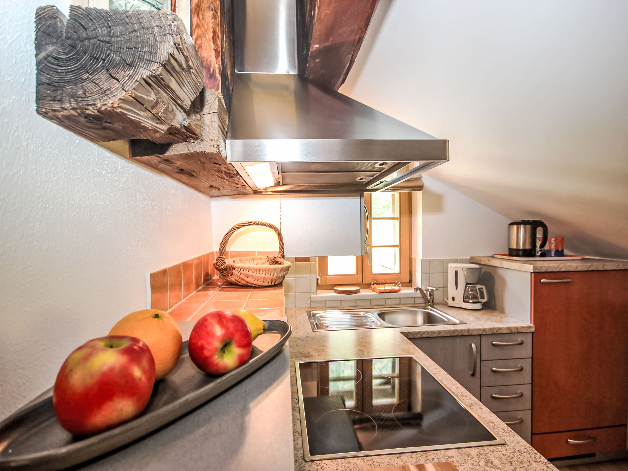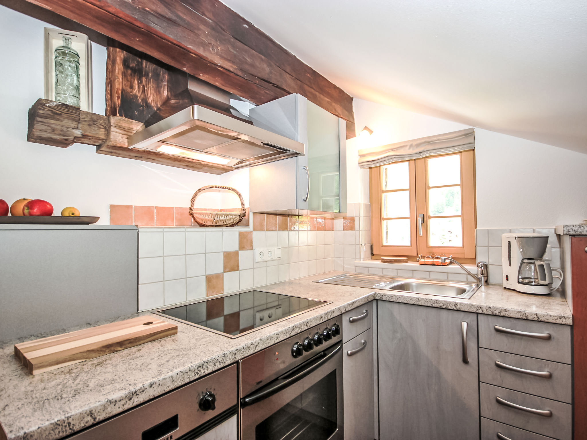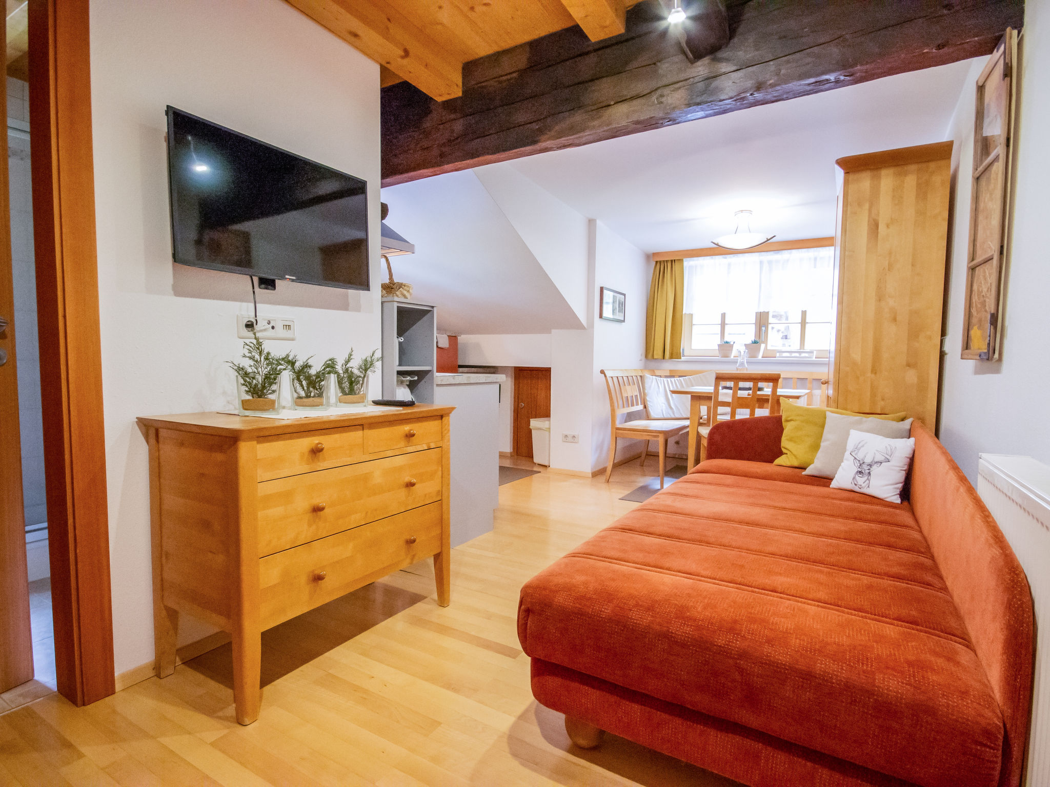 2-Zimmer-Wohnung 32 m2, im Dachgeschoss, Westlage. Vollständig renoviert, geschmackvoll eingerichtet: abgeschrägtes Wohn-/Esszimmer mit 1 Diwanbett und Sat-TV. 1 Doppelzimmer. Offene Küche (Backofen, Geschirrspüler, 4 Glaskeramikherd Platten) mit Esstisch. Dusche/WC. Zur Verfügung: Safe, Haartrockner. Bitte beachten: Nichtraucher-Unterkunft. Bitte beachten: Falls diese Wohnung in Kombination mit dern Doppelzimmer AT6450.200.3 gebucht wird, sind maximal 4 Personen gesamt erlaubt (aus Komfortgründen).