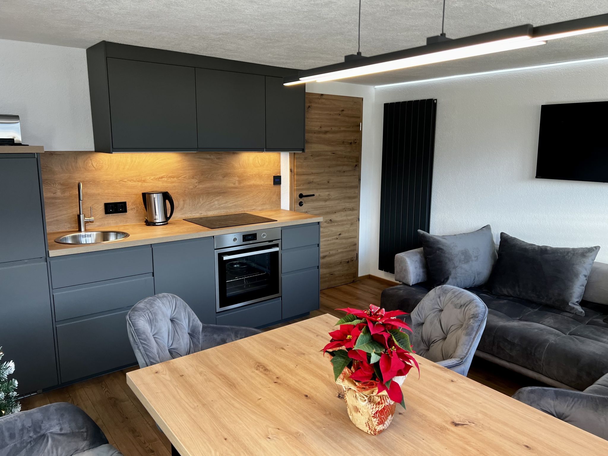 3-Zimmer-Wohnung, 3. Etage, ca. 65m². Wohnraum mit Sitzcouch, Essplatz (Eckbank), Küchenzeile (4 Ceranfelder, Backofen, Mikrowelle, Geschirrspüler, Kühlschrank, Kaffeemaschine, Wasserkocher, Toaster). Doppelzimmer mit Bettcouch und Balkonausgang. Doppelzimmer, Balkonausgang. Dusche. Sep.WC.