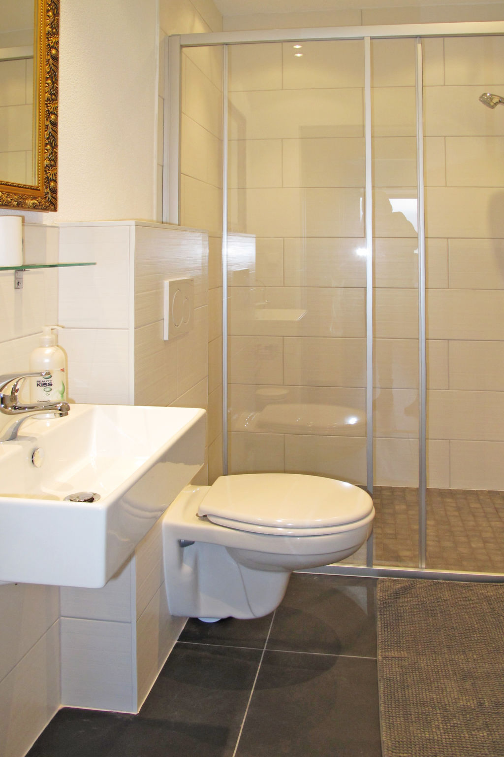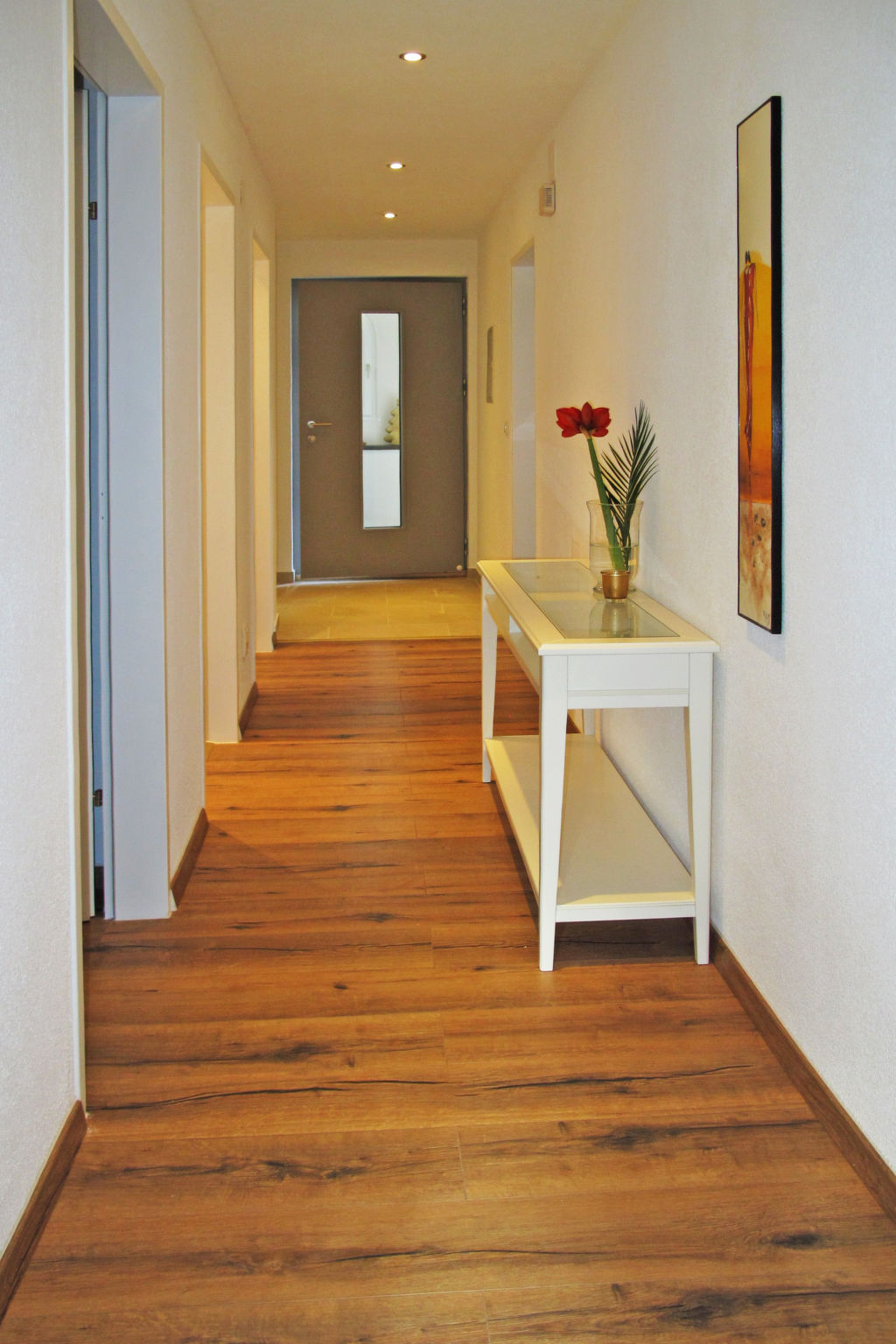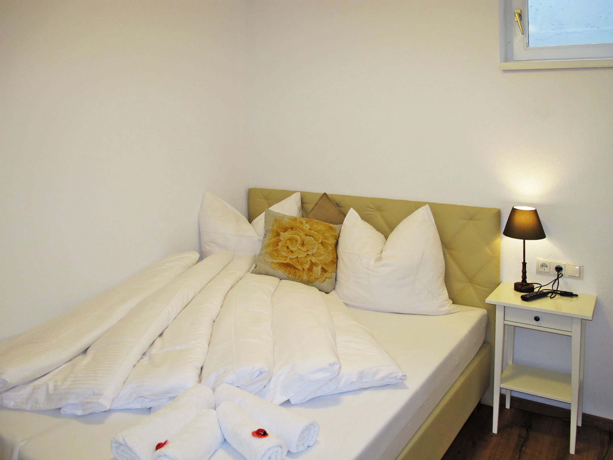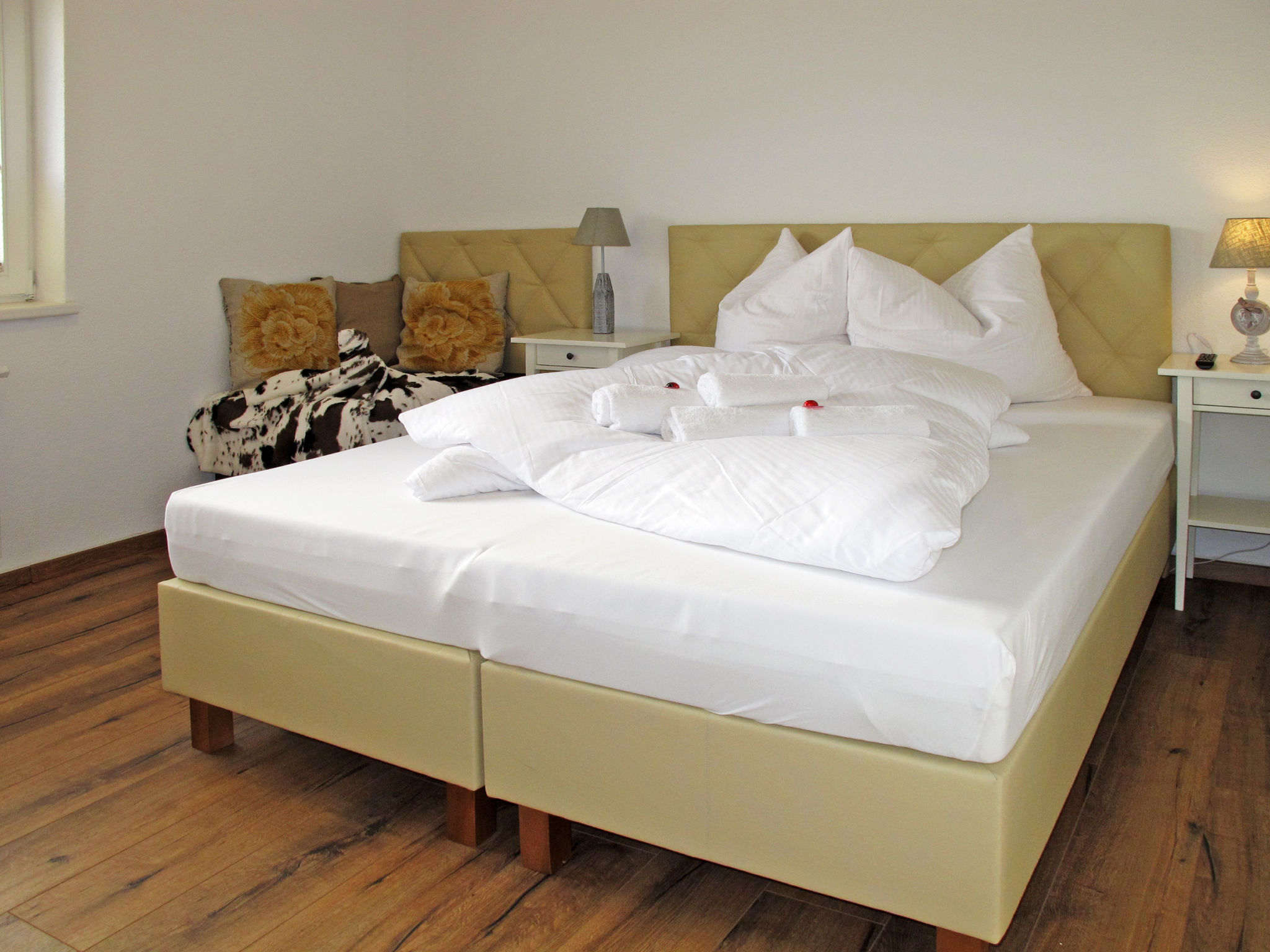 4-Zimmer-Wohnung, 1. Etage, ca. 80 m². Wohn-/Schlafraum mit Doppelbettcouch, Essplatz (Bank) und Terrassenausgang. Durch Theke abgeteilte Küche (4 Ceranfelder, Mikrowelle, Grill, Geschirrspüler, Kühl-/Gefrierkombination, Kaffeemaschine, Wasserkocher, Toaster). 2 Doppelzimmer. Schlafzimmer mit franz. Bett (1,60 m breit). 2x Dusche/WC. Abstellraum. Bei Belegung mit weniger Personen als der maximalen Personenzahl stehen nicht alle Wohneinheiten zur Verfügung.
