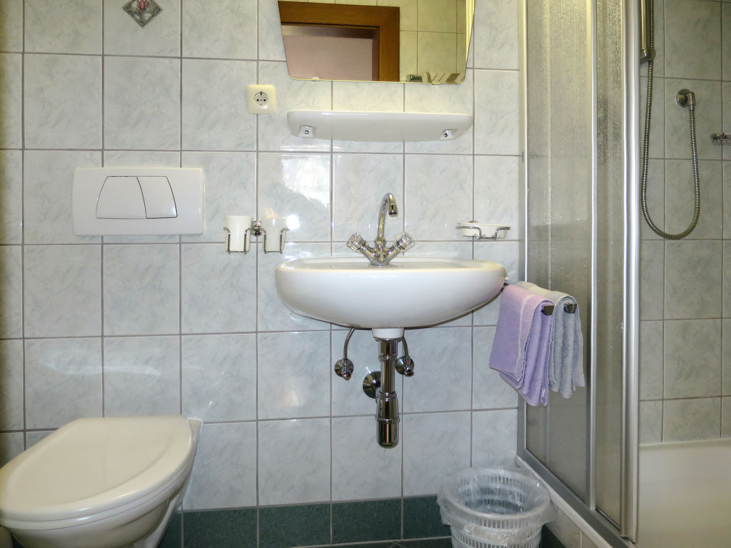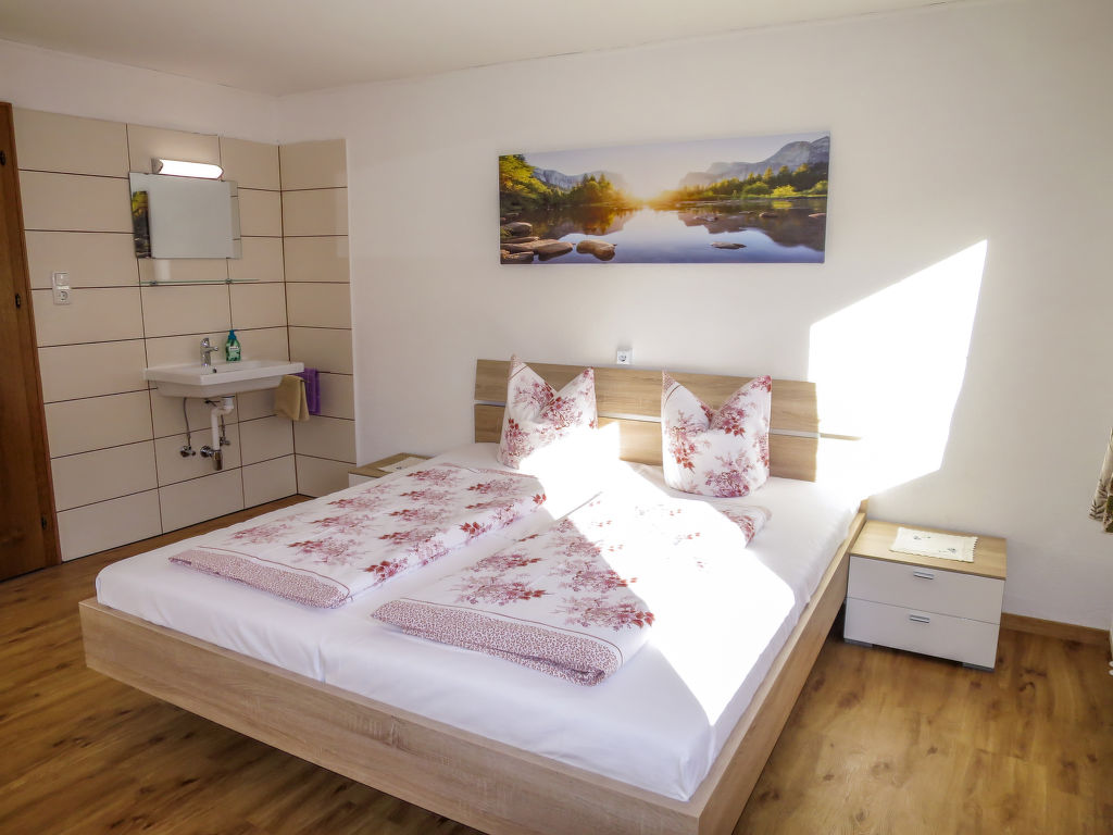 3-Zimmer-Wohnung, 1. Etage, ca. 50 m². Wohnküche mit Sitzcouch, Essplatz (Eckbank) und Küchenzeile (4 Ceranfelder, Backofen, Mikrowelle, Geschirrspüler, Kühlschrank, Kaffeemaschine, Wasserkocher, Toaster). Schlafzimmer mit Doppelbett, Einzelbett und Dusche/WC. Doppelzimmer mit Waschbecken, Balkonausgang (über den Hausflur des Bauernhauses zugänglich).