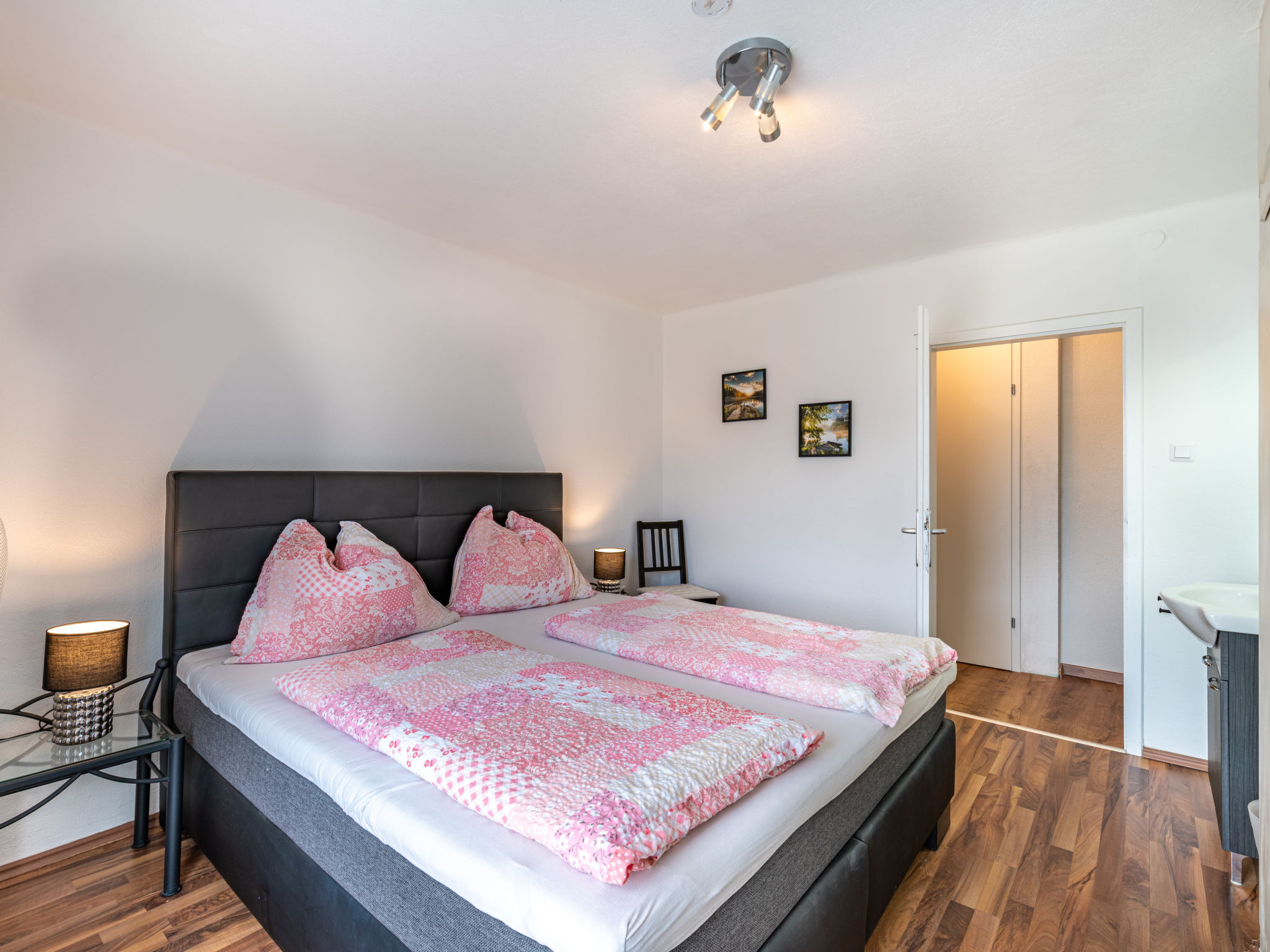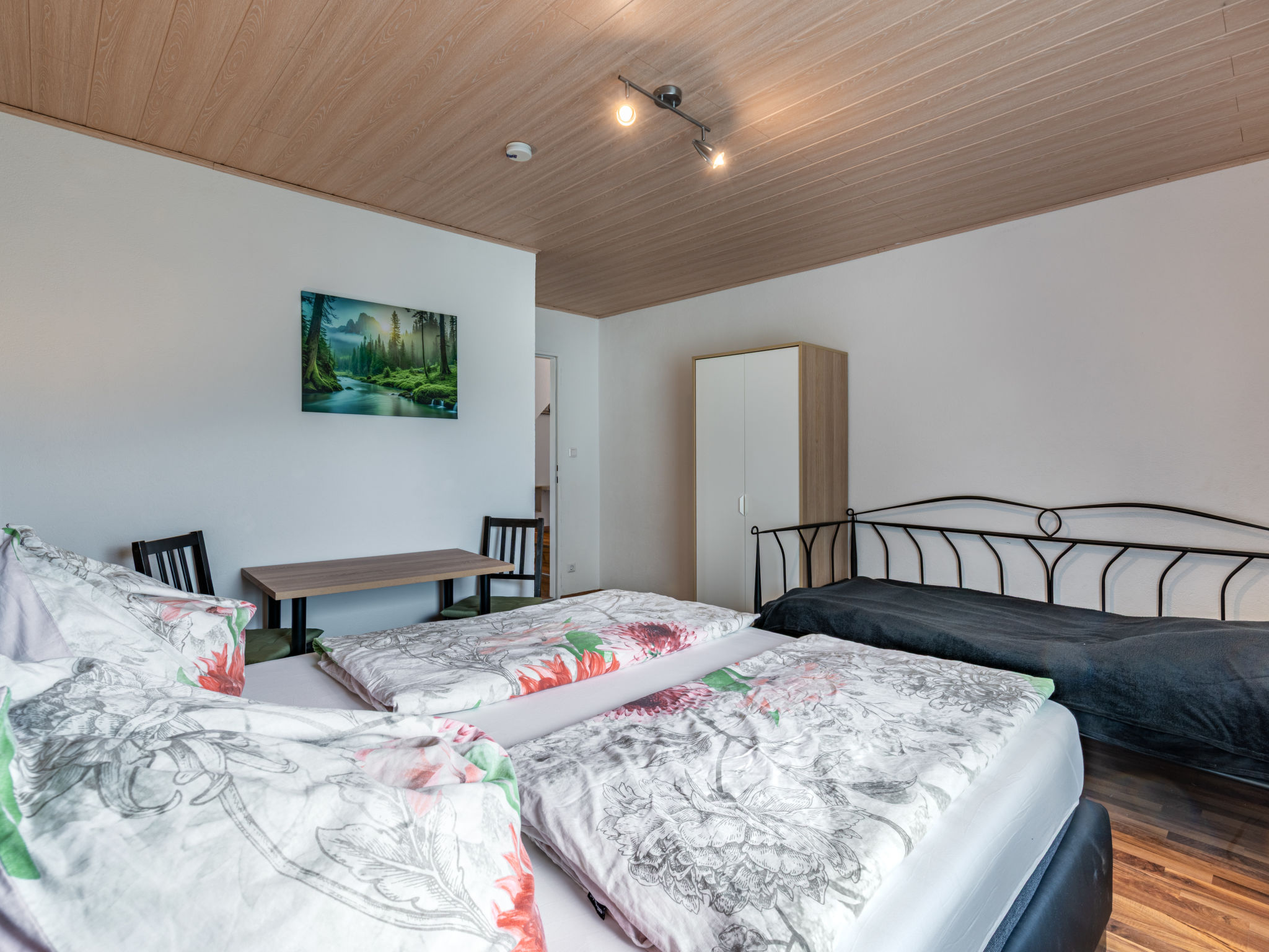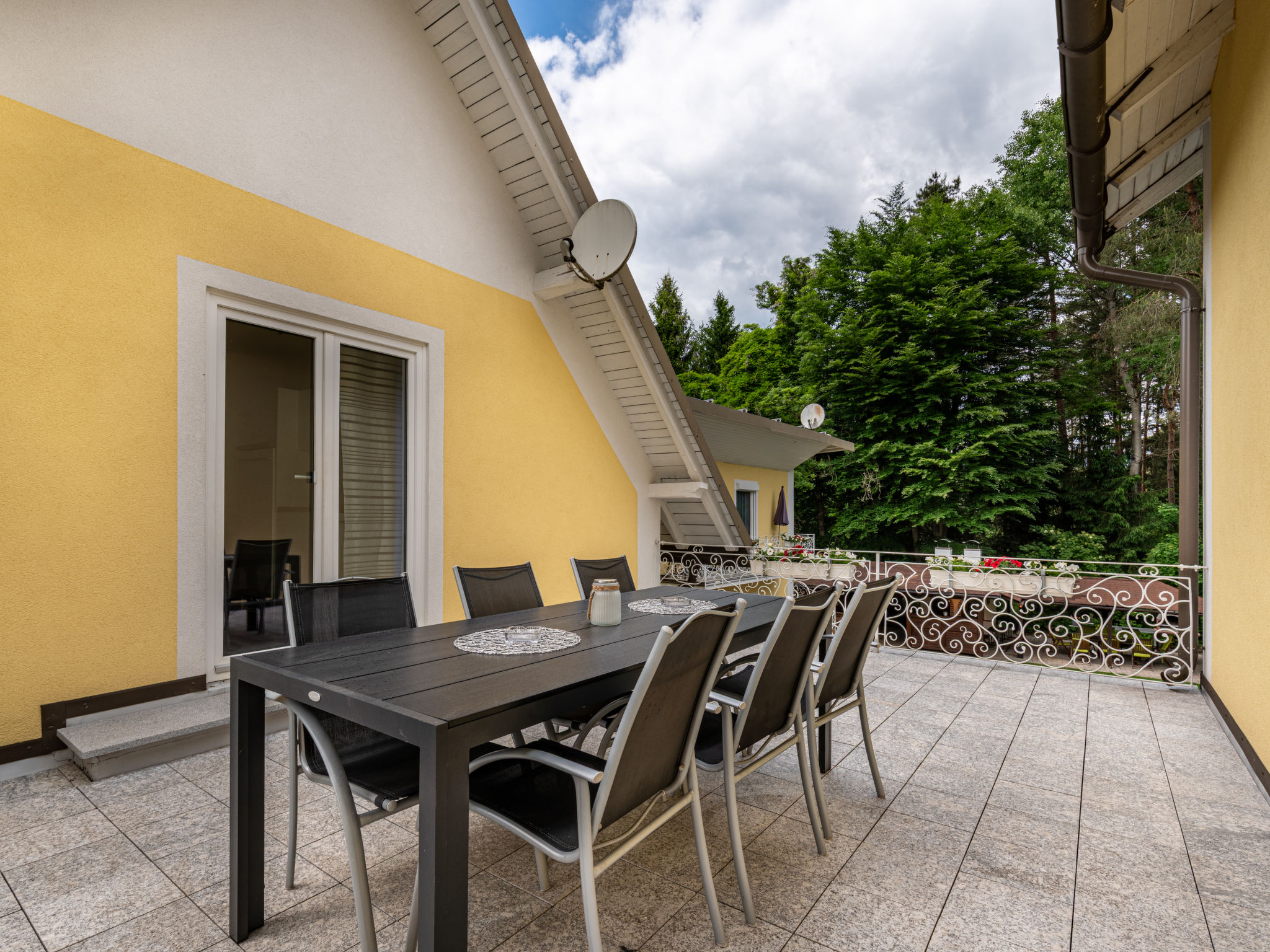 4-Zimmer-Wohnung 107 m2 im 1. Stock. Vollständig renoviert im Jahre 2017: Wohn-/Esszimmer mit Sat-TV (Flachbildschirm), Radio. Ausgang zur Terrasse. 2 Doppelzimmer, jedes Zimmer mit Waschbecken. Ausgang zum Balkon. 1 Zimmer mit 3 Betten. Offene Küche (4 Kochplatten, Backofen, Geschirrspüler, Mikrowelle). Bad/WC, sep. WC. Balkon, grosse Terrasse 30 m2. Terrassenmöbel. Zur Verfügung: Internet (Wireless LAN, gratis). Maximal 1 Haustier/Hund erlaubt. Die Wohnung verfügt über einen eigenen Eingang und ist teilweise abgeschrägt.