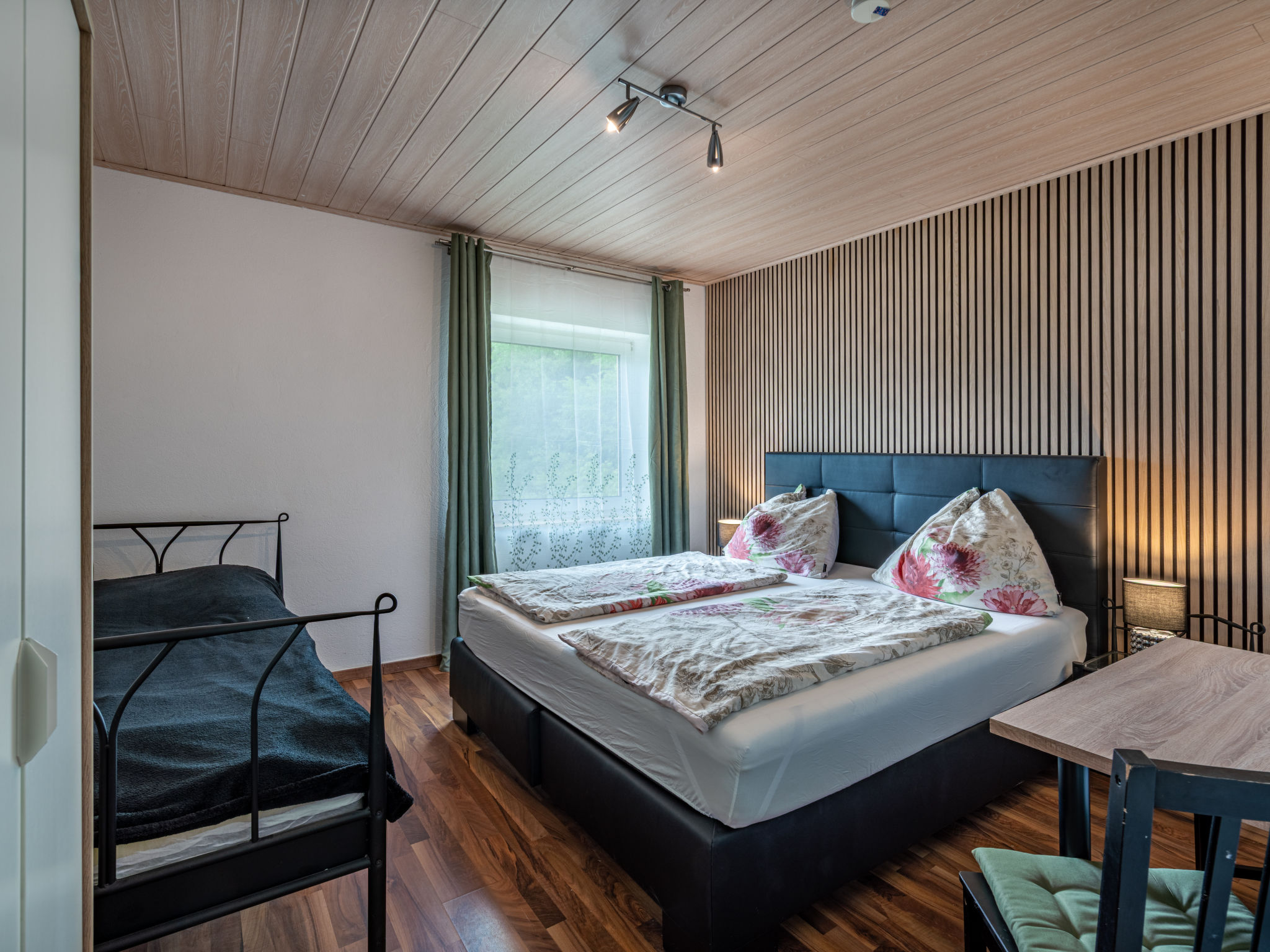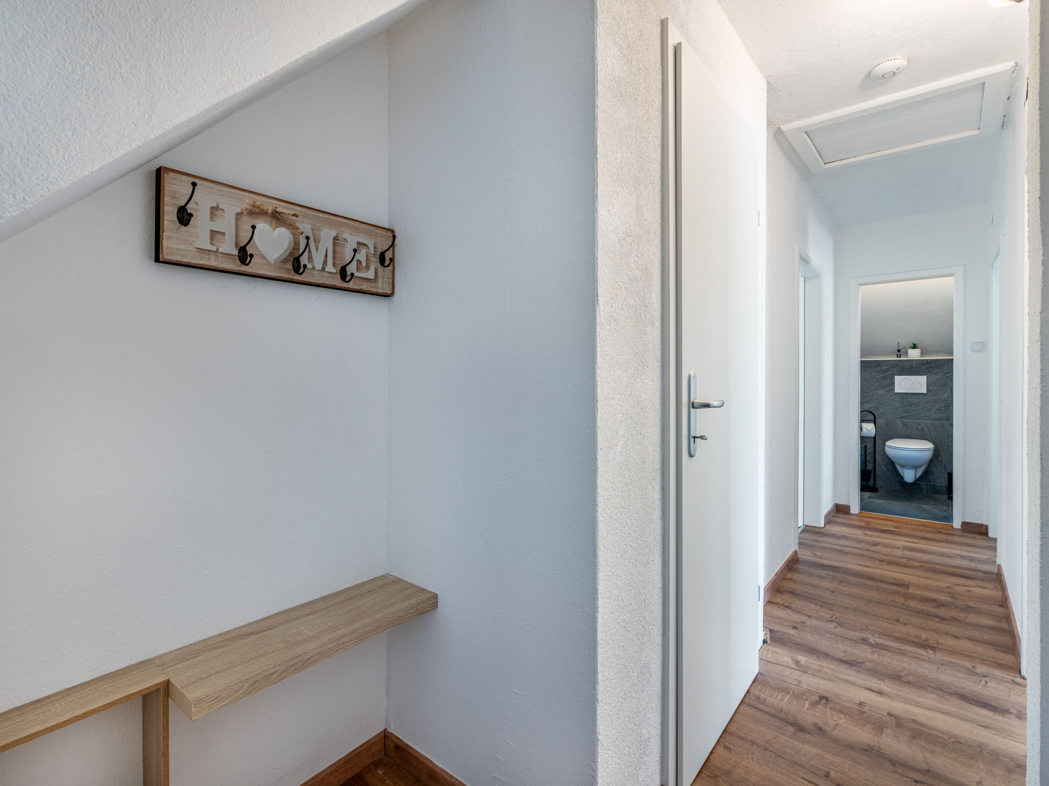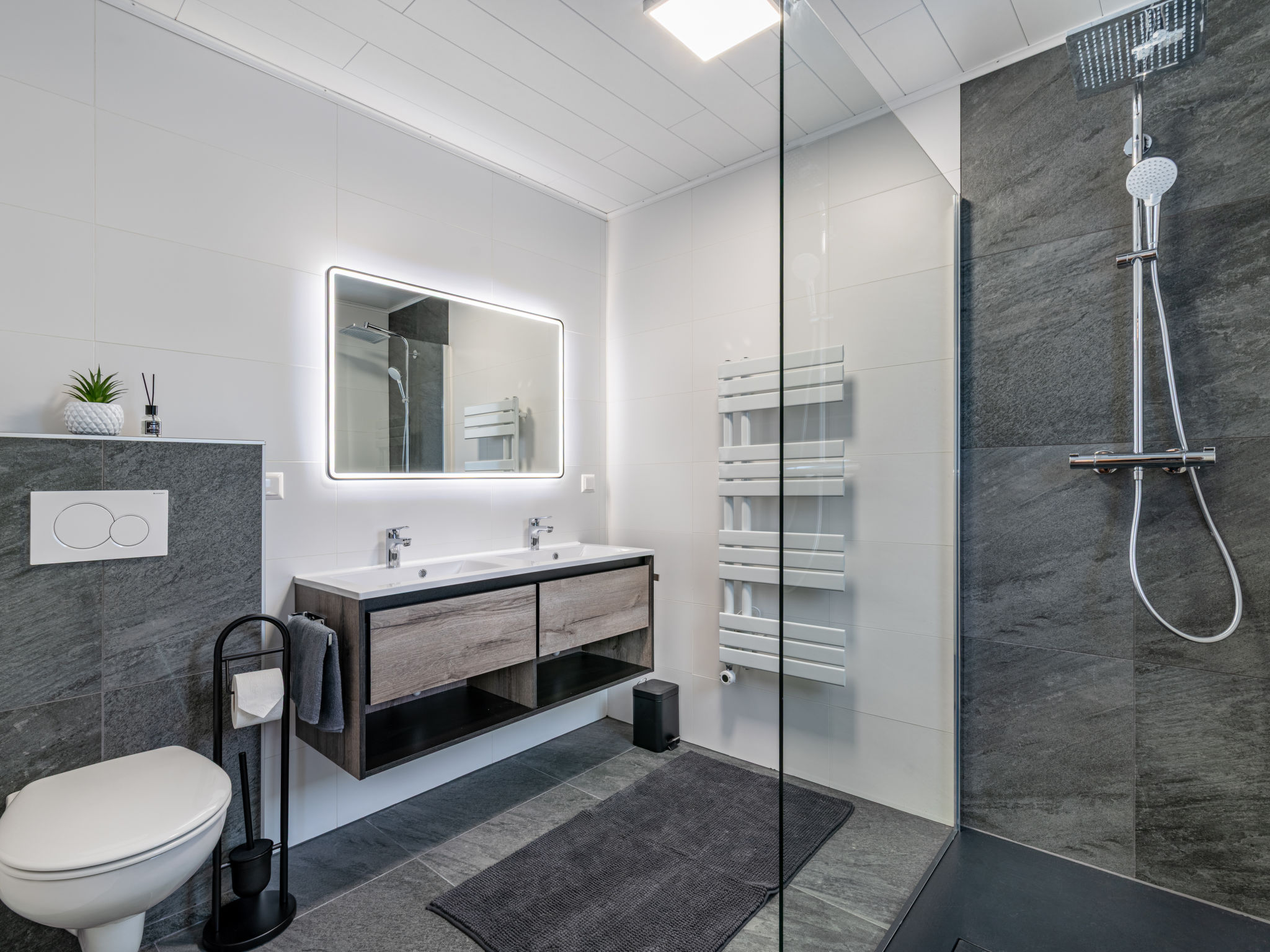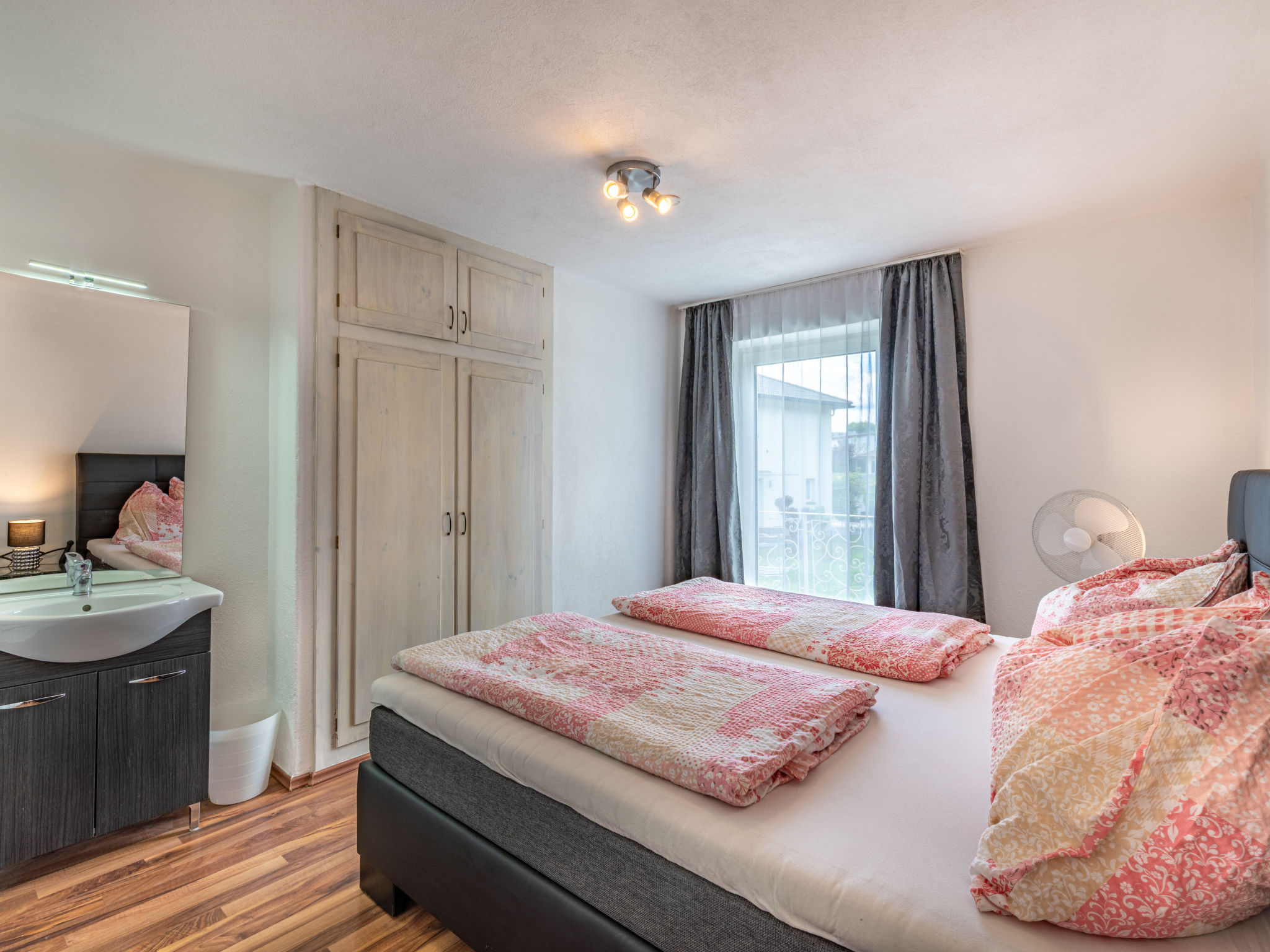 4-Zimmer-Wohnung 107 m2 im 1. Stock. Vollständig renoviert im Jahre 2017: Wohn-/Esszimmer mit Sat-TV (Flachbildschirm), Radio. Ausgang zur Terrasse. 2 Doppelzimmer, jedes Zimmer mit Waschbecken. Ausgang zum Balkon. 1 Zimmer mit 3 Betten. Offene Küche (4 Kochplatten, Backofen, Geschirrspüler, Mikrowelle). Bad/WC, sep. WC. Balkon, grosse Terrasse 30 m2. Terrassenmöbel. Zur Verfügung: Internet (Wireless LAN, gratis). Maximal 1 Haustier/Hund erlaubt. Die Wohnung verfügt über einen eigenen Eingang und ist teilweise abgeschrägt.