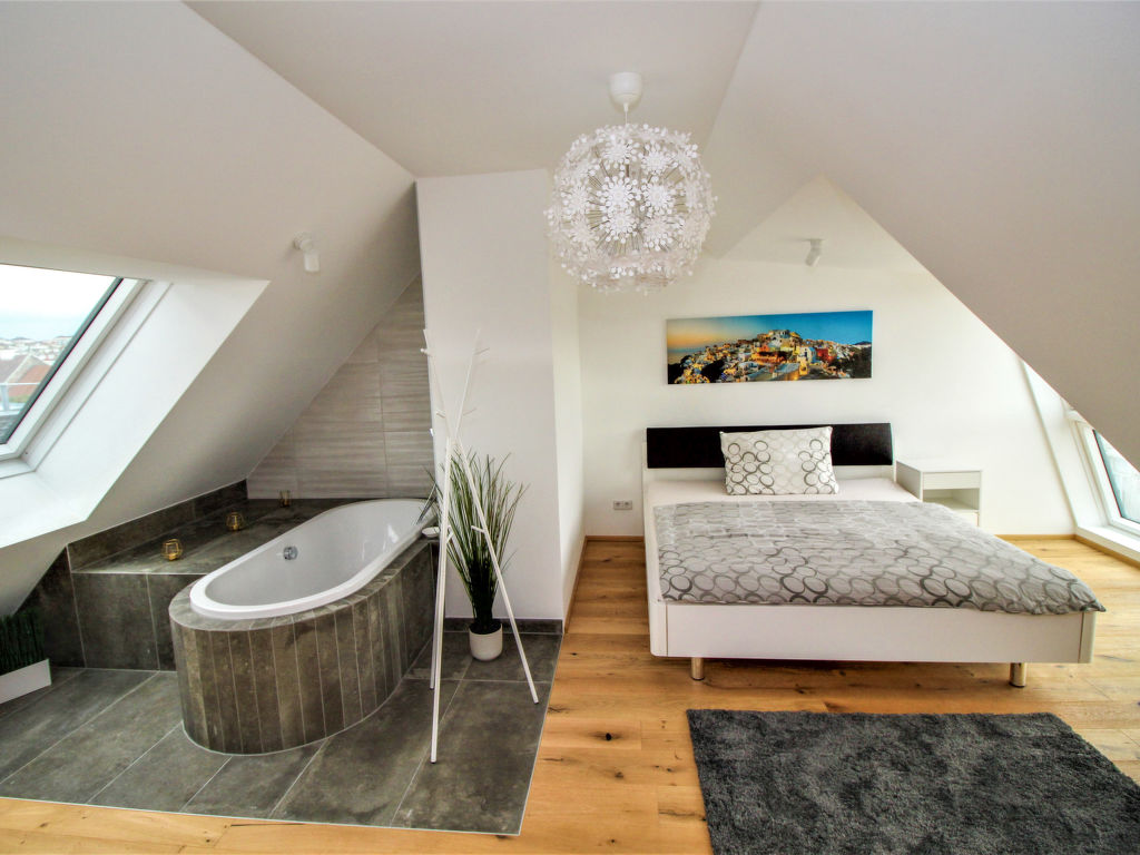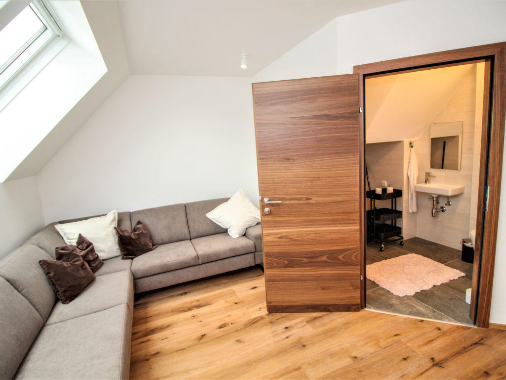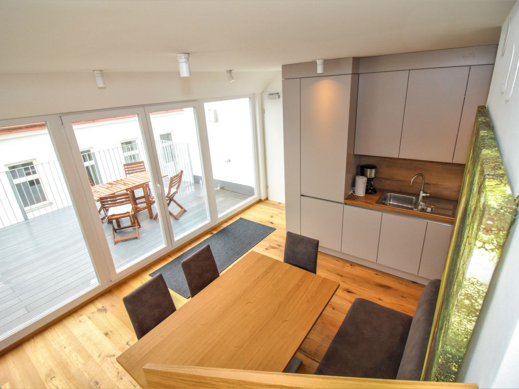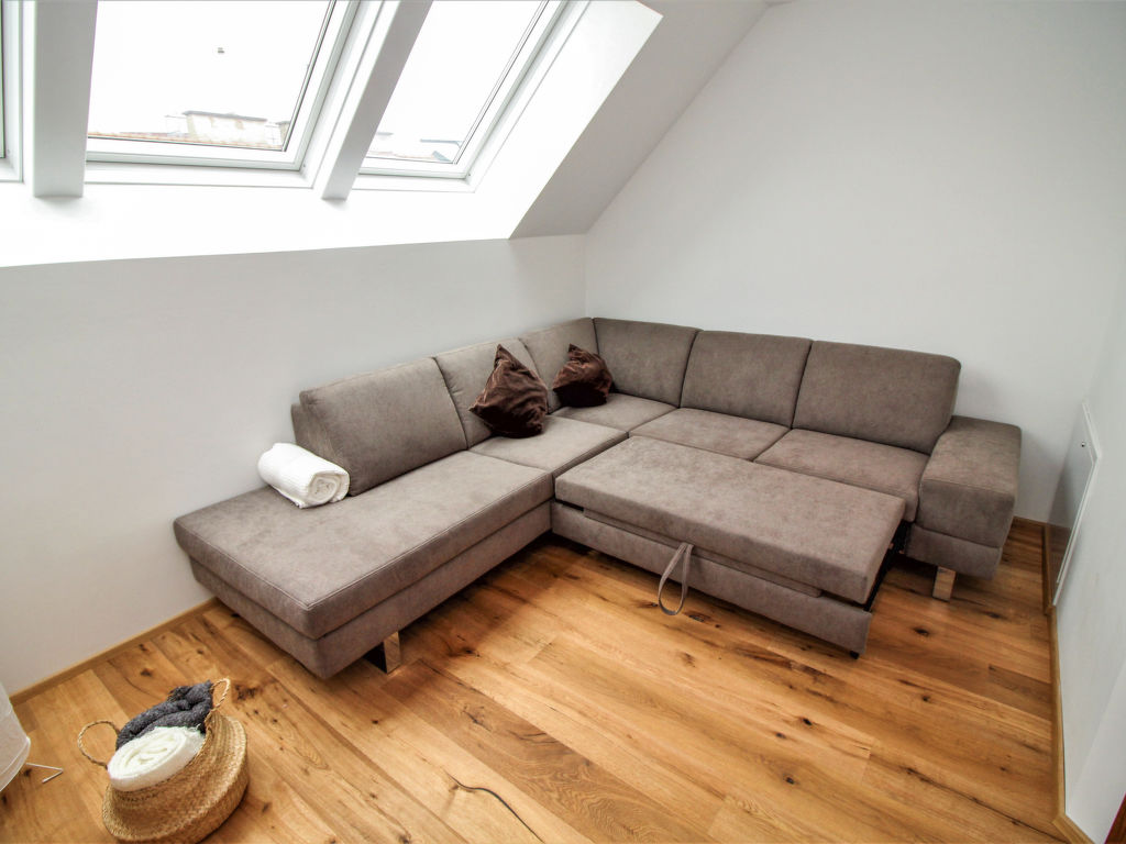 2-Zimmer-Dachterrassenwohnung 73 m2 auf 2 Stockwerken im 4. Stock. Geräumig und hell, vollständig renoviert im Jahre 2021, modern und geschmackvoll eingerichtet: Eingang. Abgeschrägtes, offenes Wohn-/Schlafzimmer mit 1 Doppeldiwanbett (180 cm, Länge 200 cm), sep. WC, Kabel-TV, Internationale TV-Sender und Klimaanlage. Offene Küche (Backofen, Geschirrspüler, 4 Glaskeramikherd Platten, Toaster, Wasserkocher, elektrische Kaffeemaschine) mit Esstisch. Ausgang zur Terrasse. Dusche/WC. Klimaanlage, Fussbodenheizung. Dachgeschoss: abgeschrägtes Wohn-/Schlafzimmer mit 1 Doppeldiwanbett (180 cm, Länge 200 cm), Sat-TV, Internationale TV-Sender und Klimaanlage mit Waschbecken und Sitzbad/WC. Terrasse 15 m2, Südlage. Terrassenmöbel (4), Sitzplatz. Schöne Fernsicht auf die Stadt. Zur Verfügung: Bügeleisen, Haartrockner. Internet (Wireless LAN, gratis). Bitte beachten: Nichtraucher-Unterkunft. Dachgeschoss aber dennoch kühl (Kühlung über Fußbodenheizung).