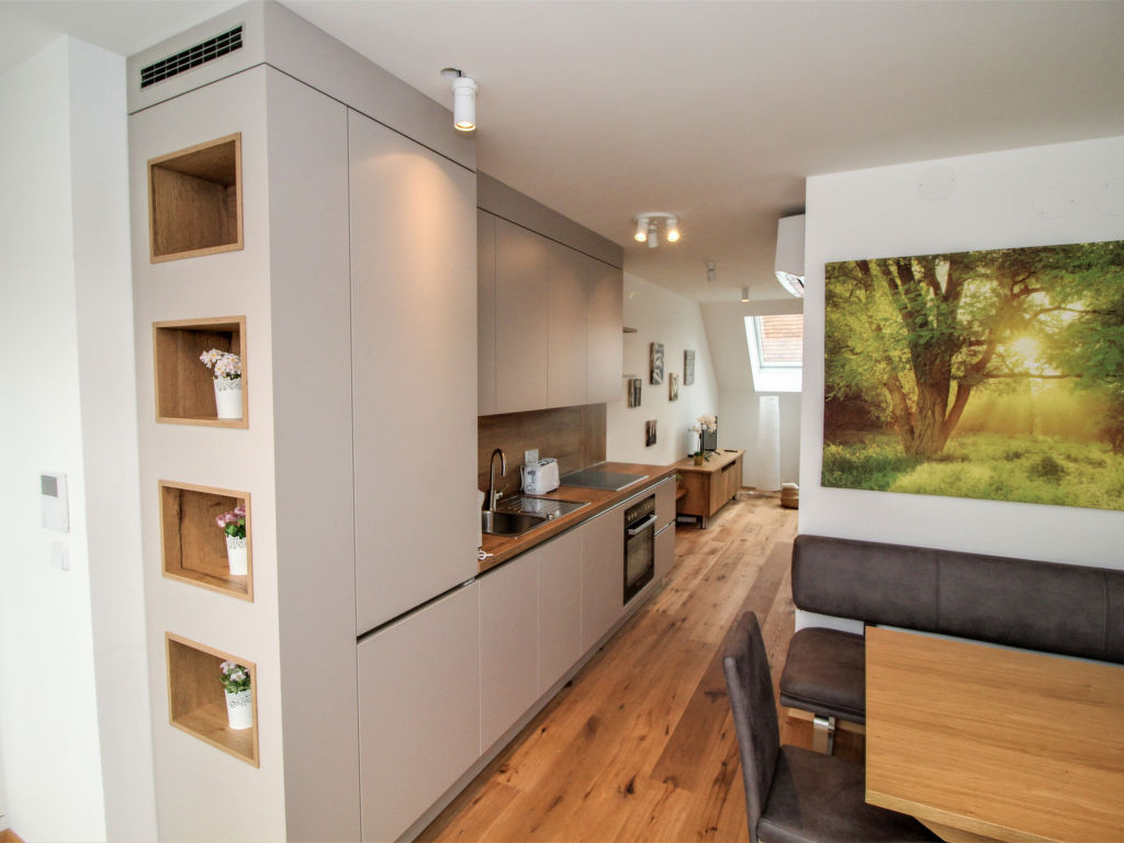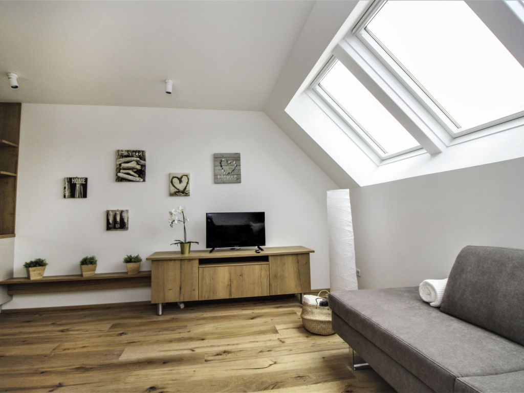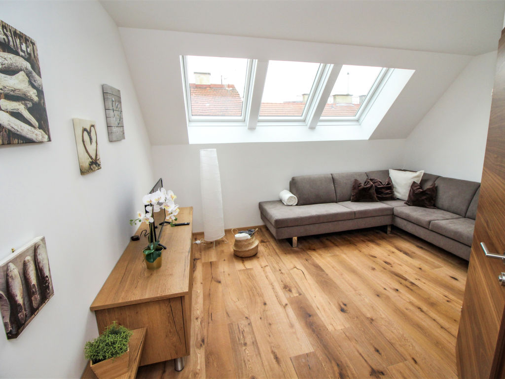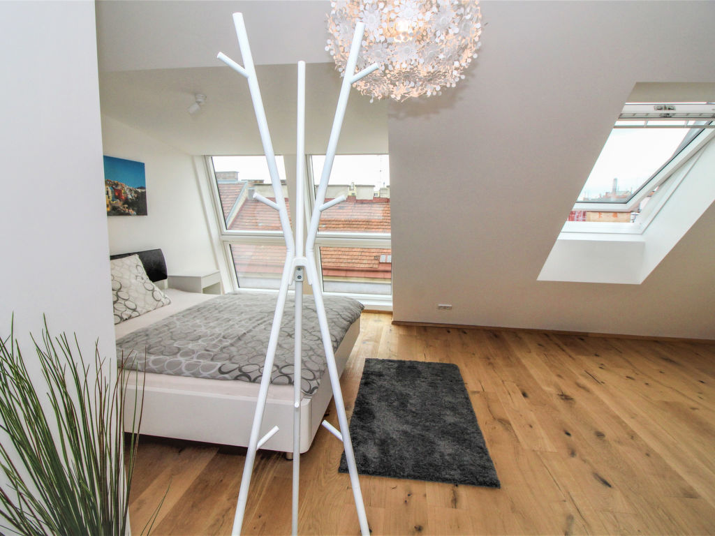 2-Zimmer-Dachterrassenwohnung 73 m2 auf 2 Stockwerken im 4. Stock. Geräumig und hell, vollständig renoviert im Jahre 2021, modern und geschmackvoll eingerichtet: Eingang. Abgeschrägtes, offenes Wohn-/Schlafzimmer mit 1 Doppeldiwanbett (180 cm, Länge 200 cm), sep. WC, Kabel-TV, Internationale TV-Sender und Klimaanlage. Offene Küche (Backofen, Geschirrspüler, 4 Glaskeramikherd Platten, Toaster, Wasserkocher, elektrische Kaffeemaschine) mit Esstisch. Ausgang zur Terrasse. Dusche/WC. Klimaanlage, Fussbodenheizung. Dachgeschoss: abgeschrägtes Wohn-/Schlafzimmer mit 1 Doppeldiwanbett (180 cm, Länge 200 cm), Sat-TV, Internationale TV-Sender und Klimaanlage mit Waschbecken und Sitzbad/WC. Terrasse 15 m2, Südlage. Terrassenmöbel (4), Sitzplatz. Schöne Fernsicht auf die Stadt. Zur Verfügung: Bügeleisen, Haartrockner. Internet (Wireless LAN, gratis). Bitte beachten: Nichtraucher-Unterkunft. Dachgeschoss aber dennoch kühl (Kühlung über Fußbodenheizung).