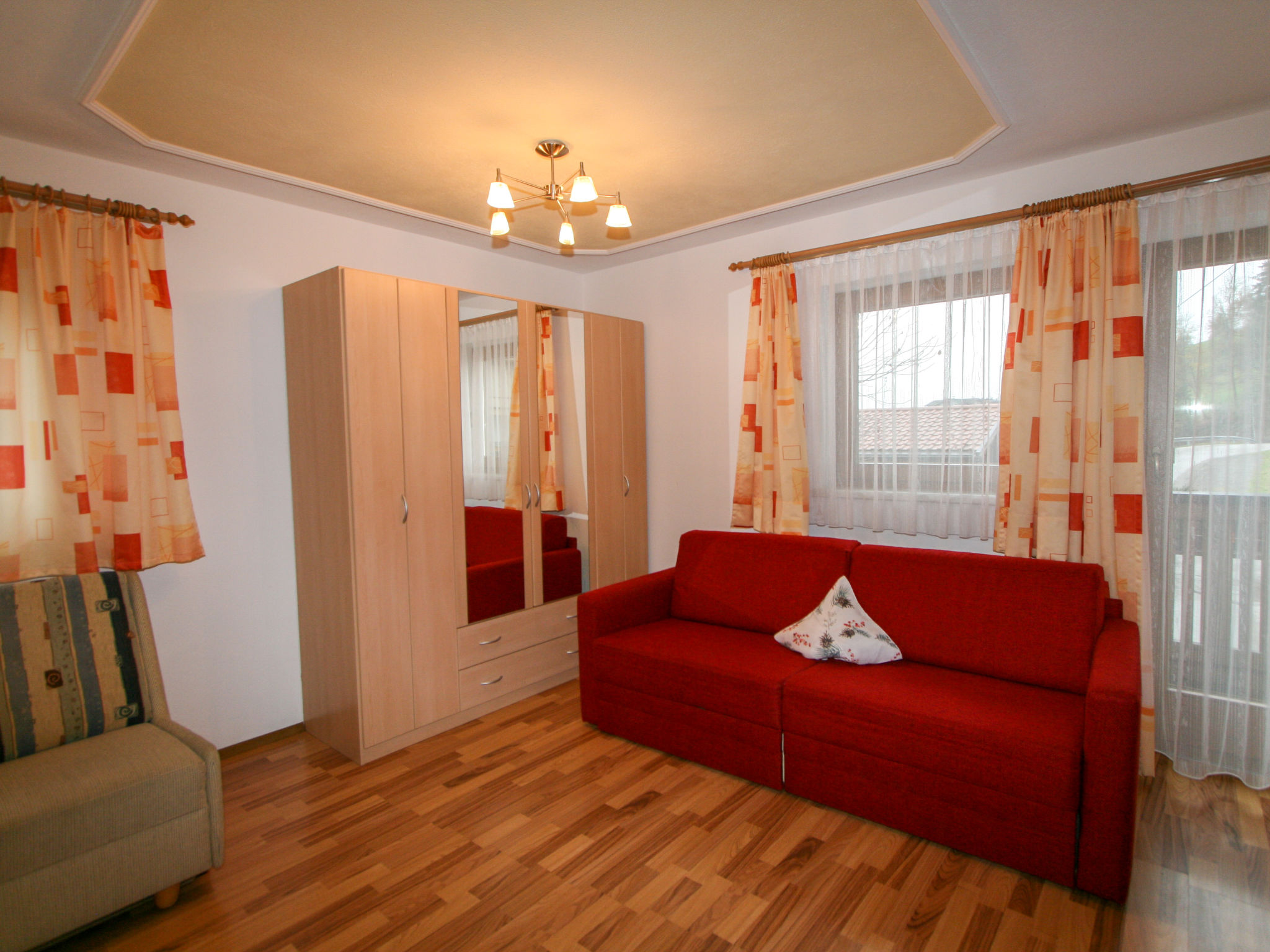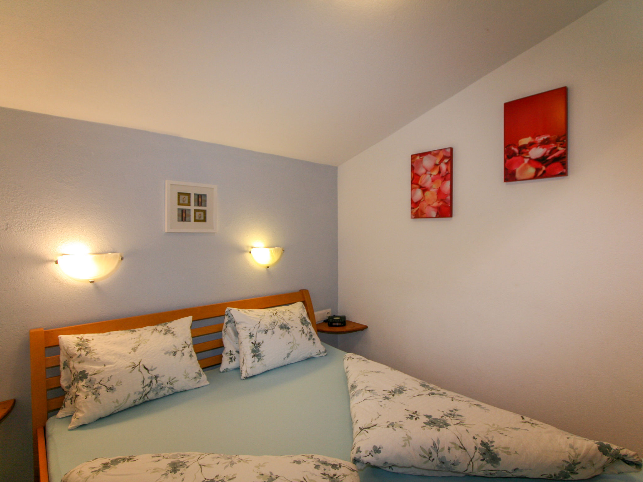 2-Zimmer-Haus, 1. Etage, ca. 50 m². Zugang über Außentreppe ins Obergeschoss: Wohn-/Schlafraum mit Doppelbettcouch, Zustellbett, Küchenzeile (4 Platten, Backofen, Geschirrspüler, Kühlschrank, Kaffeemaschine, Wasserkocher, Toaster), Essplatz (Eckbank) und Balkonausgang. Doppelzimmer. Abstellraum. Dusche/WC.