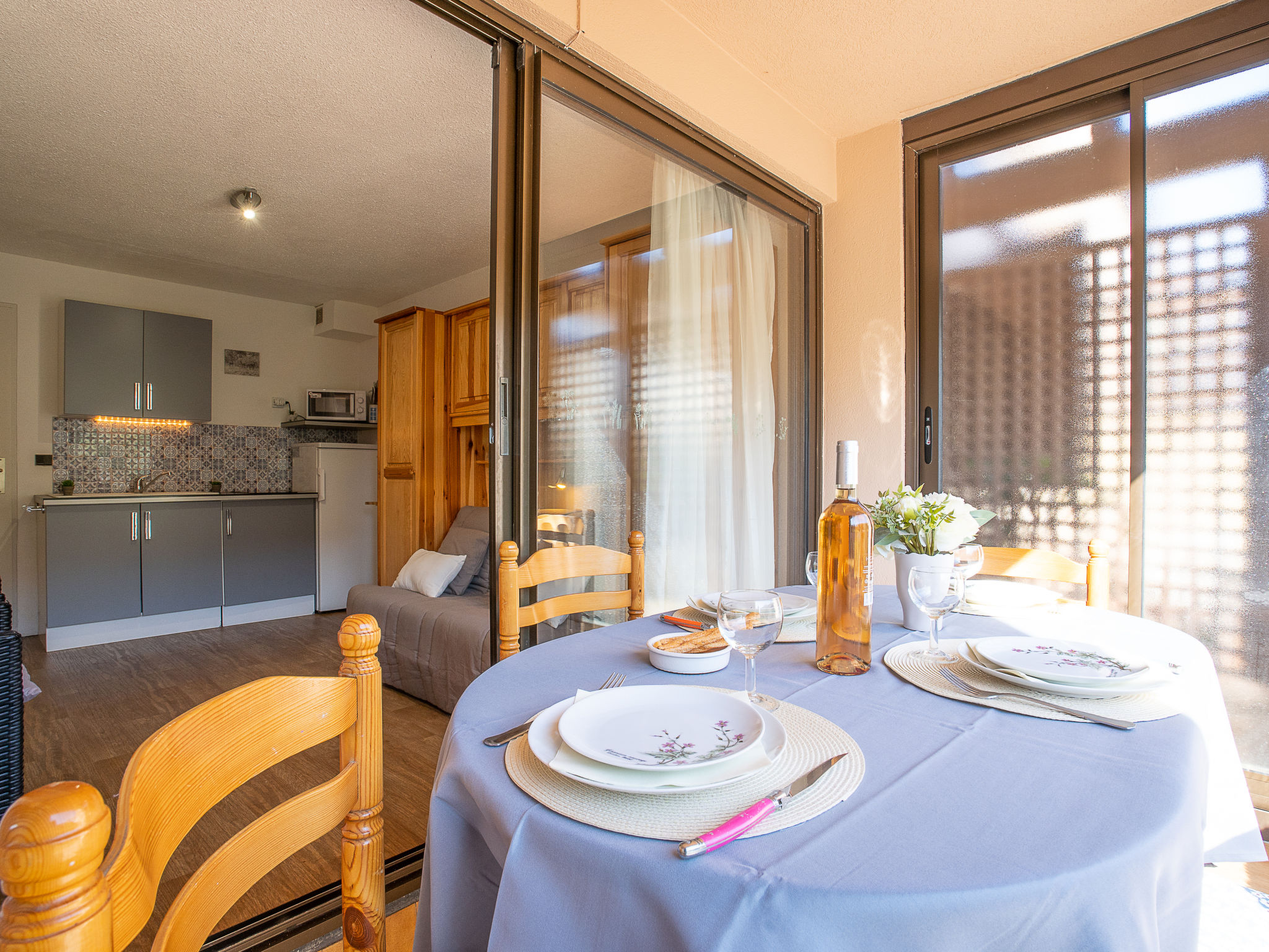 1-Zimmer-Studio 25 m2, im Erdgeschoss. Zweckmässig eingerichtet: Wohn-/Esszimmer mit 1 Doppeldiwanbett (140 cm, Länge 190 cm), TV (Flachbildschirm). Ausgang zur Terrasse. Schlafnische mit 1 x 2 Etagenbetten (80 cm, Länge 190 cm). Kochnische (2 Kochplatten, Mikrowelle, elektrische Kaffeemaschine). Dusche/WC. Terrasse überdacht. Zur Verfügung: Internet (Wireless LAN, extra). Parkplatz. Bitte beachten: Nichtraucher-Haus. Rauchmelder. Inserat einer Privatperson nach Artikel 155, IV, CGI.