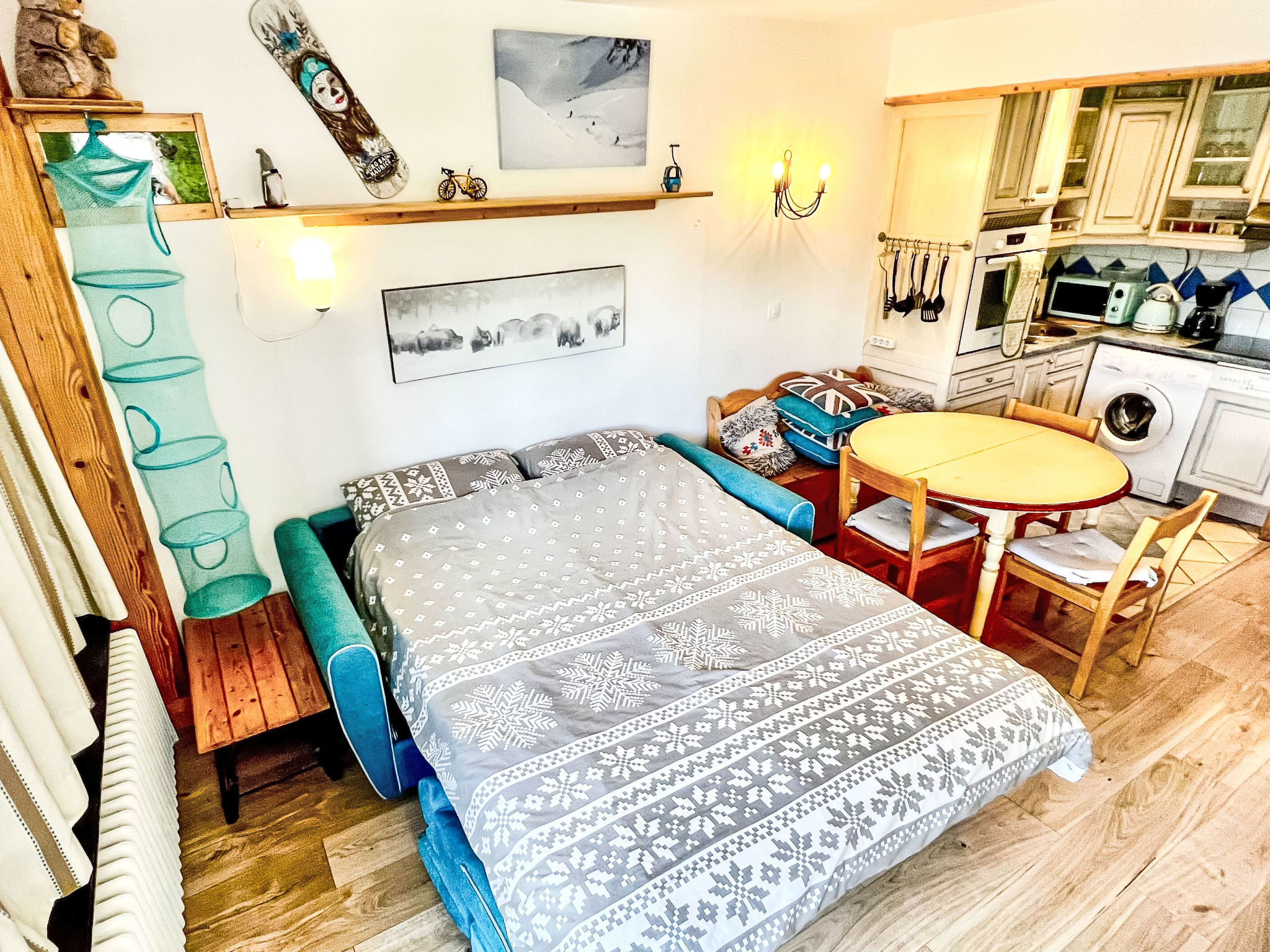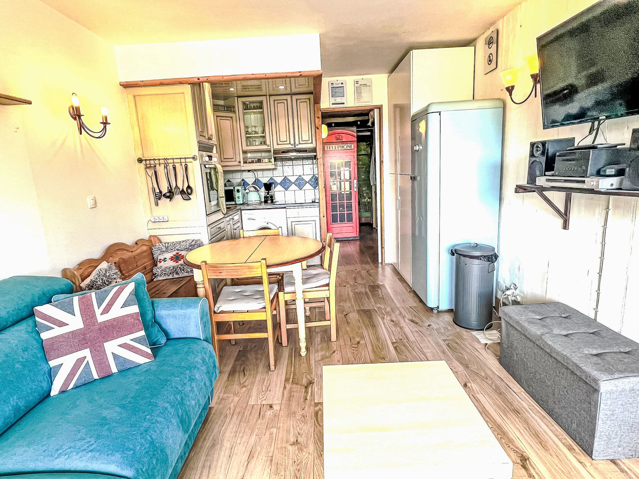 1-Zimmer-Studio 28 m2 im 1. Stock. Hell, vollständig renoviert: Wohn-/Esszimmer mit 1 franz. Bett (140 cm), 1 Klappbett (120 cm), TV (Flachbildschirm), Stereoanlage und DVD. Ausgang zum Balkon. Eingang mit 1 x 2 Etagenbetten (80 cm). Offene Küche (Backofen, Geschirrspüler, 4 Glaskeramikherd Platten, Mikrowelle, elektrische Kaffeemaschine). Bad, sep. WC. Nordostlage. Sehr schöne Panoramasicht auf den See und die Berge. Zur Verfügung: Waschmaschine. Internet (Wireless LAN, gratis). Bitte beachten: geeignet für Familien. Kühlschrank ohne Gefrierfach, Nichtraucher-Unterkunft. Rauchmelder. HIFI-System mit MP3-Player und großem 220-Liter-Kühlschrank. ACHTUNG: Das Doppelbett ist ein Zwischengeschoss. Inserat einer Privatperson nach Artikel 155, IV, CGI.