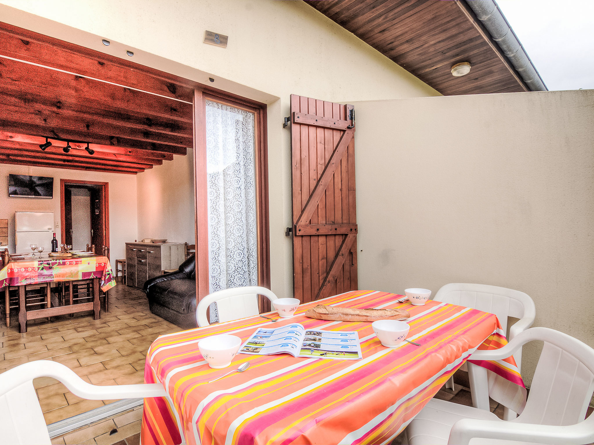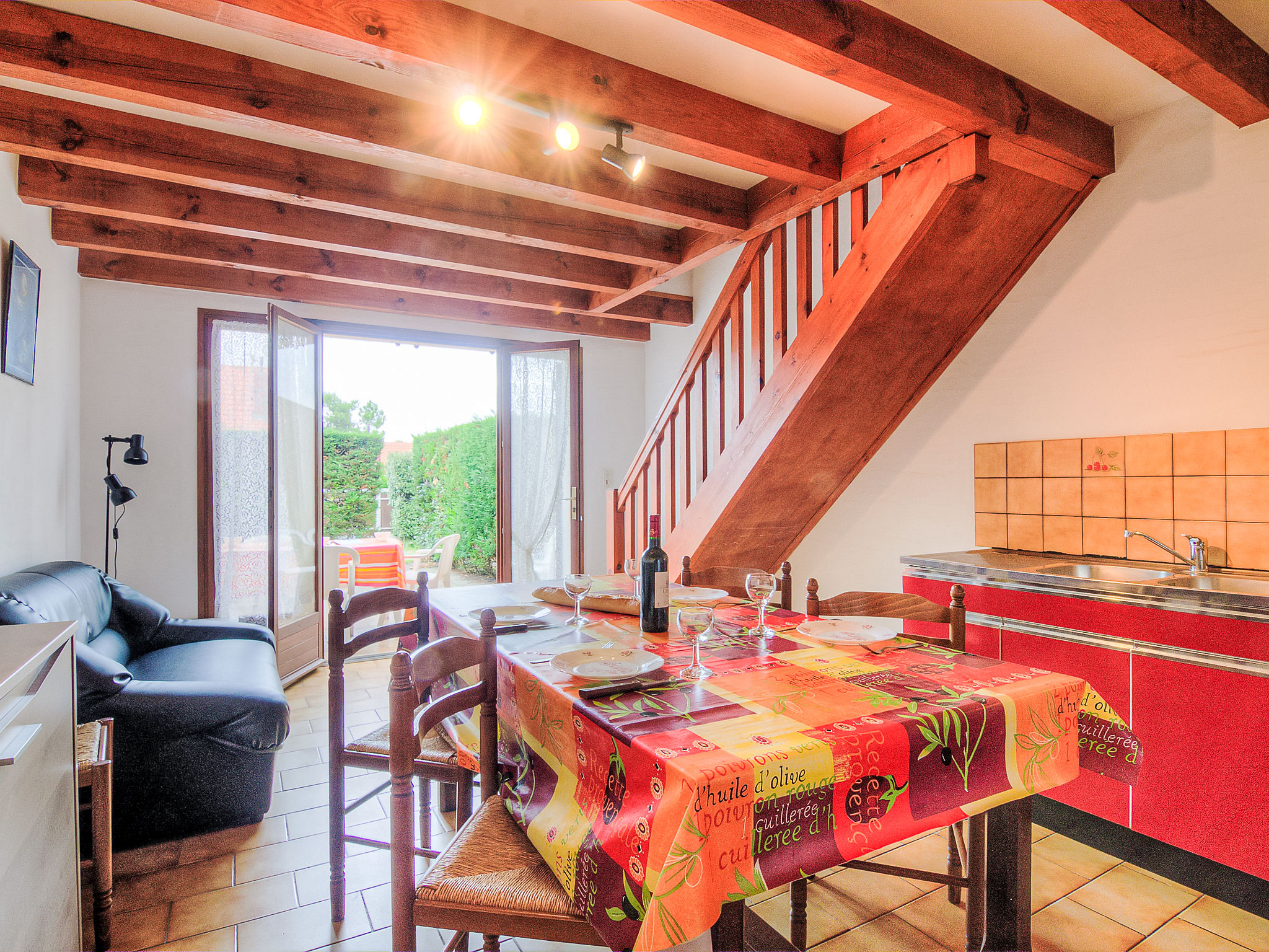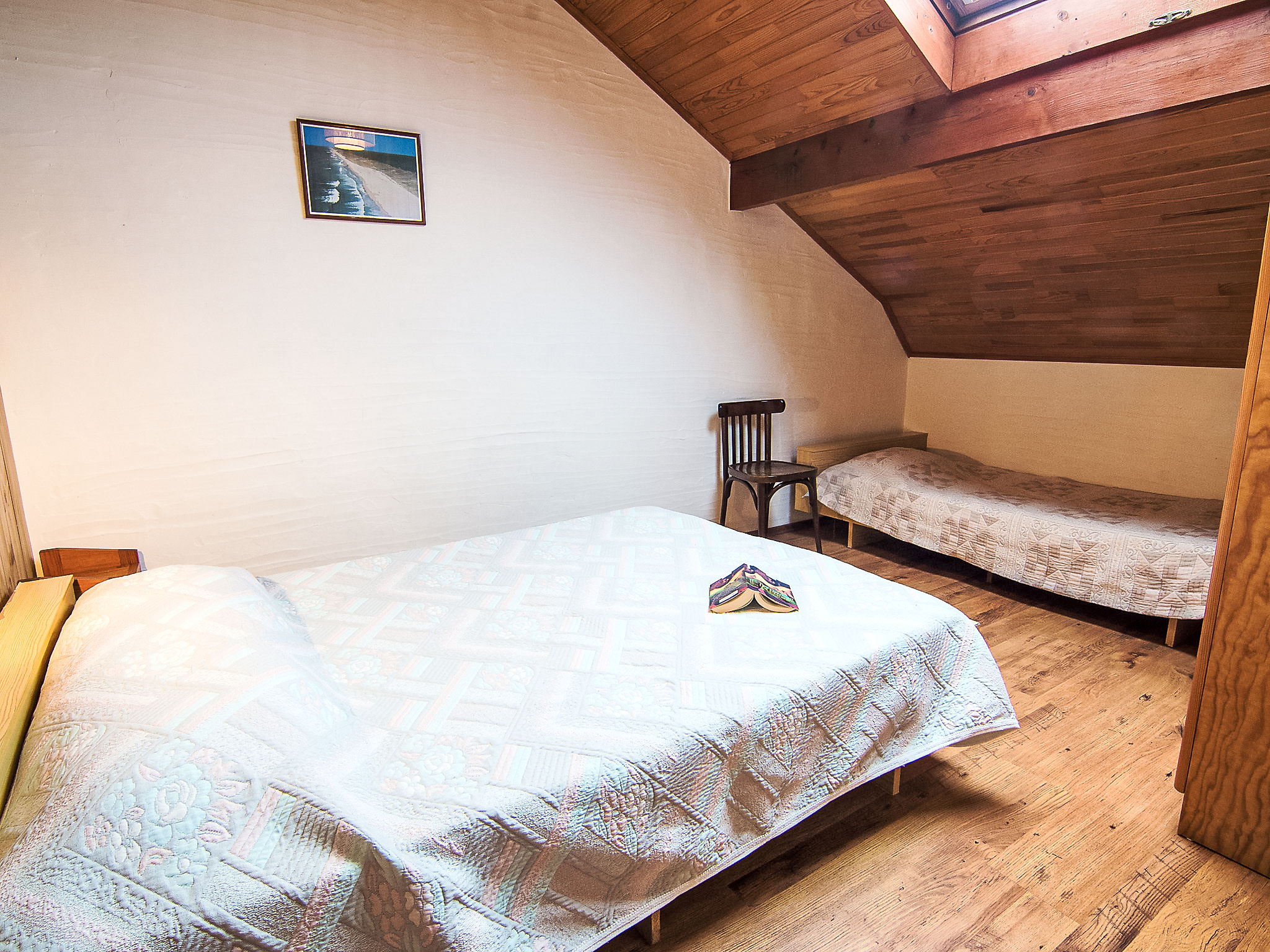 3-Zimmer-Reihenhaus 50 m2 auf 2 Stockwerken. Wohn-/Esszimmer mit TV und Internationale TV-Sender (Flachbildschirm). Ausgang zur Terrasse. Kochnische (4 Kochplatten, Mini-Backofen, Mikrowelle). Dusche, sep. WC. Obergeschoss: 1 abgeschrägtes Zimmer mit 2 Betten (90 cm, Länge 190 cm). 1 abgeschrägtes Zimmer mit 1 Bett (90 cm, Länge 190 cm), 1 franz. Bett (1 x 140 cm, Länge 190 cm). Terrasse. Terrassenmöbel, Liegestühle (1). Zur Verfügung: Internet (Wireless LAN, gratis). Bitte beachten: Maximal 1 Haustier/Hund erlaubt. Rauchmelder. Inserat einer Privatperson nach Artikel 155, IV, CGI.