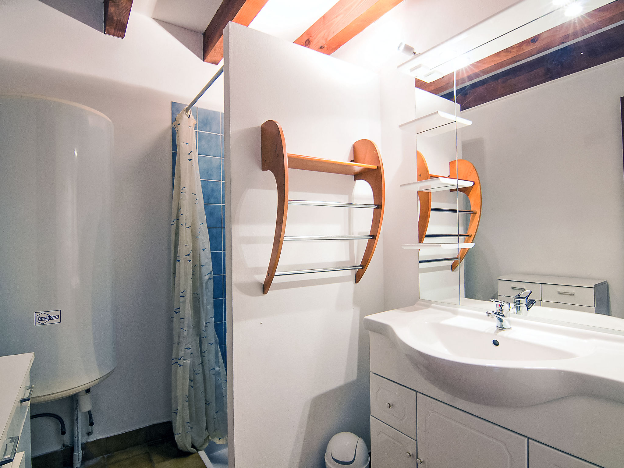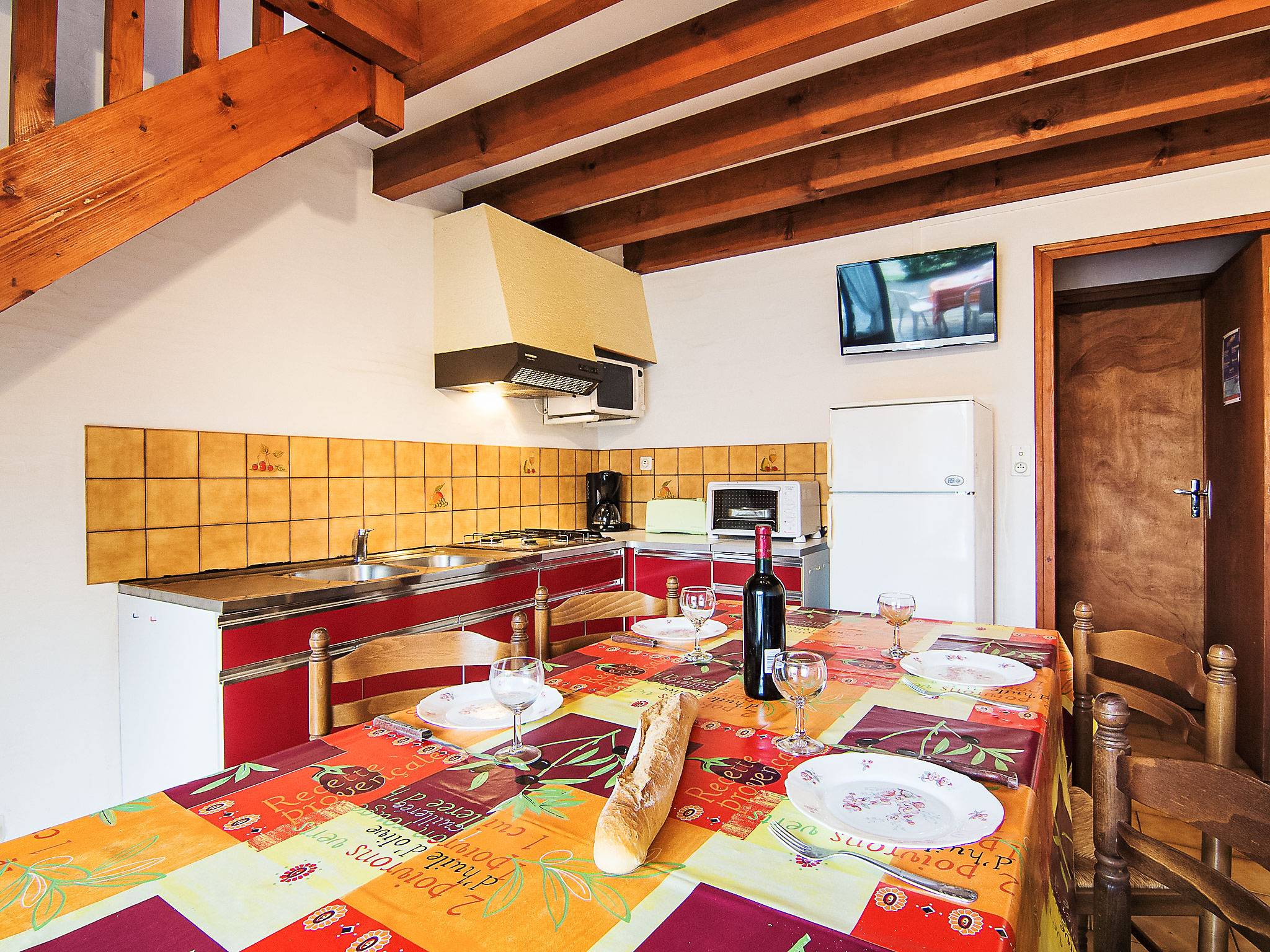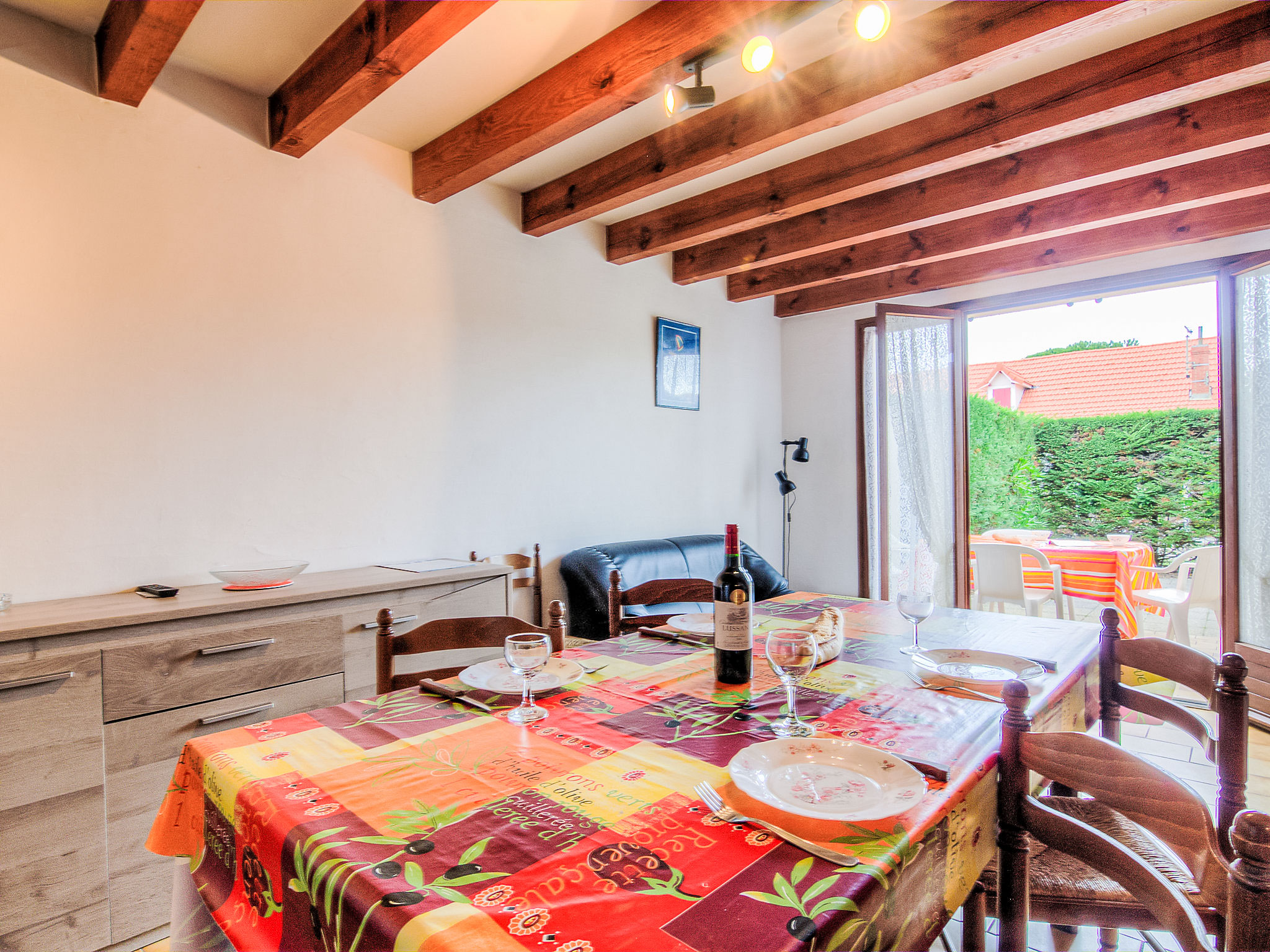 3-Zimmer-Reihenhaus 50 m2 auf 2 Stockwerken. Wohn-/Esszimmer mit TV und Internationale TV-Sender (Flachbildschirm). Ausgang zur Terrasse. Kochnische (4 Kochplatten, Mini-Backofen, Mikrowelle). Dusche, sep. WC. Obergeschoss: 1 abgeschrägtes Zimmer mit 2 Betten (90 cm, Länge 190 cm). 1 abgeschrägtes Zimmer mit 1 Bett (90 cm, Länge 190 cm), 1 franz. Bett (1 x 140 cm, Länge 190 cm). Terrasse. Terrassenmöbel, Liegestühle (1). Zur Verfügung: Internet (Wireless LAN, gratis). Bitte beachten: Maximal 1 Haustier/Hund erlaubt. Rauchmelder. Inserat einer Privatperson nach Artikel 155, IV, CGI.
