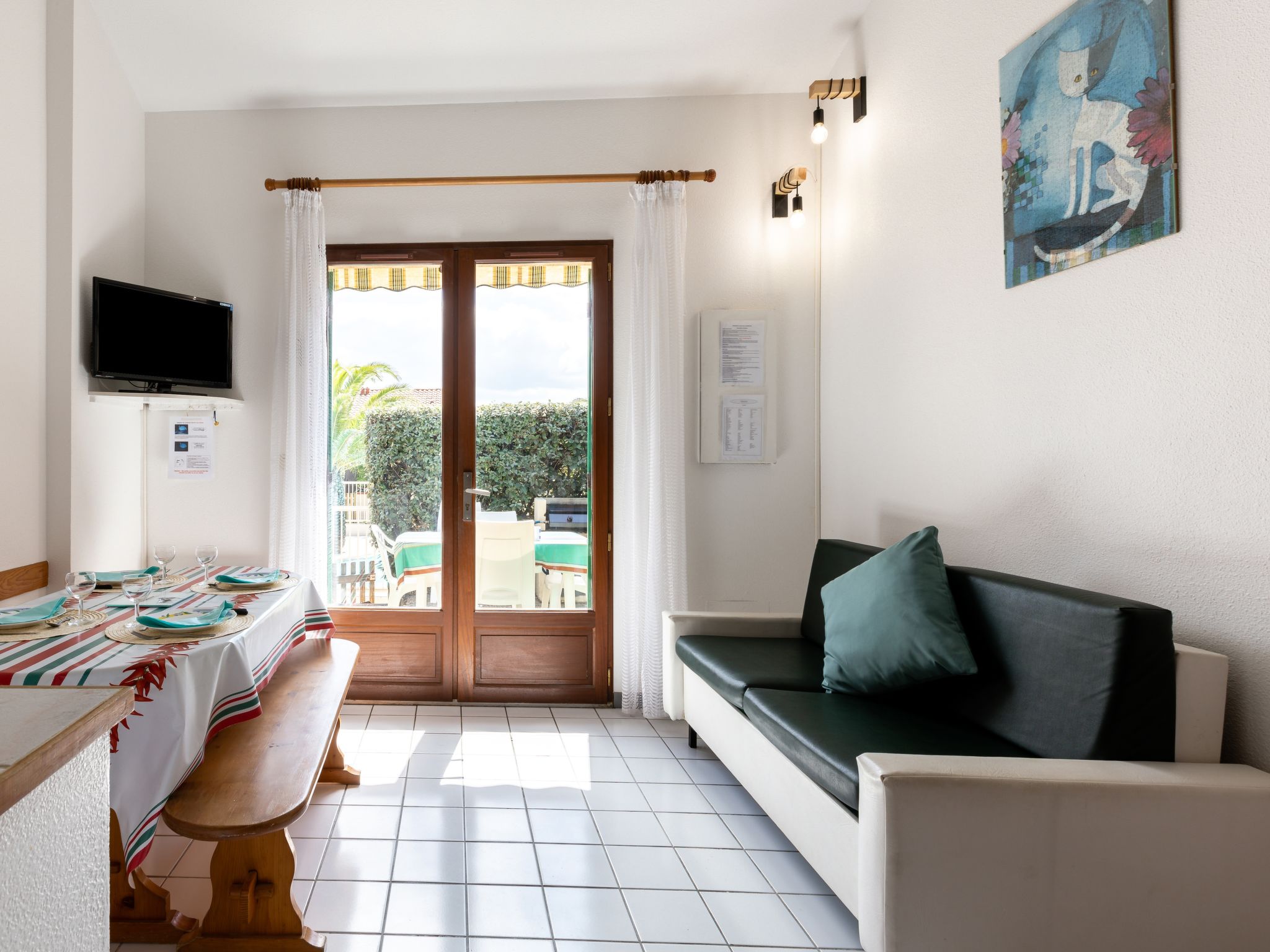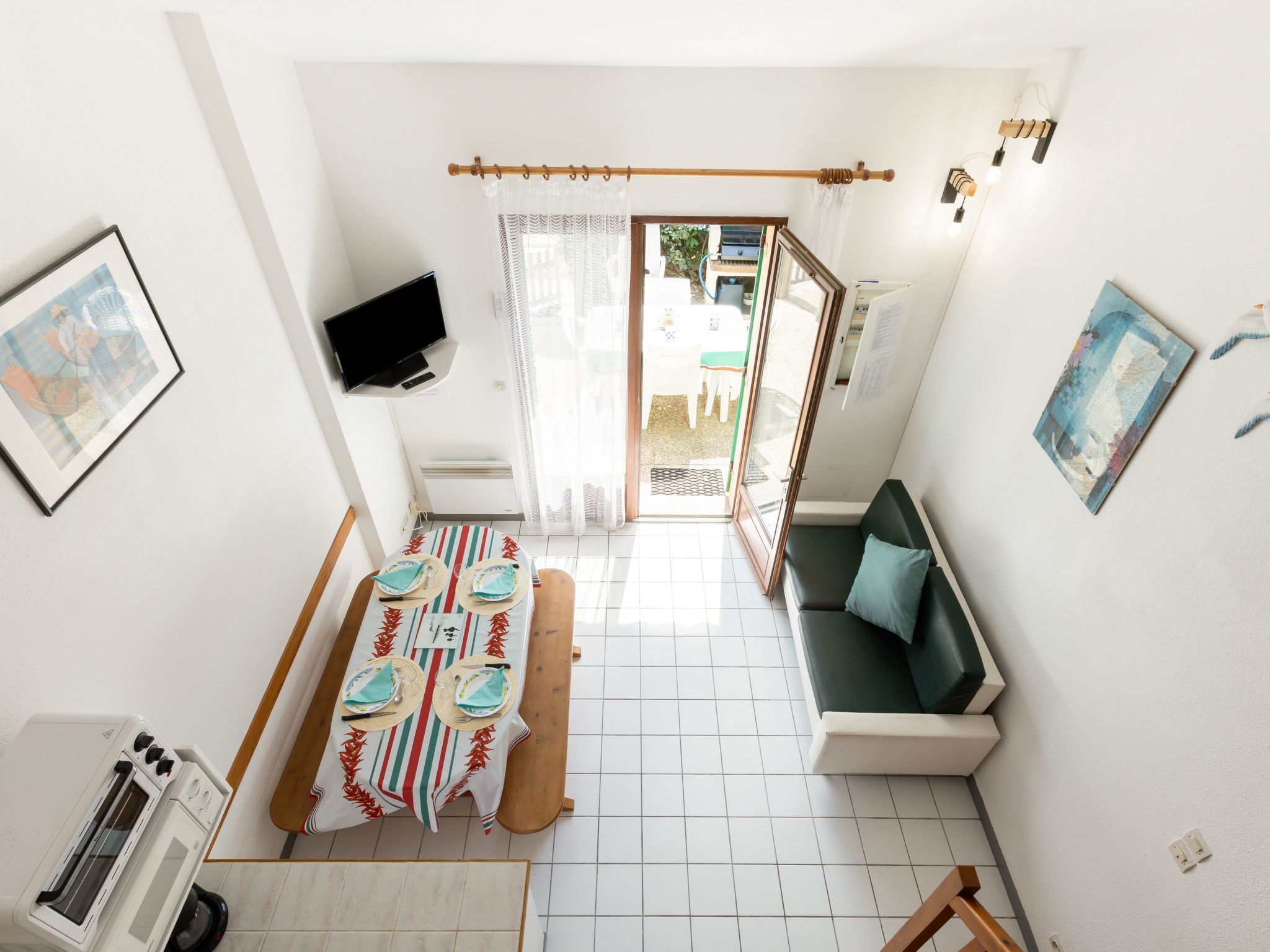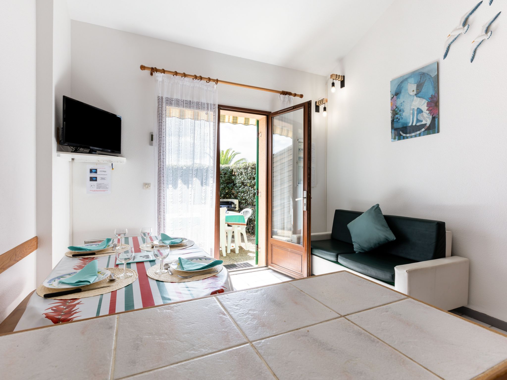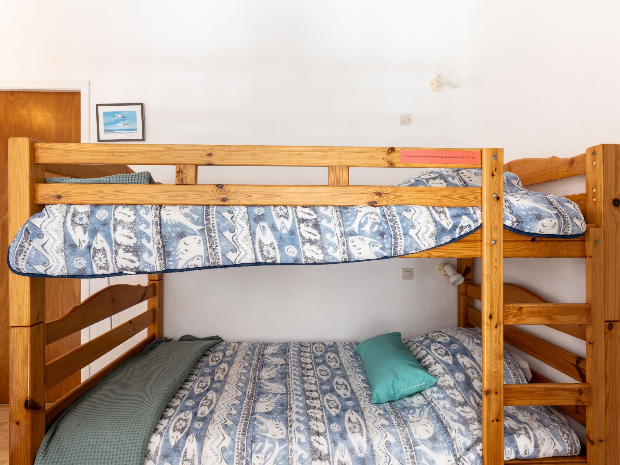 2-Zimmer-Reihenhaus 32 m2 auf 2 Stockwerken. Wohnzimmer mit TV. Ausgang zur Terrasse. 1 Zimmer mit 1 franz. Bett (140 cm, Länge 190 cm). Kochnische (2 Kochplatten, Mini-Backofen, Geschirrspüler, Mikrowelle). Bad, sep. WC. Obergeschoss: Galerie mit 1 x 2 Etagenbetten. Zur Verfügung: Internet (Wireless LAN, extra). Bitte beachten: Rauchmelder. Inserat einer Privatperson nach Artikel 155, IV, CGI. 40065000129IR
