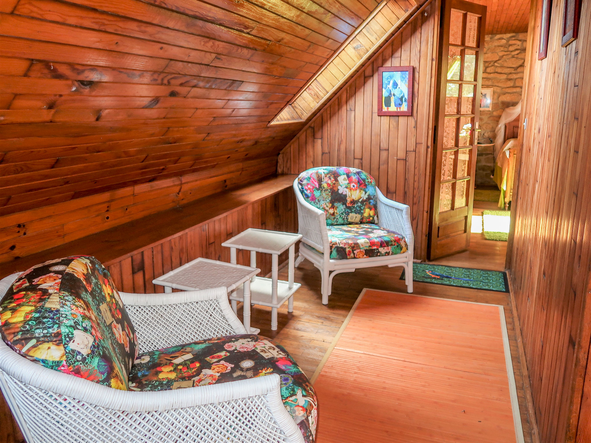 4-Zimmer-Haus, 2 Etagen, ca. 160 m². Erdgeschoss: Wohnraum mit Sitzgruppe, Kamin (nur Dekoration), Essplatz und Gartenausgang. Zum Wohnraum offene, durch Theke abgeteilte Kochecke (4 Flammen, Backofen, Mikrowelle, Kühl-/Gefrierkombination, Kaffeemaschine, Wasserkocher, Toaster) mit 2 Barhockern. Bad/Dusche/Doppelwaschbecken. Sep.WC. Vom Wohnraum schmale Wendeltreppe ins Obergeschoss (Dachschräge): 2 Schlafzimmer mit franz. Bett. Schlafzimmer mit franz. Bett (1,60 m breit). Sep.WC. Inserat einer Privatperson nach Artikel 155, IV, CGI.