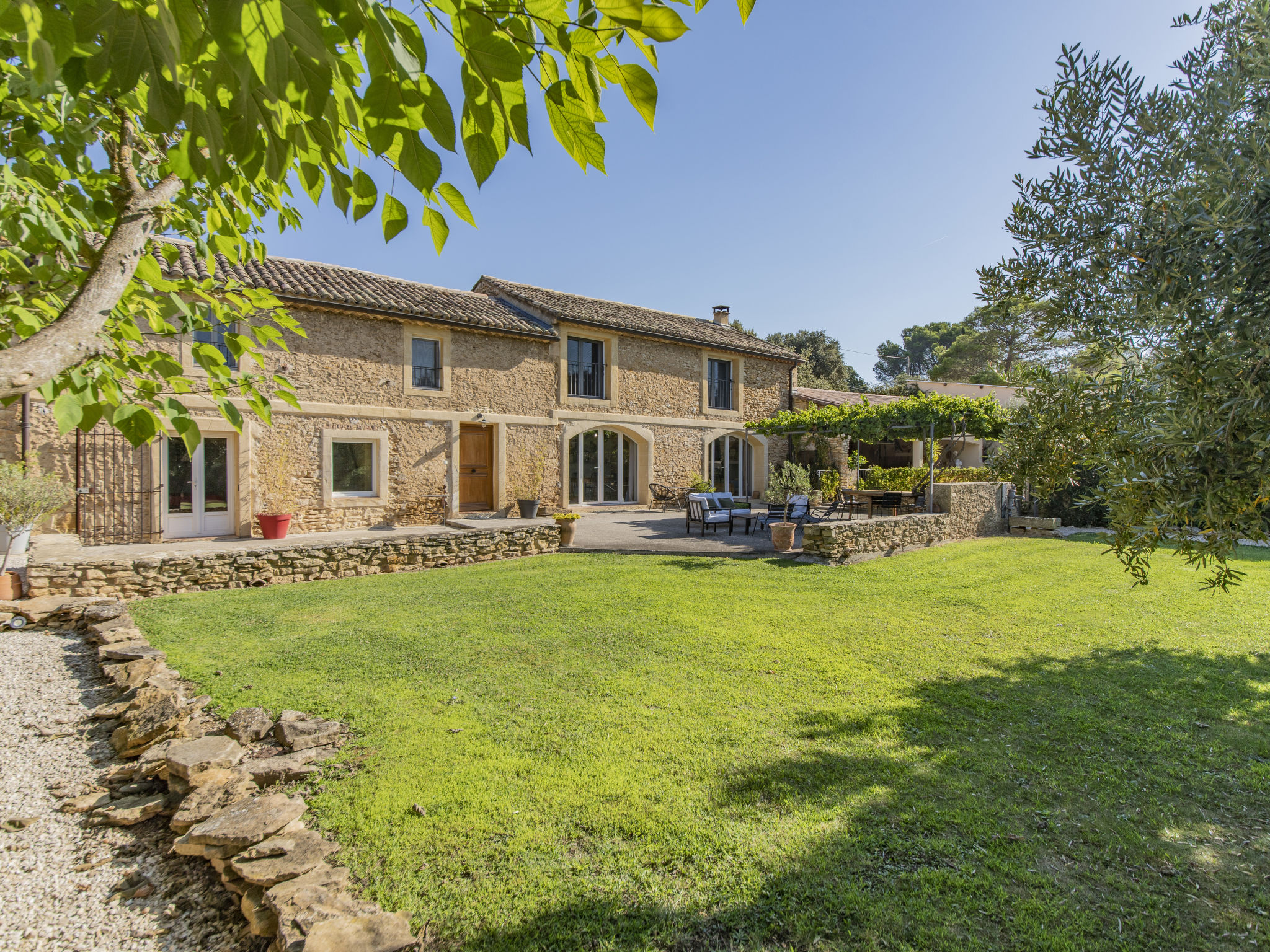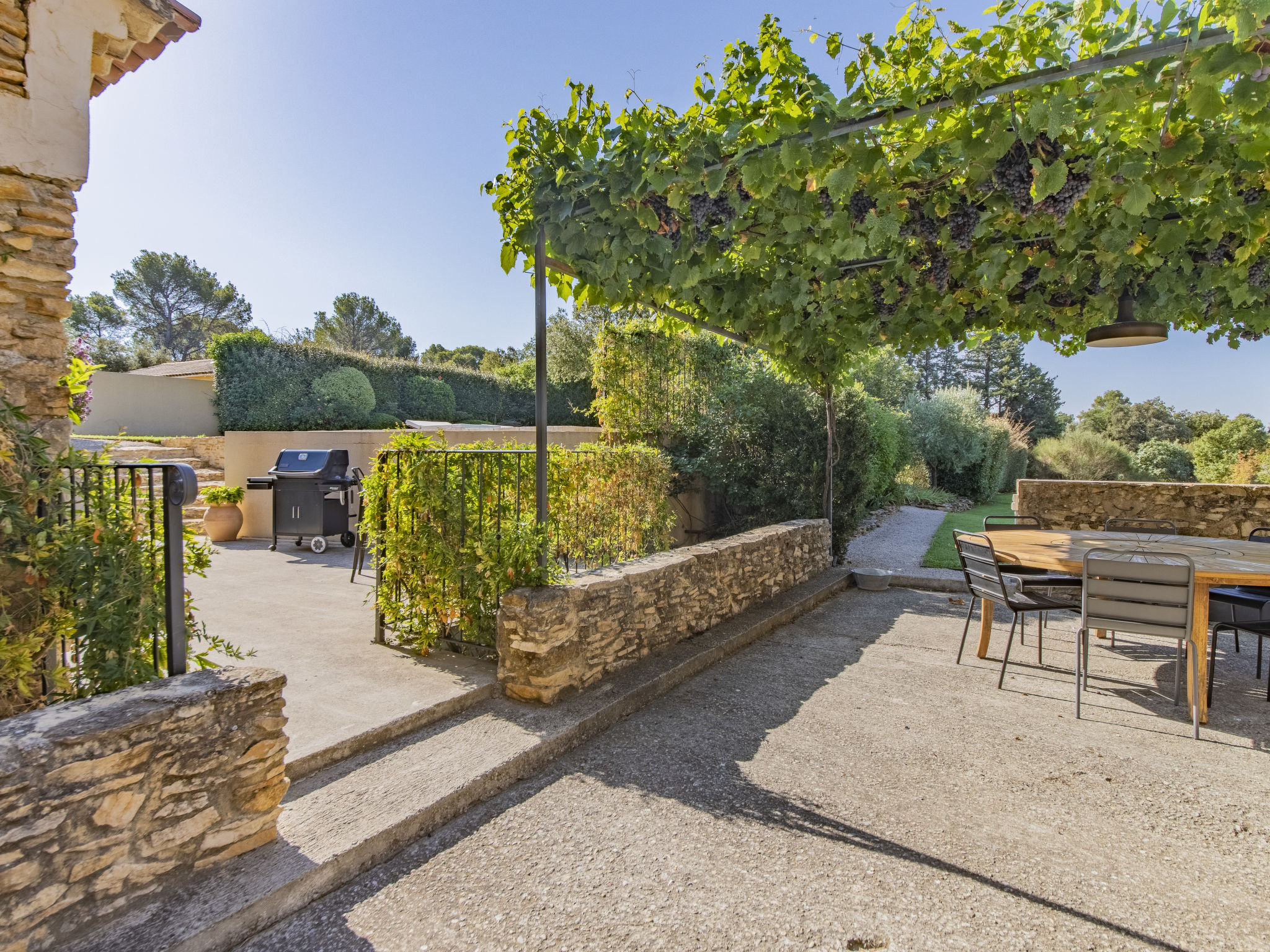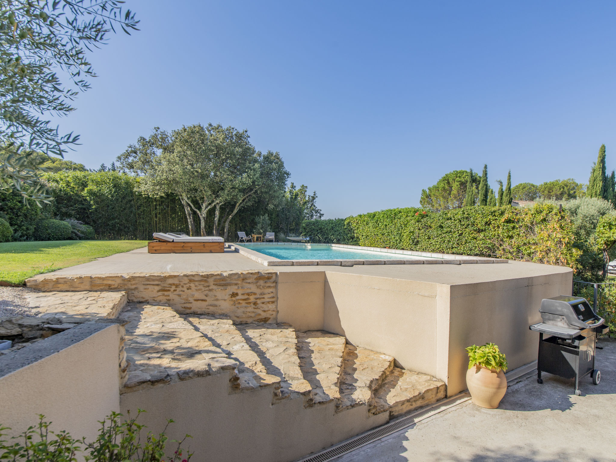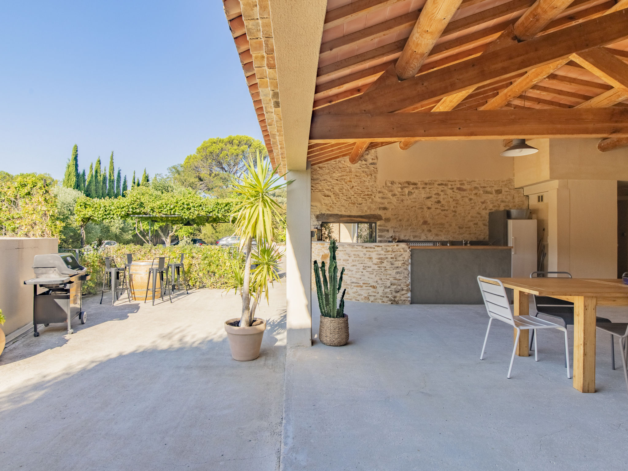 Mas/Landhaus "des Buis", renoviert im Jahre 2016. Im Ort, 1.5 km vom Zentrum von Uchaux. Zur Alleinbenutzung: Grundstück 4'500 m2 (eingezäunt), Schwimmbad (10 x 5 m, 140 - 140 cm tief, 01.06.-30.09.). Parkplatz auf dem Grundstück. Einkaufsgeschäft 1.5 km, Supermarkt 5 km, Restaurant 500 m, Bäckerei 150 m. Nahe gelegene Sehenswürdigkeiten: Orange 8 km, Vaison la Romaine 32 km, Avignon 41 km, Mont Ventoux 62 km. Bitte beachten: Fahrzeug empfohlen. Geeignet für Familien. Pool-Haus von 80m² mit kompletter Sommerküche (Kühlschrank, Kochplatten, Grill) und WC.
