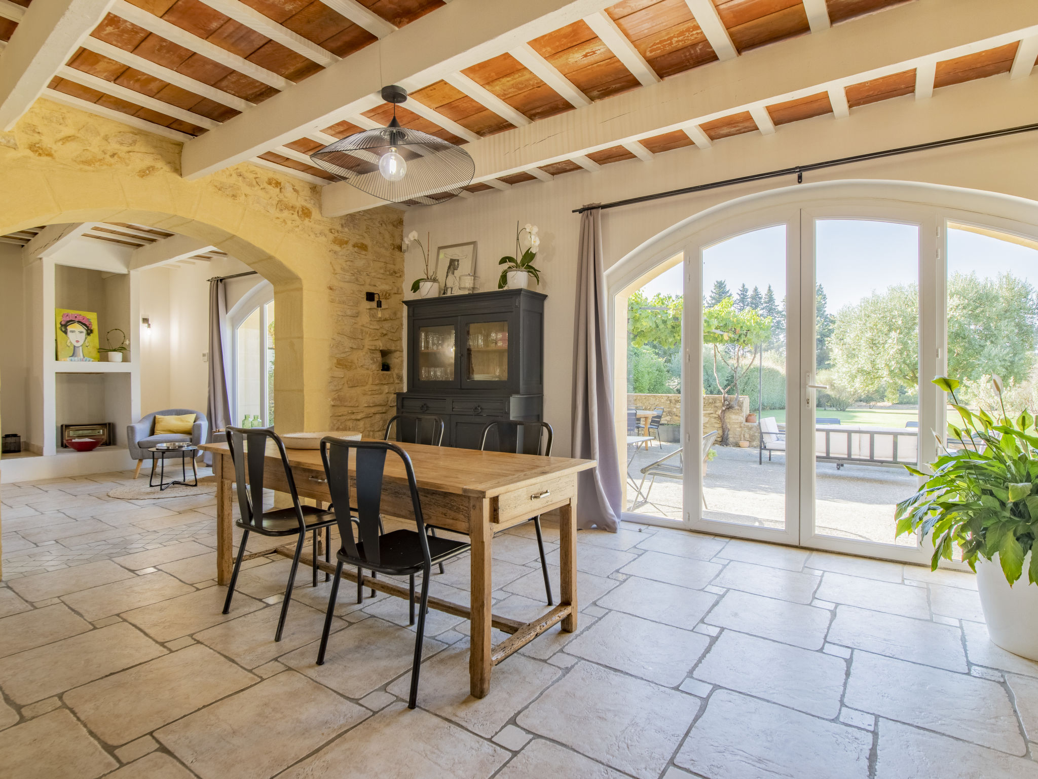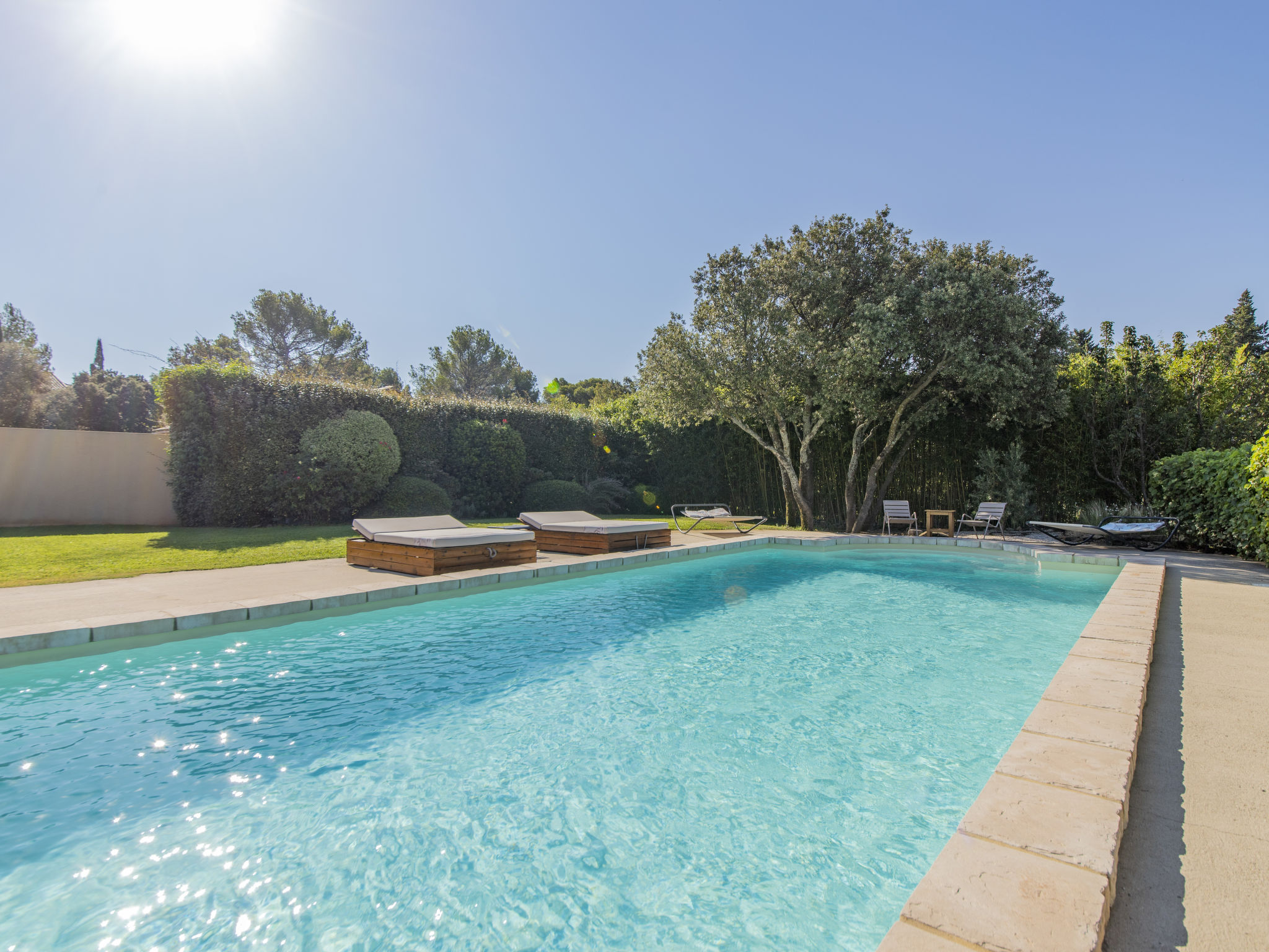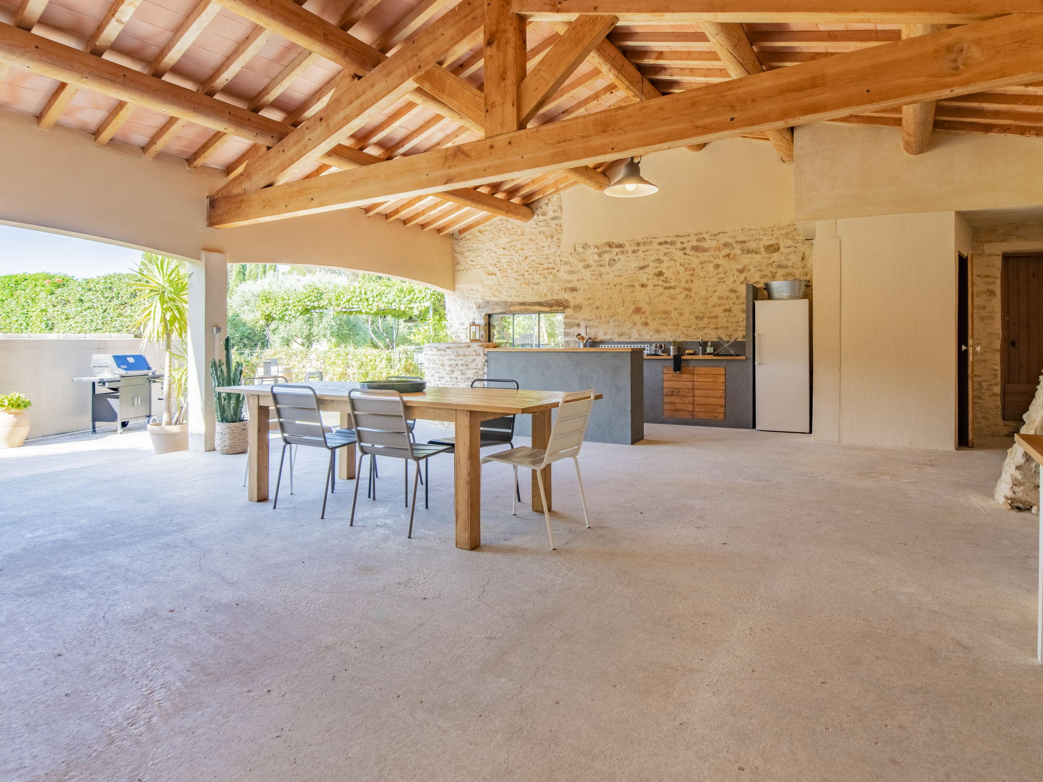 Mas/Landhaus "des Buis", renoviert im Jahre 2016. Im Ort, 1.5 km vom Zentrum von Uchaux. Zur Alleinbenutzung: Grundstück 4'500 m2 (eingezäunt), Schwimmbad (10 x 5 m, 140 - 140 cm tief, 01.06.-30.09.). Parkplatz auf dem Grundstück. Einkaufsgeschäft 1.5 km, Supermarkt 5 km, Restaurant 500 m, Bäckerei 150 m. Nahe gelegene Sehenswürdigkeiten: Orange 8 km, Vaison la Romaine 32 km, Avignon 41 km, Mont Ventoux 62 km. Bitte beachten: Fahrzeug empfohlen. Geeignet für Familien. Pool-Haus von 80m² mit kompletter Sommerküche (Kühlschrank, Kochplatten, Grill) und WC.