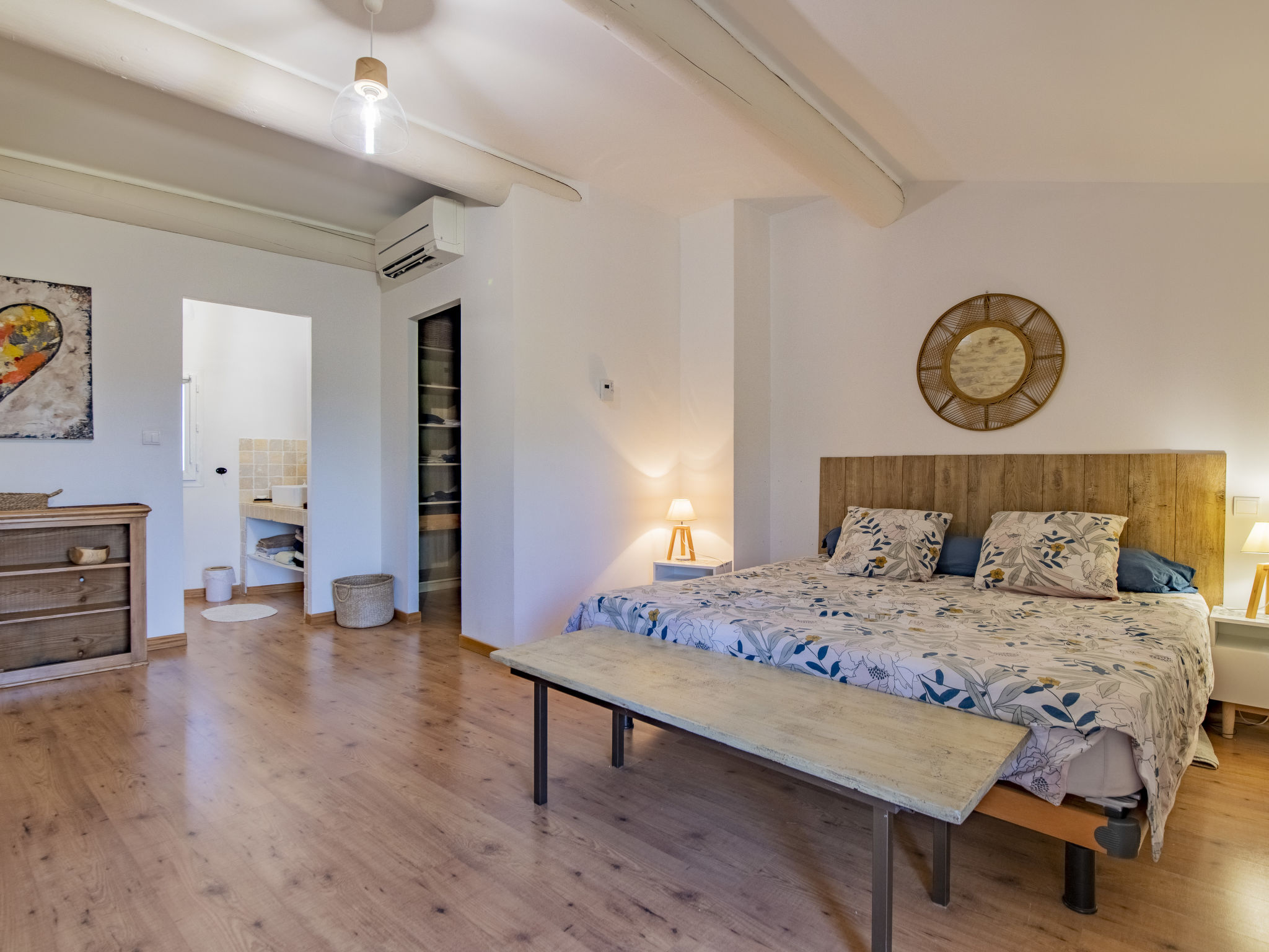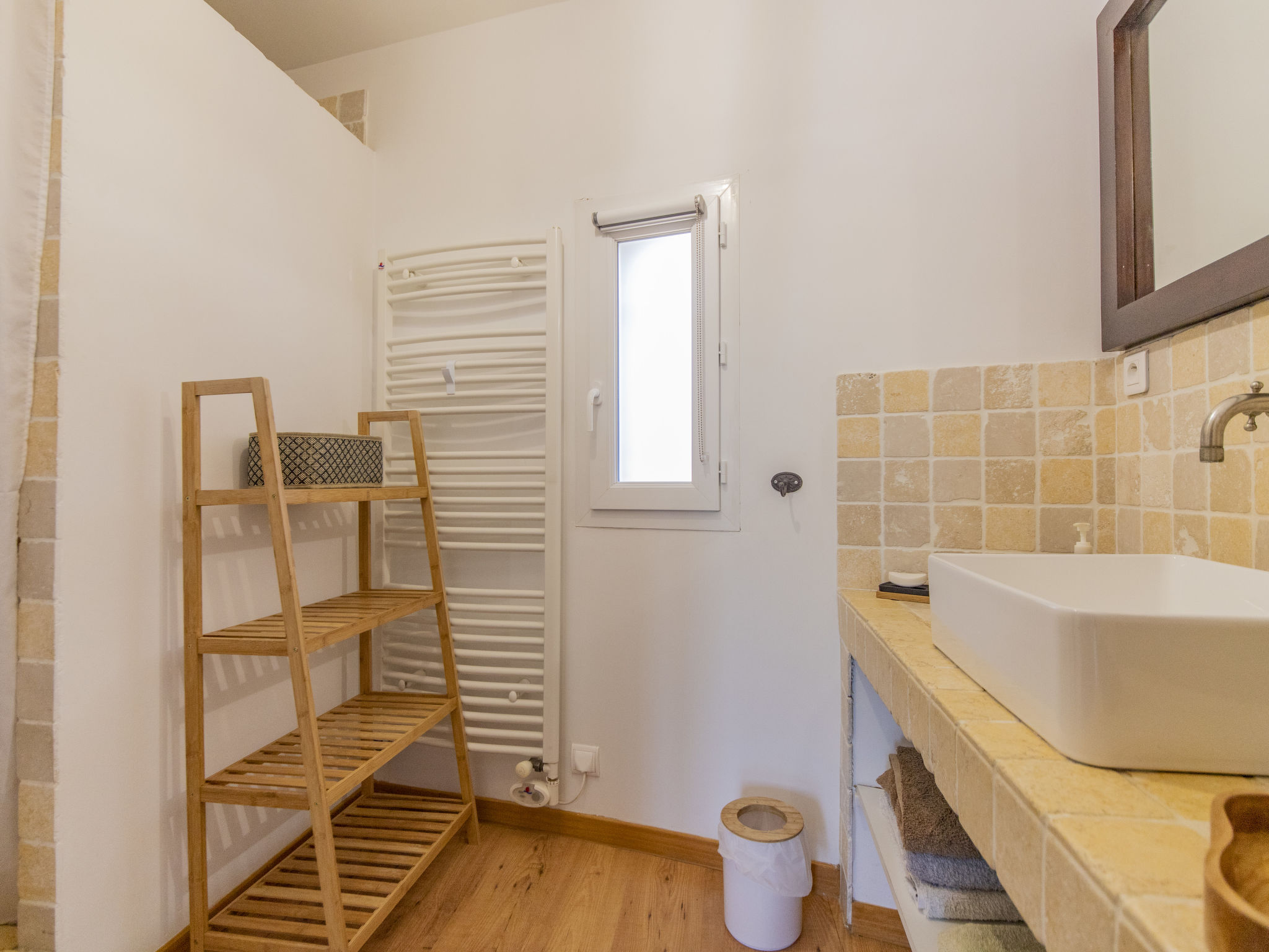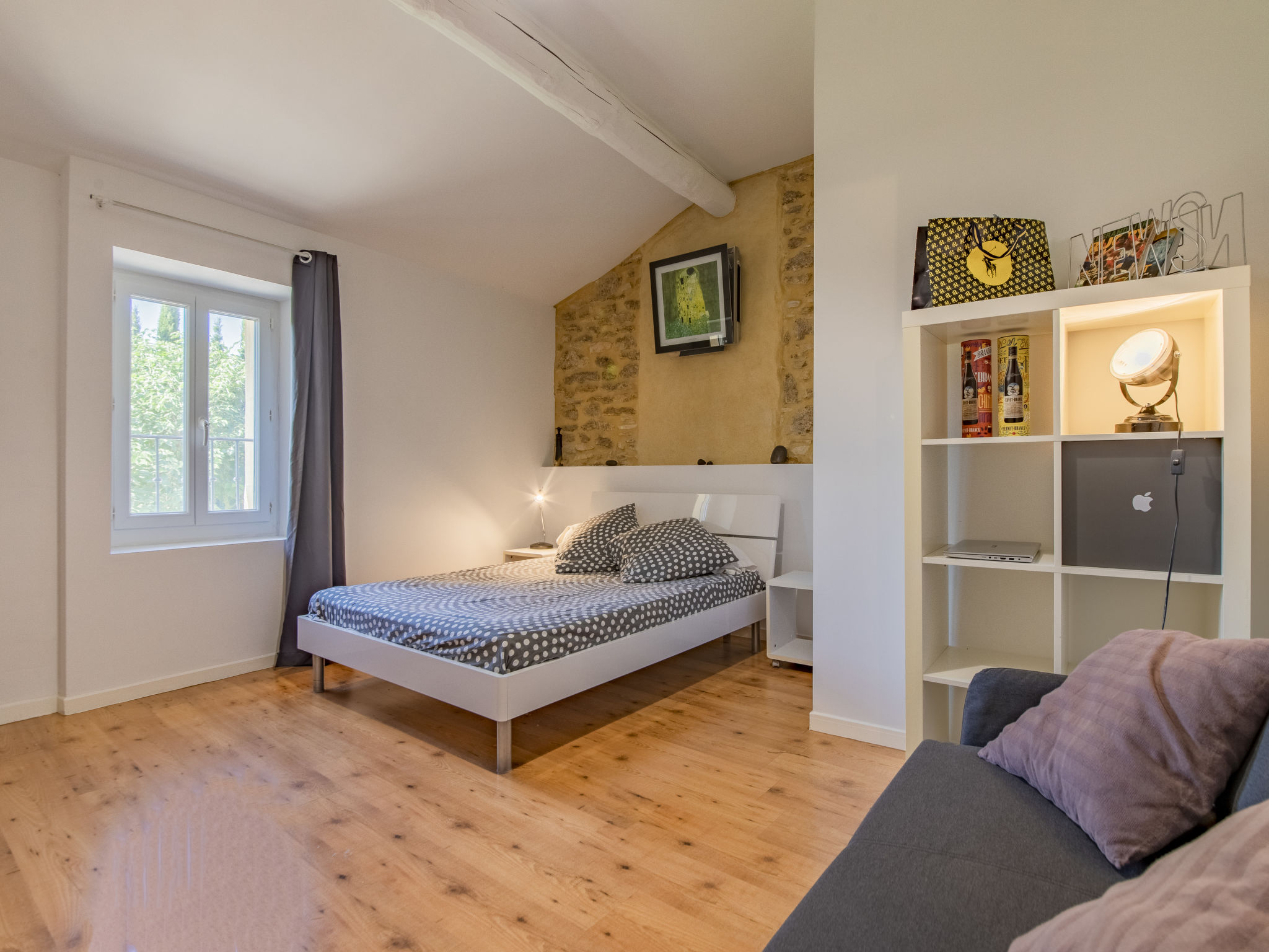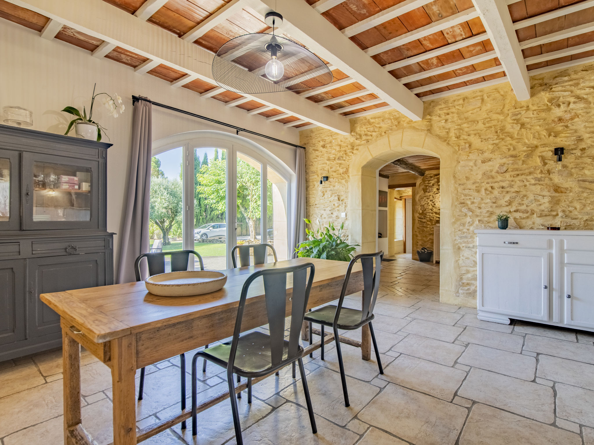 Mas/Landhaus "des Buis", renoviert im Jahre 2016. Im Ort, 1.5 km vom Zentrum von Uchaux. Zur Alleinbenutzung: Grundstück 4'500 m2 (eingezäunt), Schwimmbad (10 x 5 m, 140 - 140 cm tief, 01.06.-30.09.). Parkplatz auf dem Grundstück. Einkaufsgeschäft 1.5 km, Supermarkt 5 km, Restaurant 500 m, Bäckerei 150 m. Nahe gelegene Sehenswürdigkeiten: Orange 8 km, Vaison la Romaine 32 km, Avignon 41 km, Mont Ventoux 62 km. Bitte beachten: Fahrzeug empfohlen. Geeignet für Familien. Pool-Haus von 80m² mit kompletter Sommerküche (Kühlschrank, Kochplatten, Grill) und WC.