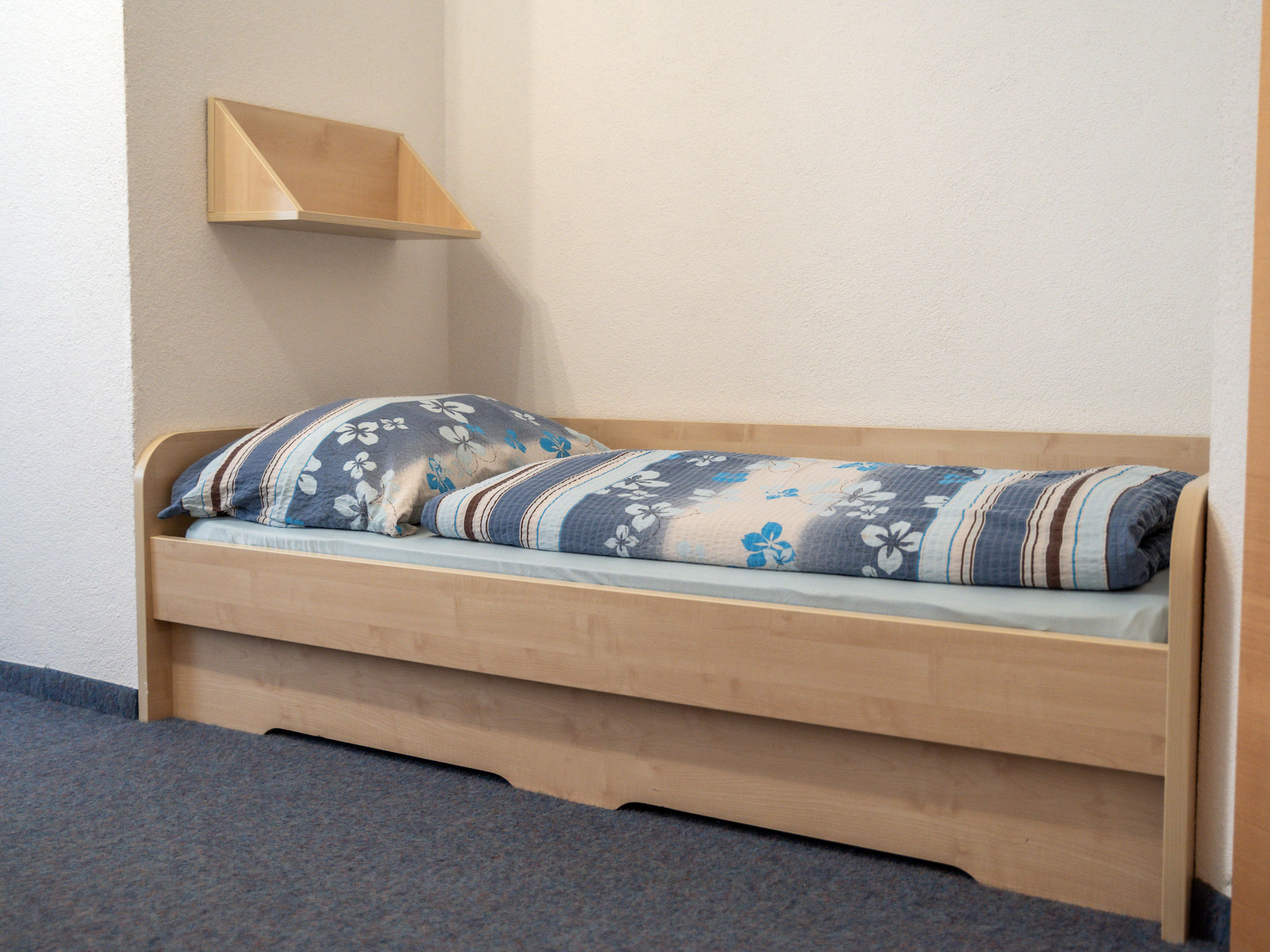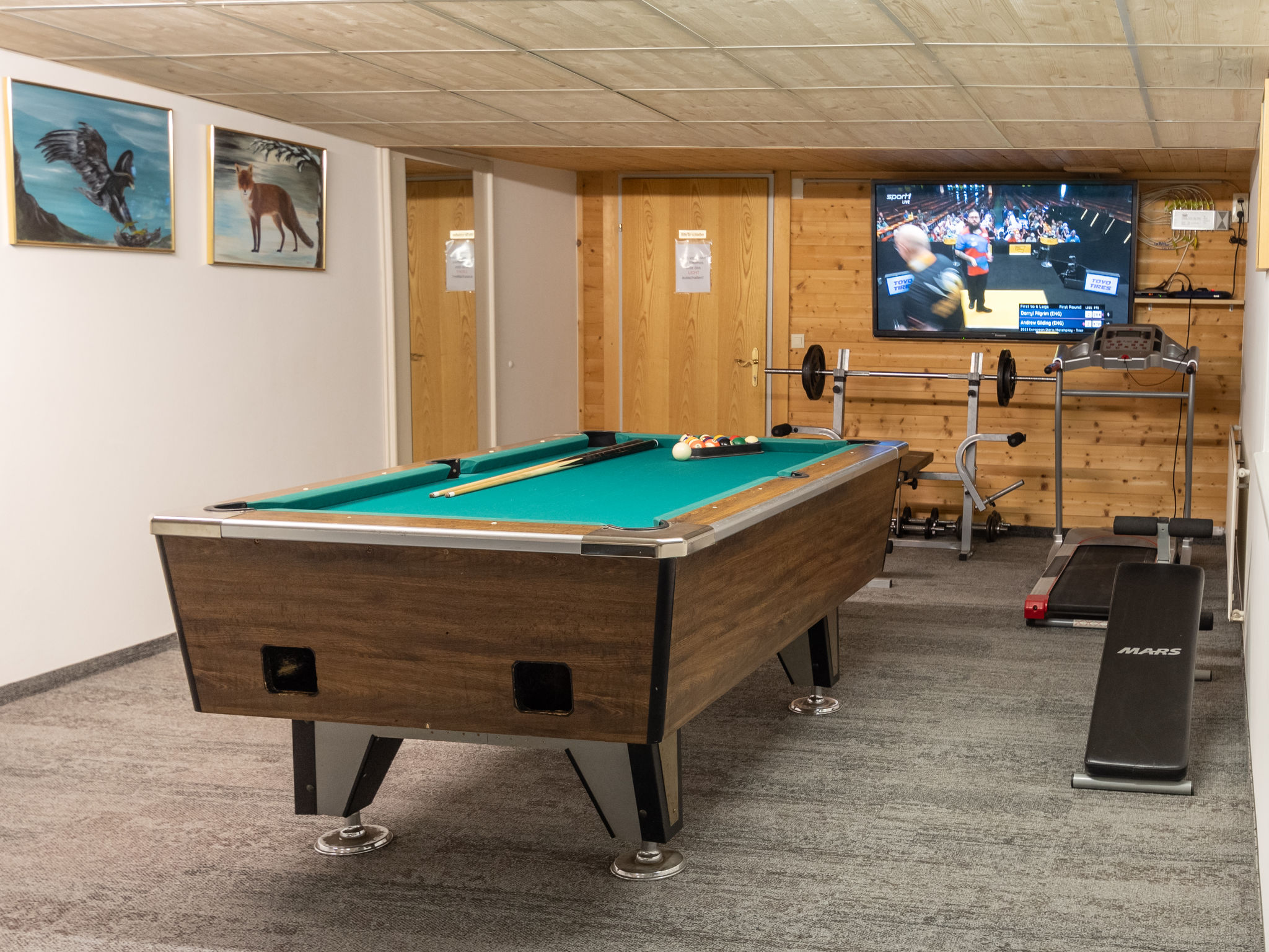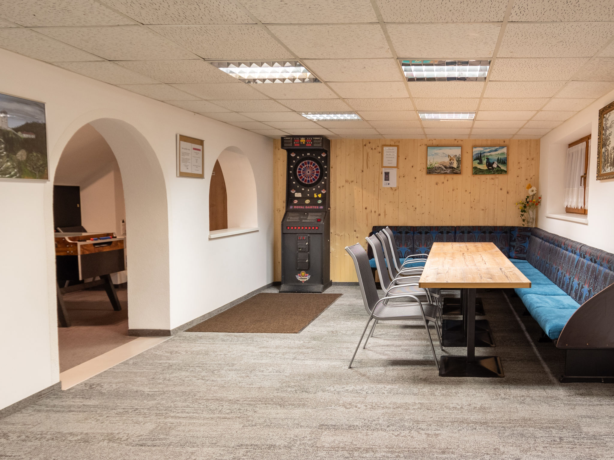 9-Zimmer-Wohnung, 2 Etagen, ca. 200 m². Erdgeschoss: Eingang in große Wohnküche (4 Ceranfelder, Backofen, Mikrowelle, Geschirrspüler, Kühlschrank, Gefrierschrank, Kaffeemaschine, Toaster) mit Essplätzen für ca. 20 Personen. 4 Doppelzimmer, jeweils mit Dusche/WC. 3 Schlafzimmer, jeweils mit Doppelbett, Einzelbett und Dusche/WC. Kleines Schlafzimmer (Schachtfenster) mit Etagenbett, Einzelbett und Dusche/WC. Untergeschoss: großer Aufenthaltsraum mit Sitzmöglichkeit, Theke. Billardtisch, Tischfußball und Dart, jeweils mit Münzeinwurf. Fitnessgeräte.