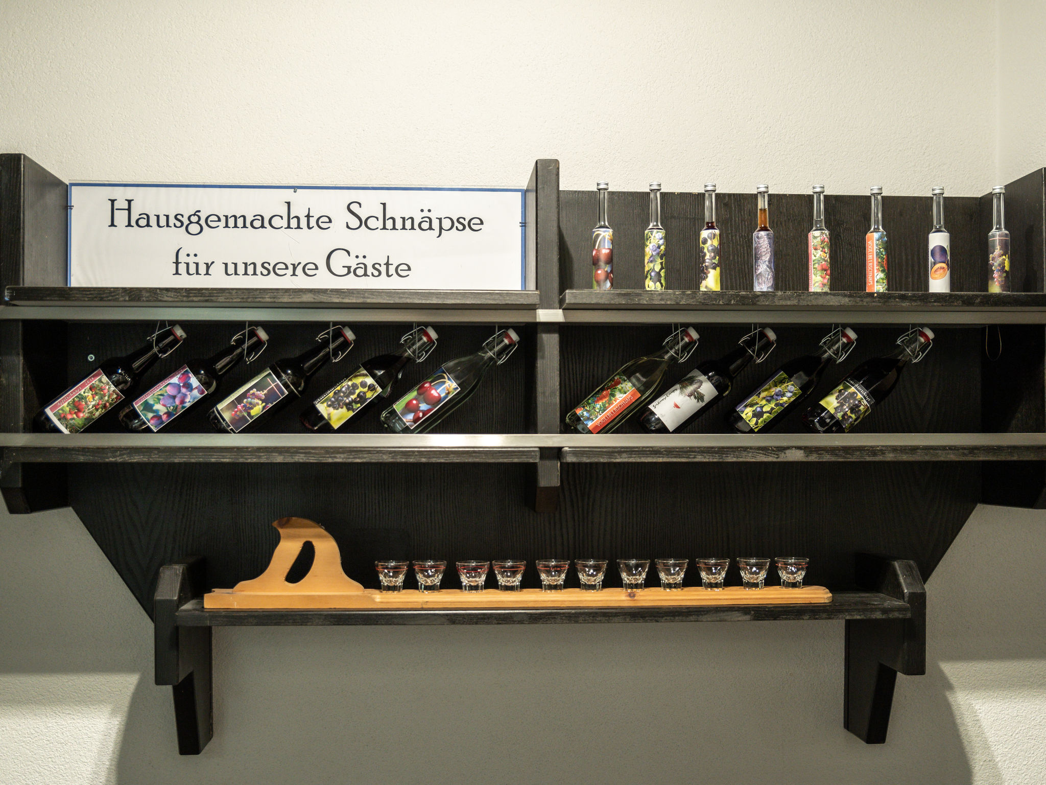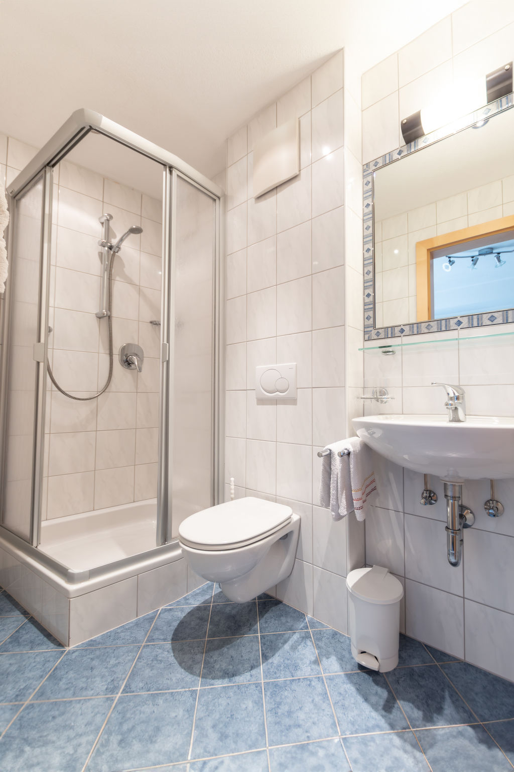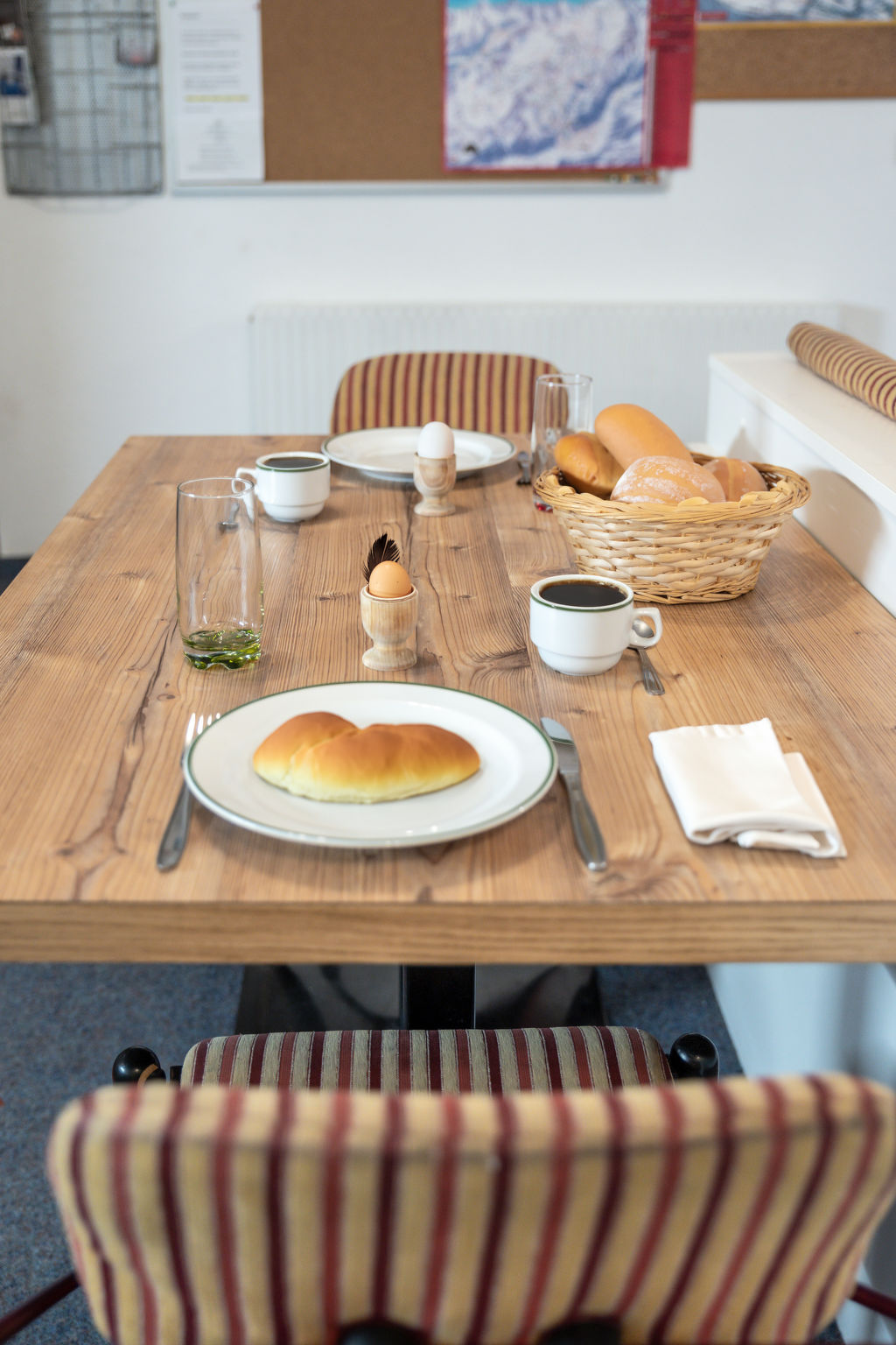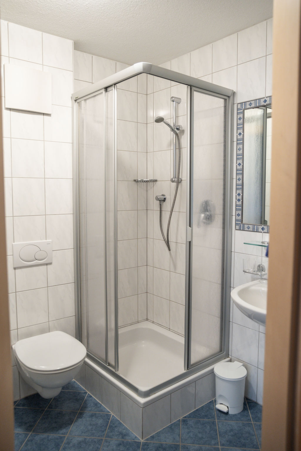 9-Zimmer-Wohnung, 2 Etagen, ca. 200 m². Erdgeschoss: Eingang in große Wohnküche (4 Ceranfelder, Backofen, Mikrowelle, Geschirrspüler, Kühlschrank, Gefrierschrank, Kaffeemaschine, Toaster) mit Essplätzen für ca. 20 Personen. 4 Doppelzimmer, jeweils mit Dusche/WC. 3 Schlafzimmer, jeweils mit Doppelbett, Einzelbett und Dusche/WC. Kleines Schlafzimmer (Schachtfenster) mit Etagenbett, Einzelbett und Dusche/WC. Untergeschoss: großer Aufenthaltsraum mit Sitzmöglichkeit, Theke. Billardtisch, Tischfußball und Dart, jeweils mit Münzeinwurf. Fitnessgeräte.