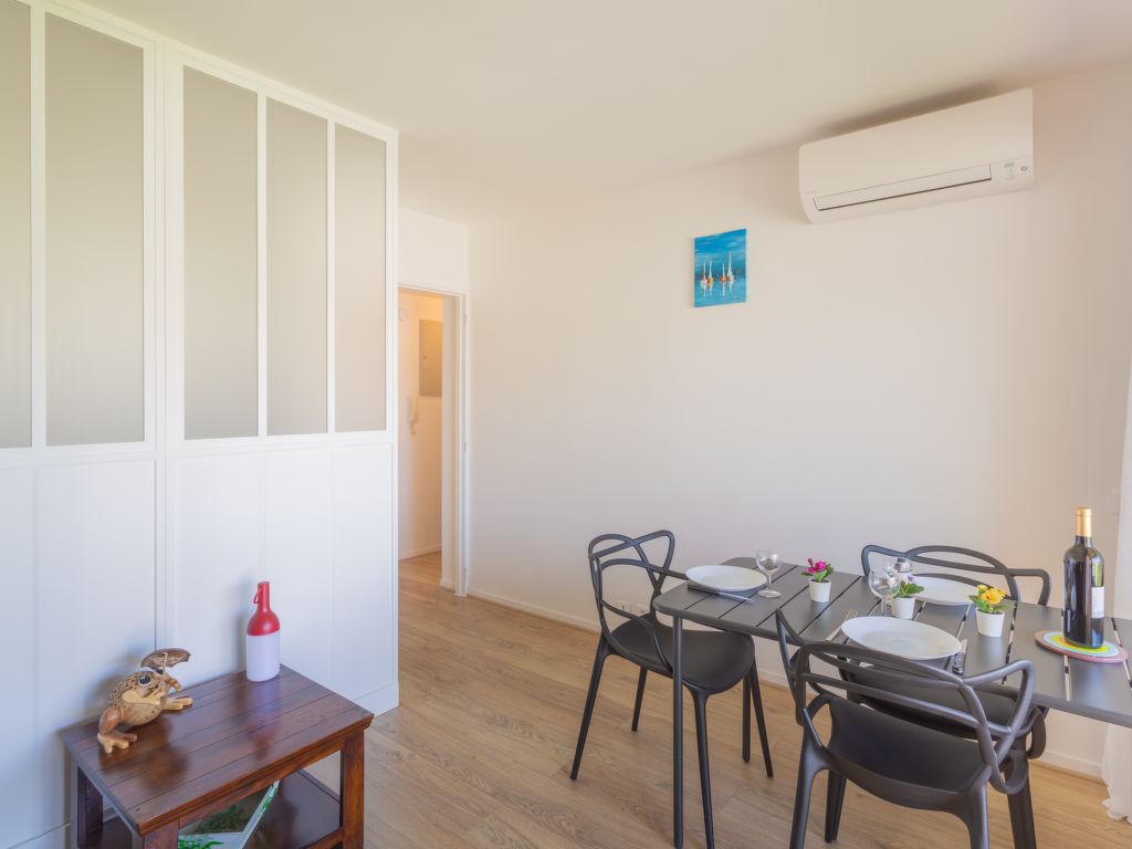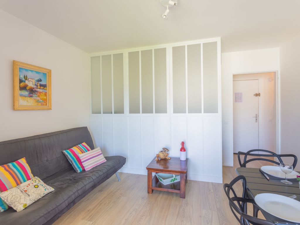 2-Zimmer-Wohnung 33 m2 im 3. Stock. Hell, vollständig renoviert im Jahre 2021, komfortabel und schön eingerichtet: Wohn-/Schlafzimmer mit 1 Diwanbett (140 cm, Länge 190 cm), TV (Flachbildschirm). Ausgang zur Terrasse. 1 Zimmer mit 1 franz. Bett (140 cm, Länge 190 cm). Kochnische (Geschirrspüler, 4 Glaskeramikherd Platten, Toaster, Wasserkocher, Mikrowelle, Tiefkühler, elektrische Kaffeemaschine). Bad, sep. WC. E-Heizung, Klimaanlage. Terrasse 7 m2. Terrassenmöbel. Sicht auf den Garten. Zur Verfügung: Waschmaschine. Internet (Wireless LAN, extra). Bitte beachten: TV nur FR. Rauchmelder. Inserat einer Privatperson nach Artikel 155, IV, CGI.