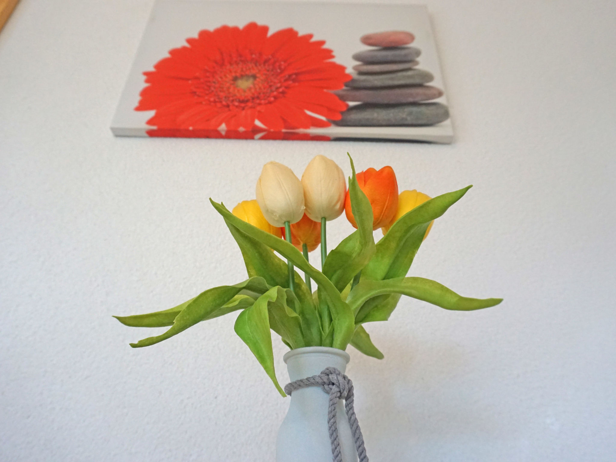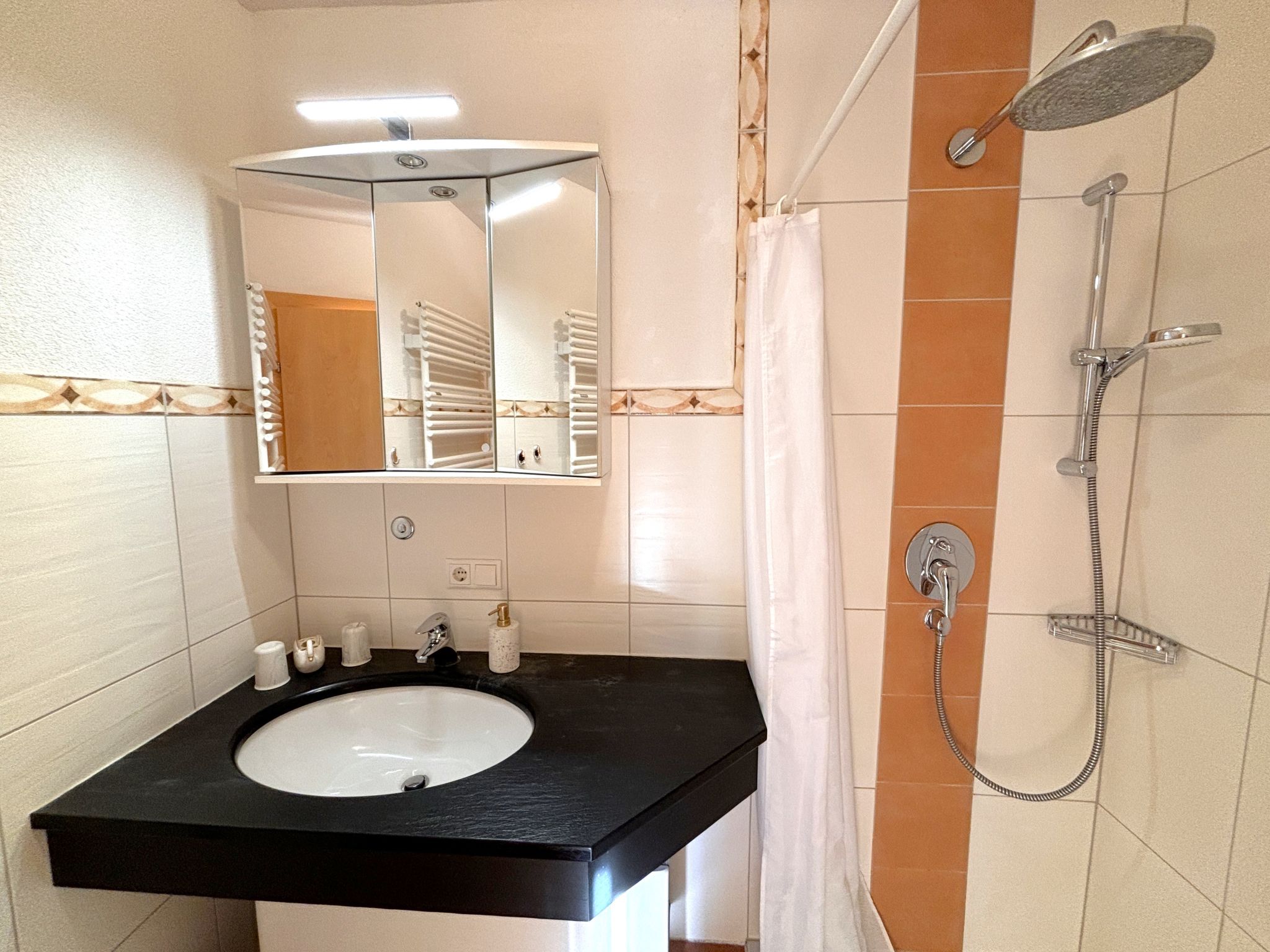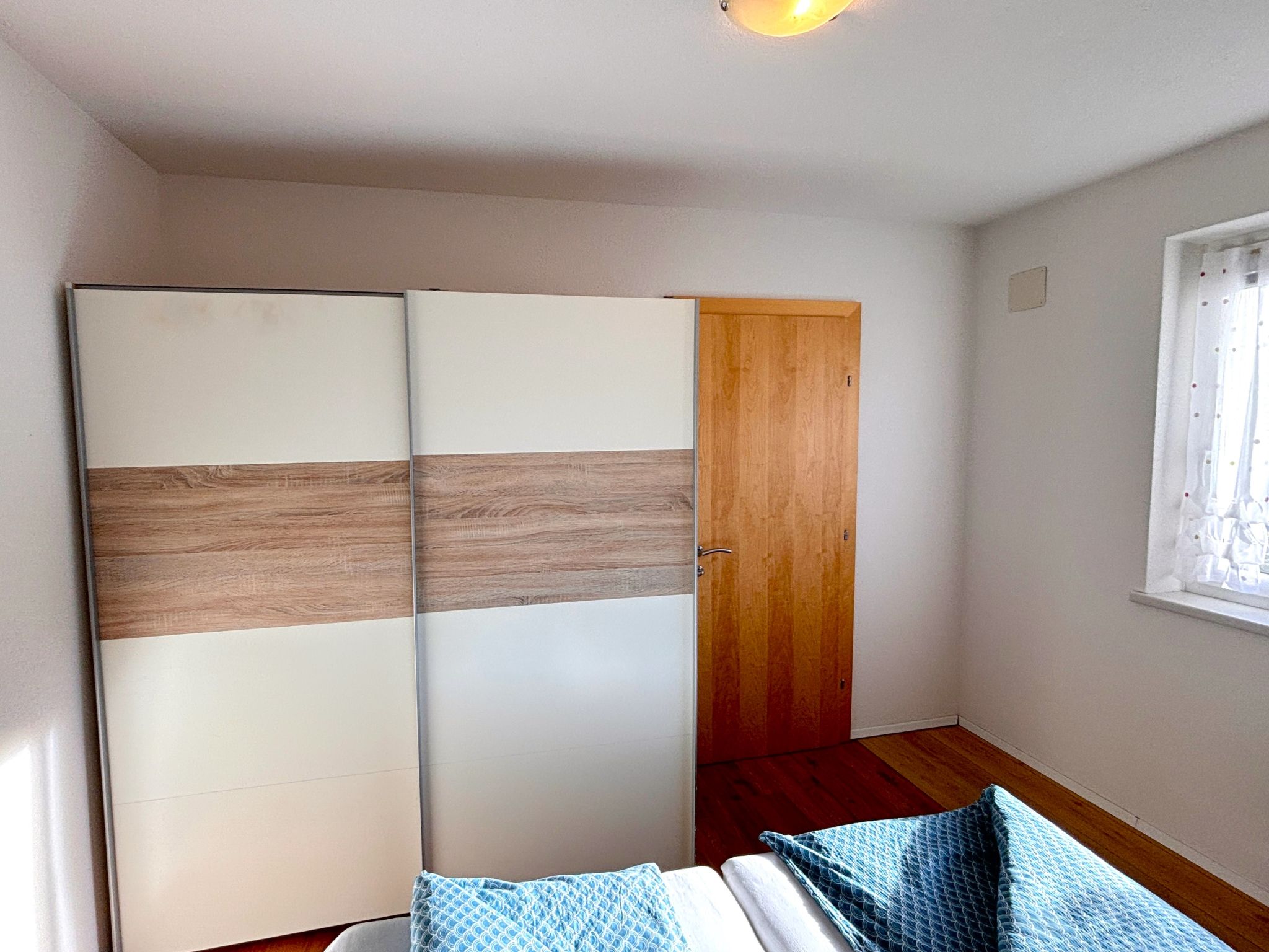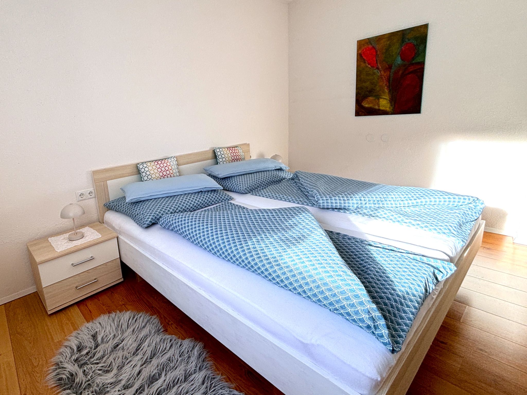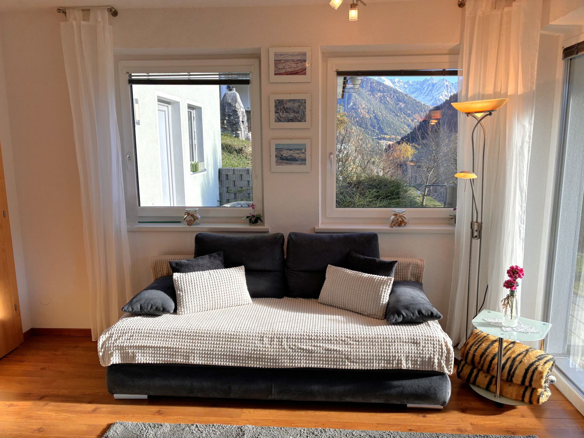 2-Zimmer-Wohnung 34 m2, im ebenerdigen Untergeschoss. Komfortabel und geschmackvoll eingerichtet: Eingang. 1 Doppelzimmer. Wohn-/Esszimmer mit Panoramafenster mit 1 Doppeldiwanbett und Sat-TV (Flachbildschirm), Radio. Offene Küche (2 Kochplatten, elektrische Kaffeemaschine, Kombinationsmikrowelle) mit Esstisch. Dusche/WC. Fussbodenheizung. Terrasse überdacht. Terrassenmöbel, Gartengrill. Herrliche Panoramasicht auf die Berge und die Landschaft. Zur Verfügung: Haartrockner. Internet (Wireless LAN, gratis). Parkplatz (überdacht). Bitte beachten: Nichtraucher-Unterkunft.