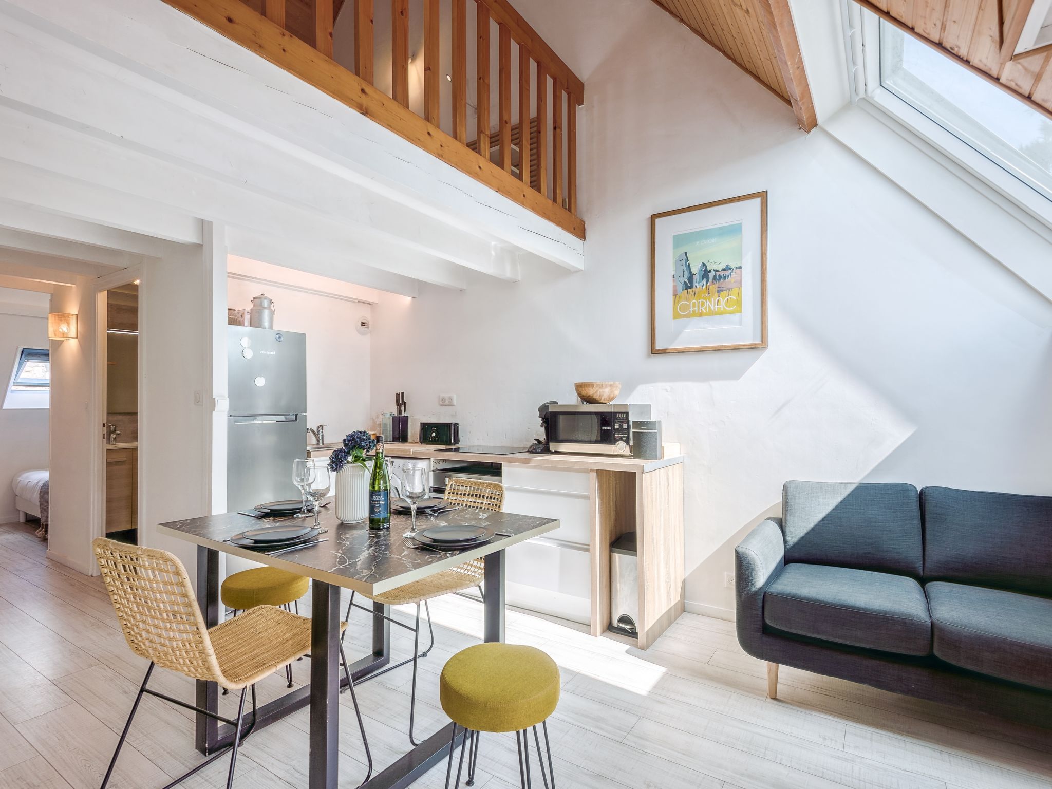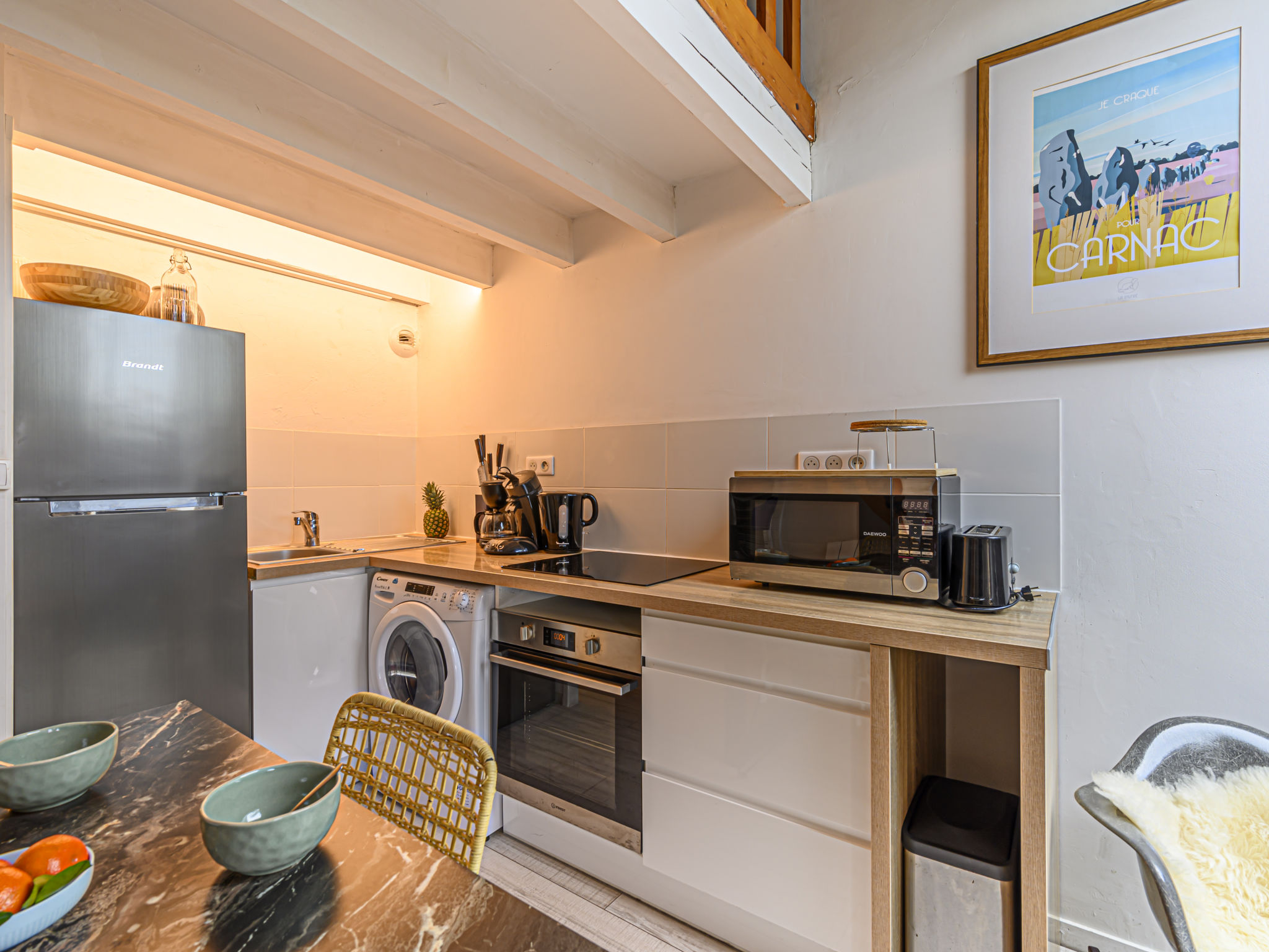 Residenz "Les Druides", auf 2 Stockwerken. Im Ort, 1.5 km vom Zentrum von de Carnac Plage, ruhige Lage, 500 m vom Meer. Einkaufsgeschäft 1.5 km, Supermarkt 200 m, Restaurant 1.5 km, Sandstrand "La Grande Plage" 500 m, Thermalbad "Thalassothérapie de Carnac" 2 km. Nahe gelegene Sehenswürdigkeiten: Ecole de voile "Le Yacht Club" 1.5 km, Les Alignements de Carnac 3.5 km, La Trinité Sur Mer 4 km, Auray 17 km, Quiberon 20 km, Lorient 52 km.