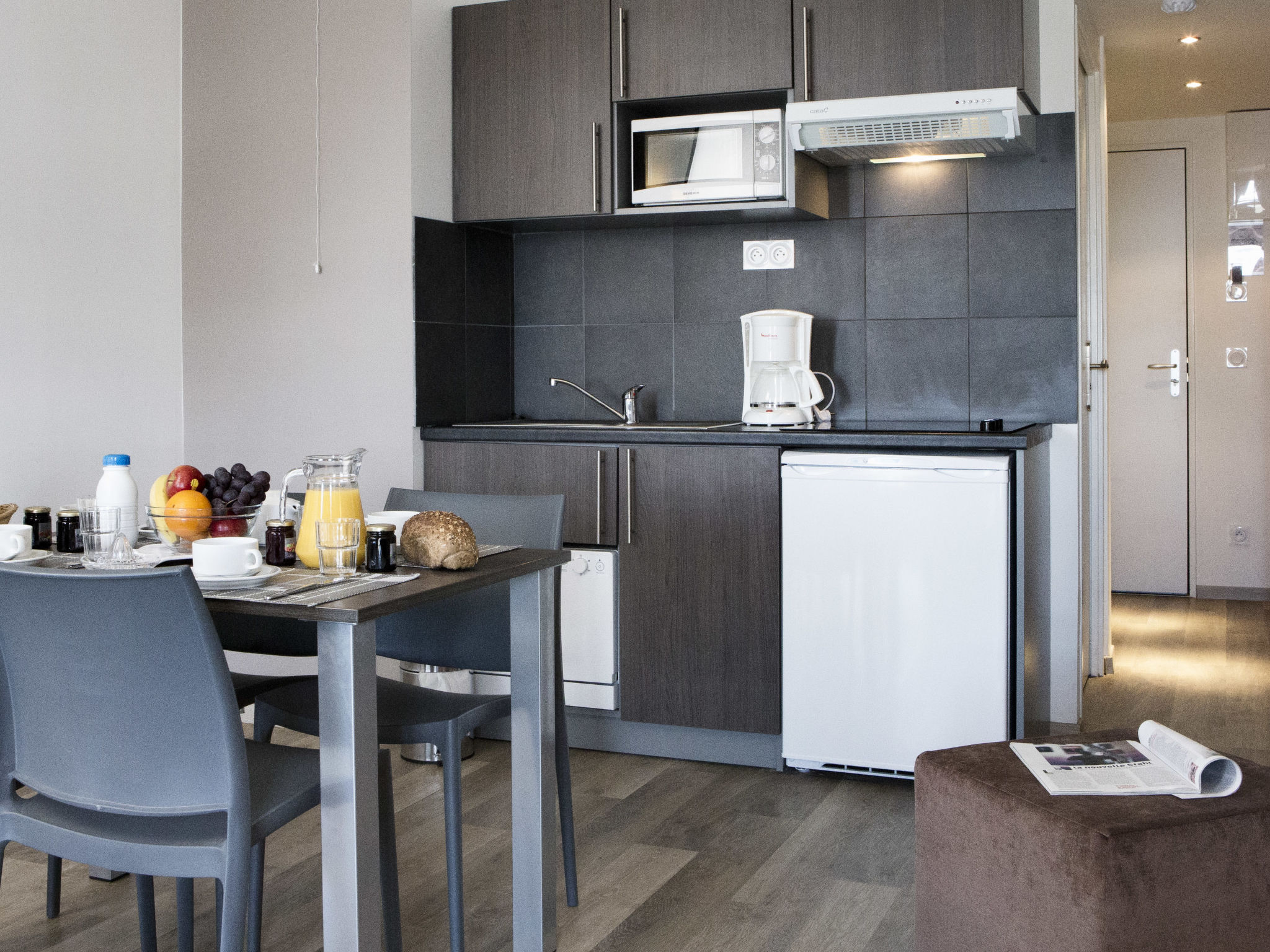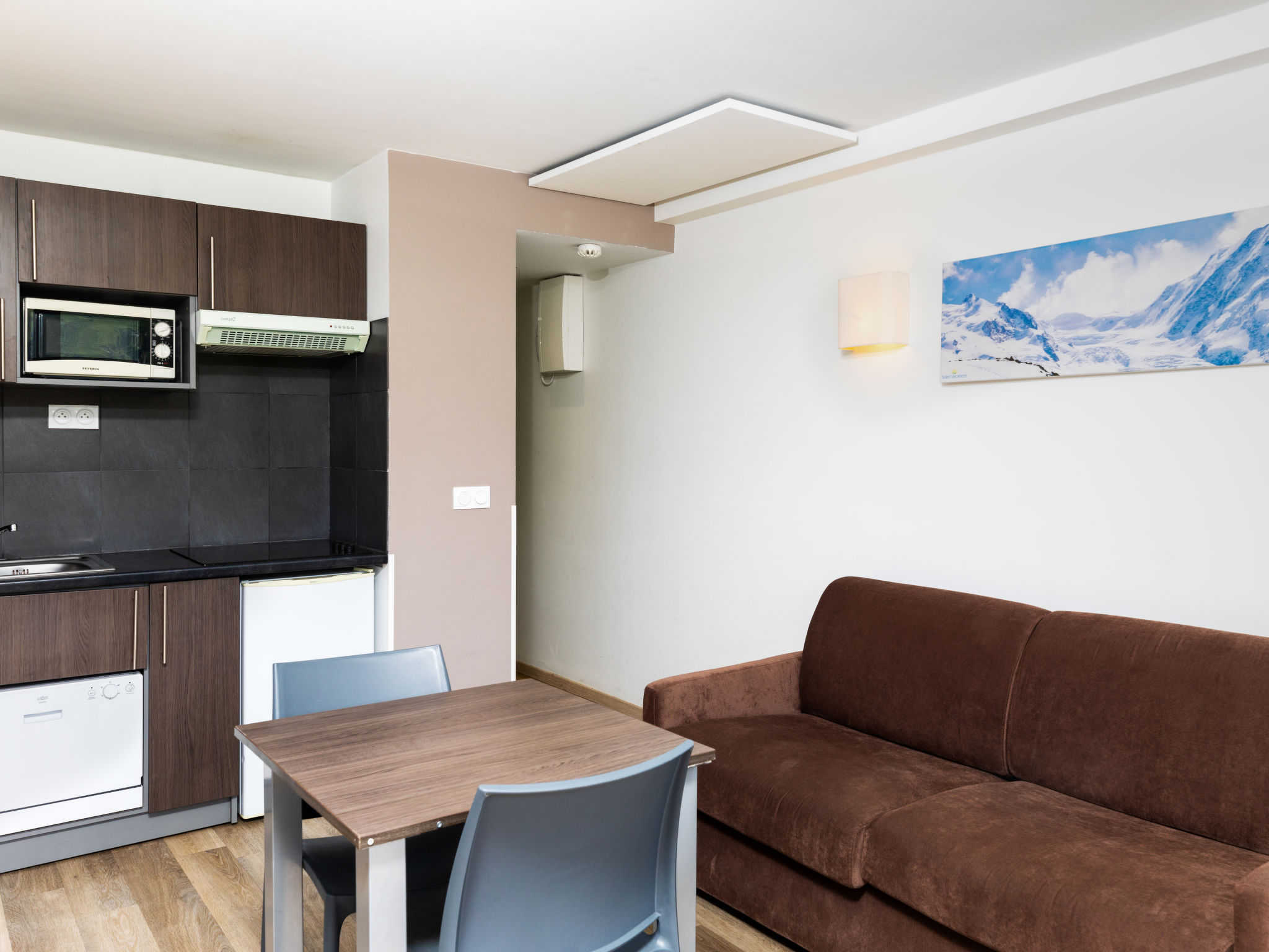 1-Zimmer-Wohnung, ca. 20-23 m². Wohn-/Schlafraum mit Doppelbettcouch und Einzelbett, Essplatz, Balkonausgang und Kochecke (3 Ceranfelder, Backofen/Mikrowelle, kleiner Geschirrspüler, Kühlschrank, Kaffeemaschine, Wasserkocher, Toaster). Bad/WC oder Dusche/WC.
