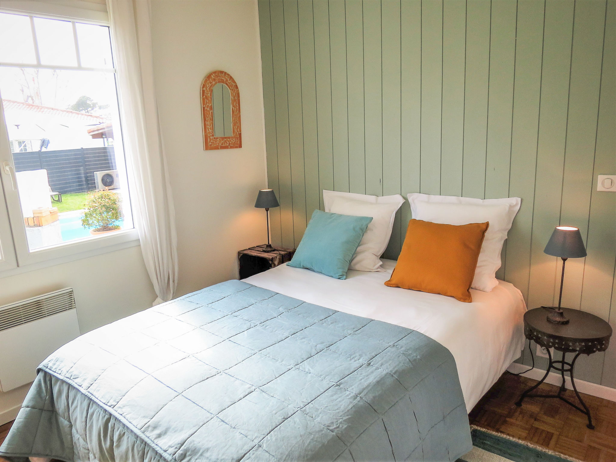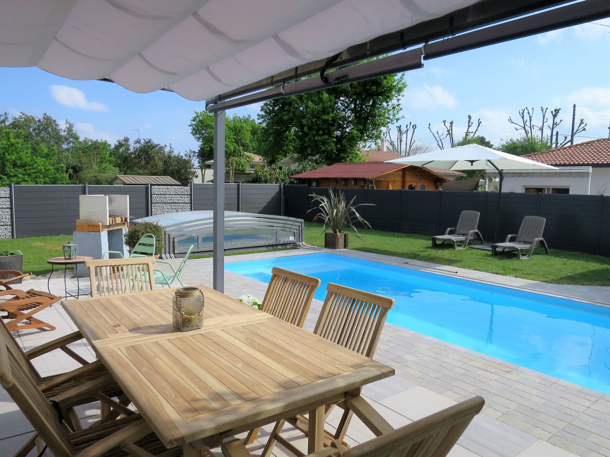 Schöne Villa "Camélia". 1 km vom Zentrum von Andernos les Bains, 40 km vom Zentrum von Arcachon, 45 km vom Zentrum von Bordeaux, 1 km vom Meer, in einer Sackgasse. Zur Alleinbenutzung: Grundstück 750 m2 (eingezäunt), gepflegter Garten mit Rasen und Pflanzen, Hallenbad (7 x 3 m, 150 cm tief, 01.07.-15.09.) mit Rollladenabdeckung. Parkplatz auf dem Grundstück. Sandstrand "Plage du Bétey (Bassin)" 1 km. Golfplatz (9 Loch) 6 km. Nahe gelegene Sehenswürdigkeiten: Plage du Grand Crohot (Océan Atlantique) 16 km.