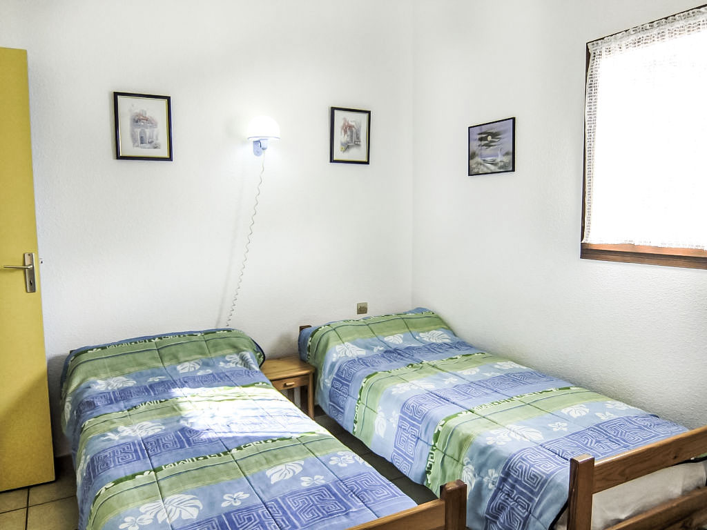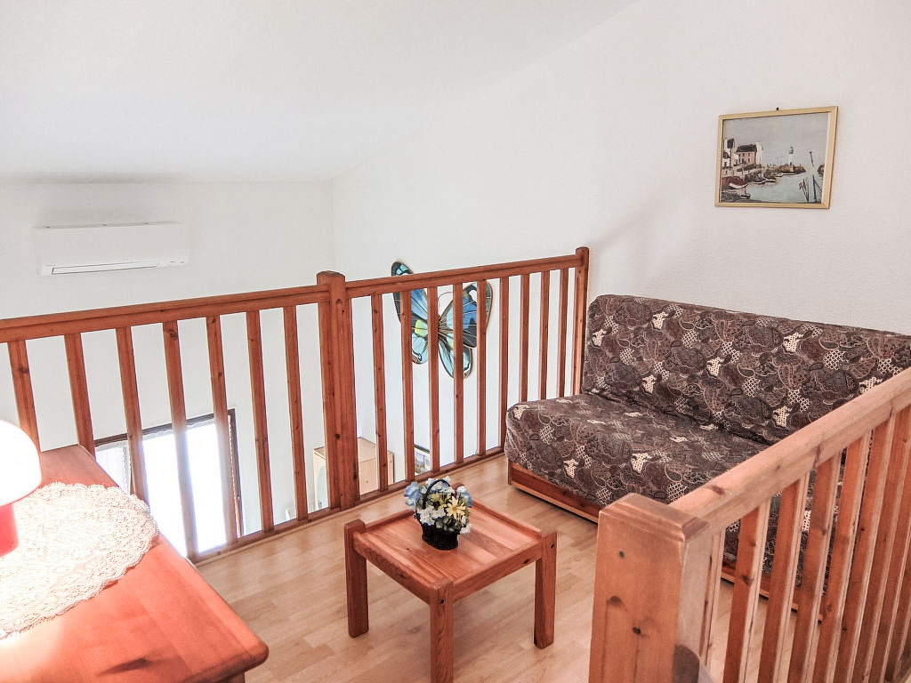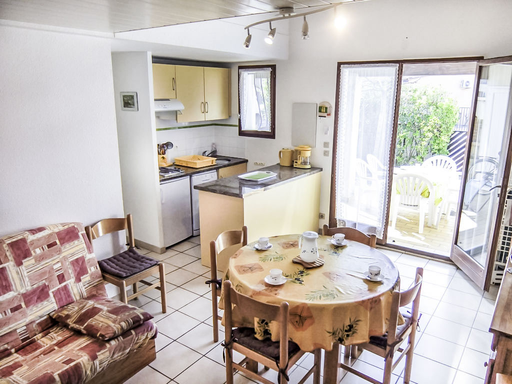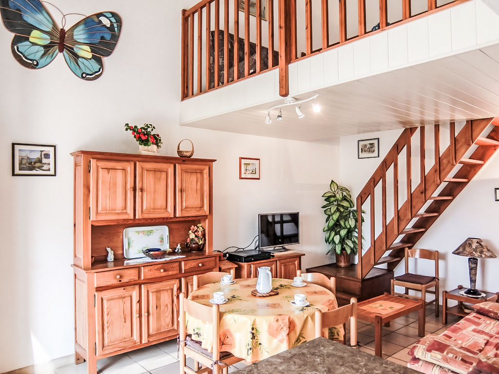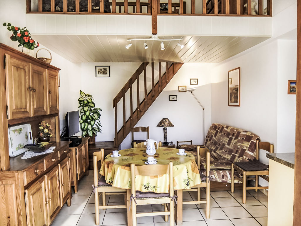 3-Zimmer-Reihenhaus 58 m2 auf 2 Stockwerken. Wohn-/Esszimmer mit TV und Klimaanlage. 1 Zimmer mit 1 franz. Bett. Kochnische (Backofen, Geschirrspüler, 2 Glaskeramikherd Platten, elektrische Kaffeemaschine). Bad, sep. WC. Obergeschoss: Galerie mit 1 Doppeldiwanbett. 1 Zimmer mit 2 Betten und Dusche/WC. Terrasse 40 m2, Westlage. Terrassenmöbel, Gartengrill. Zur Verfügung: Internet (Wireless LAN, extra). Parkplatz. Bitte beachten: Rauchmelder.