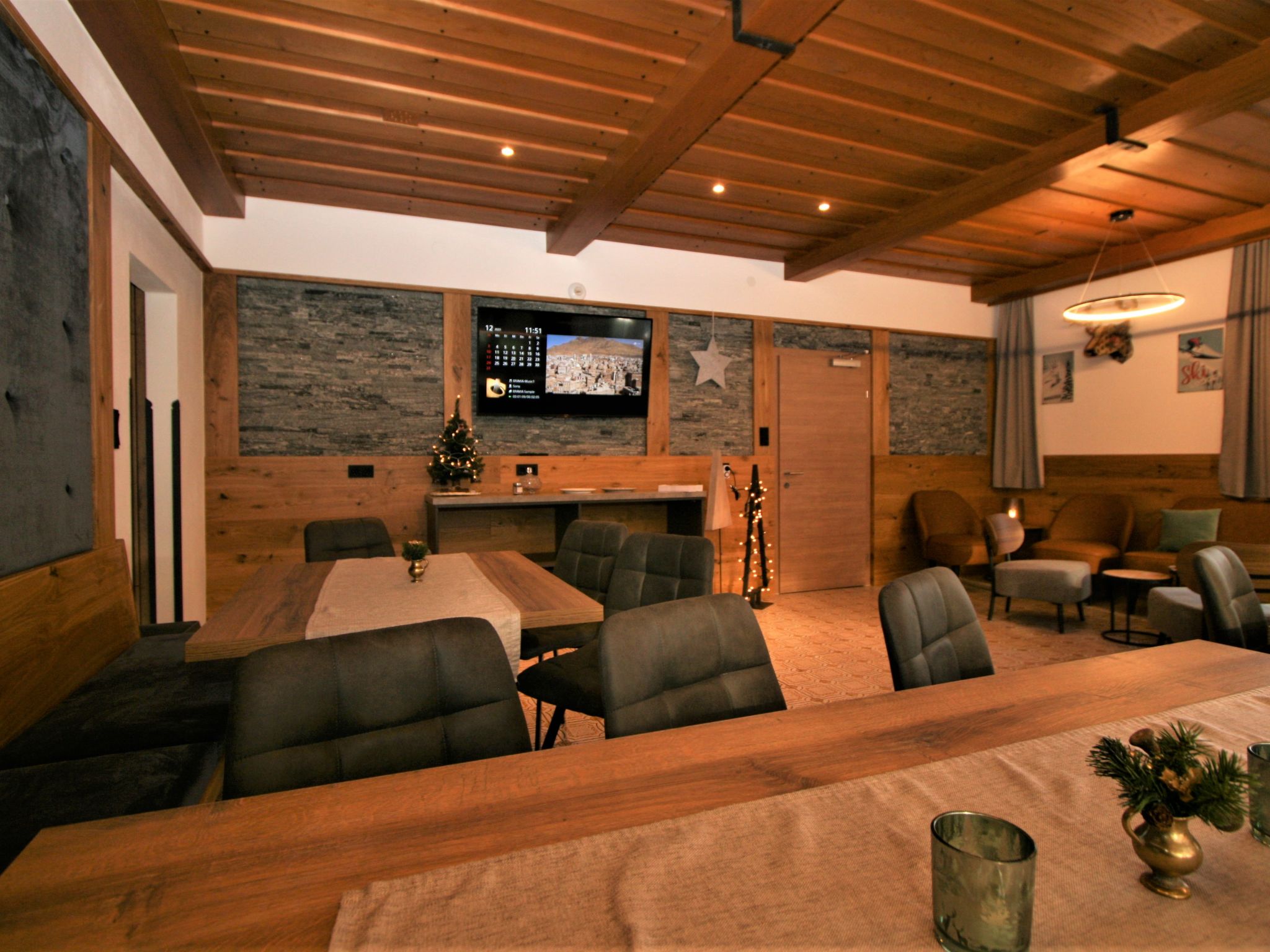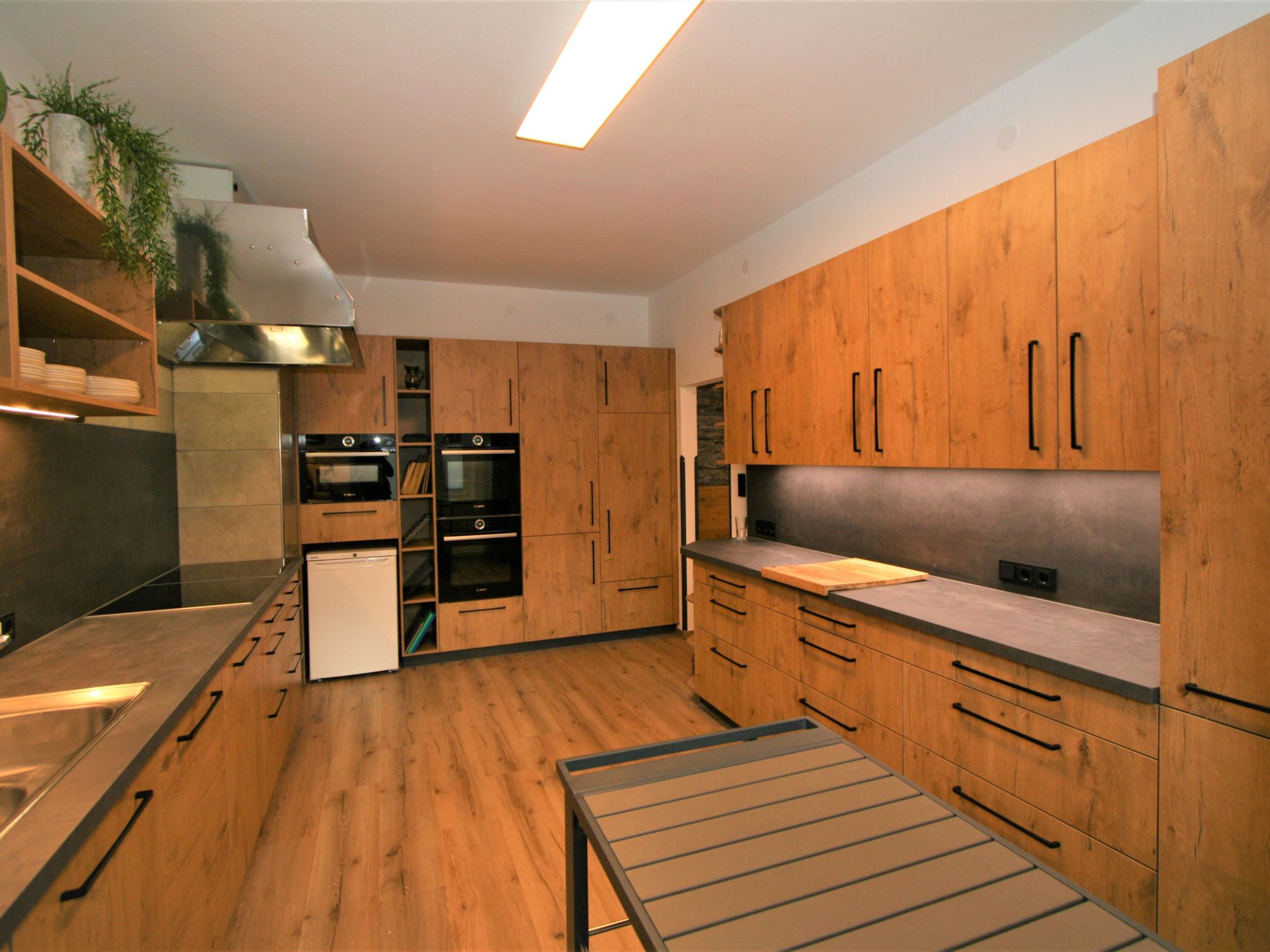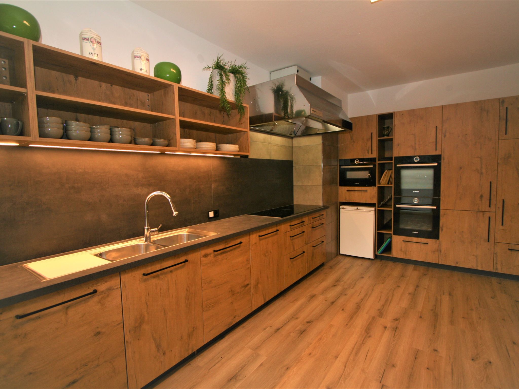 14-Zimmer-Haus, 3 Etagen, ca. 300 m². Flur. Großer Aufenthalts-/Essraum mit Tischen, Stühlen, Eckbänken und Küchenzeile (4 Ceranfelder, Backofen, Mikrowelle, Geschirrspüler, Kühlschrank, Kaffeemaschine, Wasserkocher). Speisekammer mit Kühlschrank und Gefrierschrank. 2x sep.WC. 1. Etage: 5 Doppelzimmer, jeweils mit Dusche/WC und TV. Doppelzimmer mit Dusche/WC. Einzelzimmer, Dusche/WC. 2. Etage: 4 Doppelzimmer, jeweils mit Dusche/WC und TV. Doppelzimmer mit Waschbecken. 2 Einzelzimmer mit Waschbecken. Außer einem Einzelzimmer alle Schlafzimmer mit Balkonausgang. Sep.WC. Bei Belegung mit weniger Personen als der maximalen Personenzahl stehen nicht alle Wohneinheiten zur Verfügung.