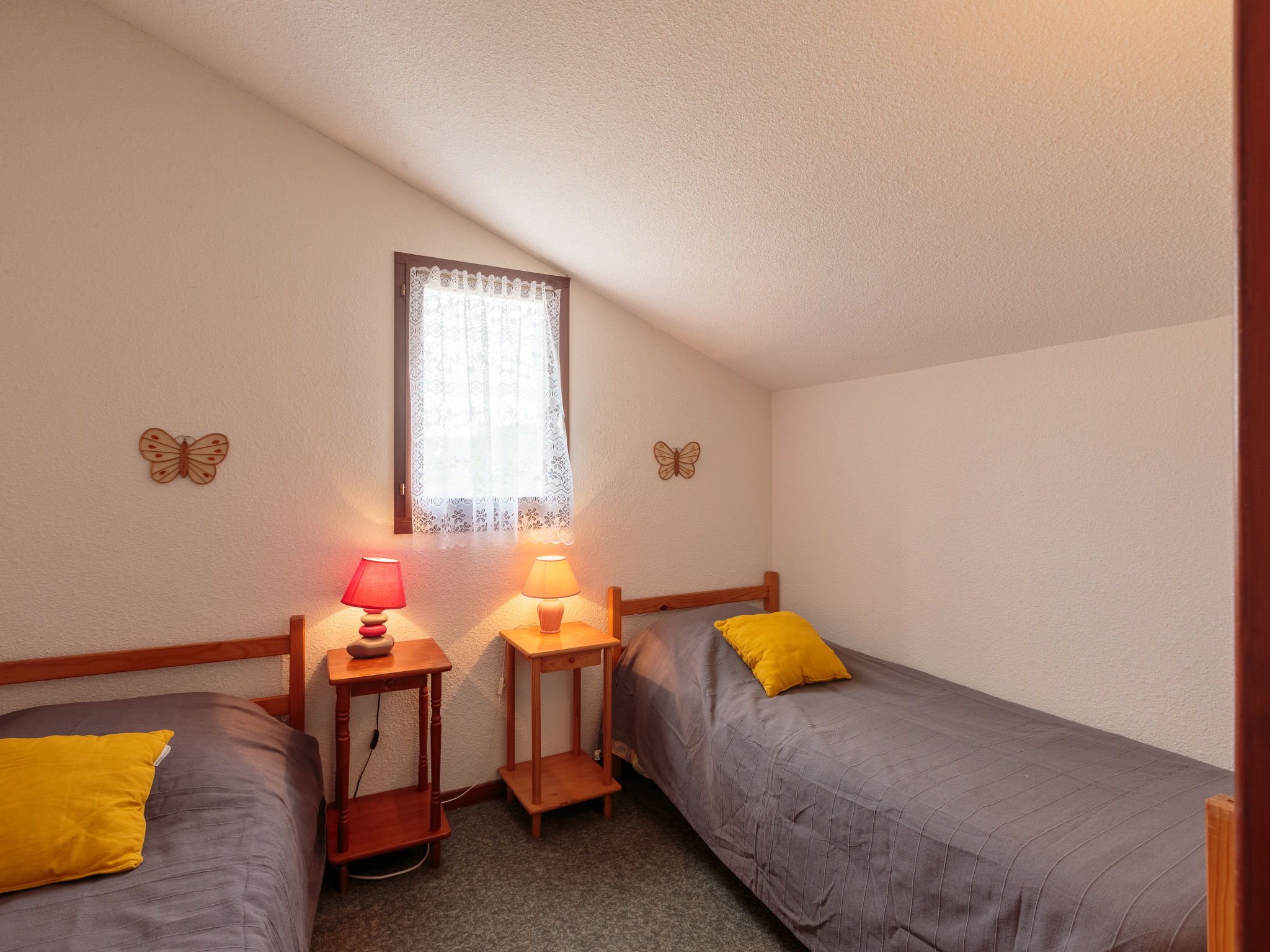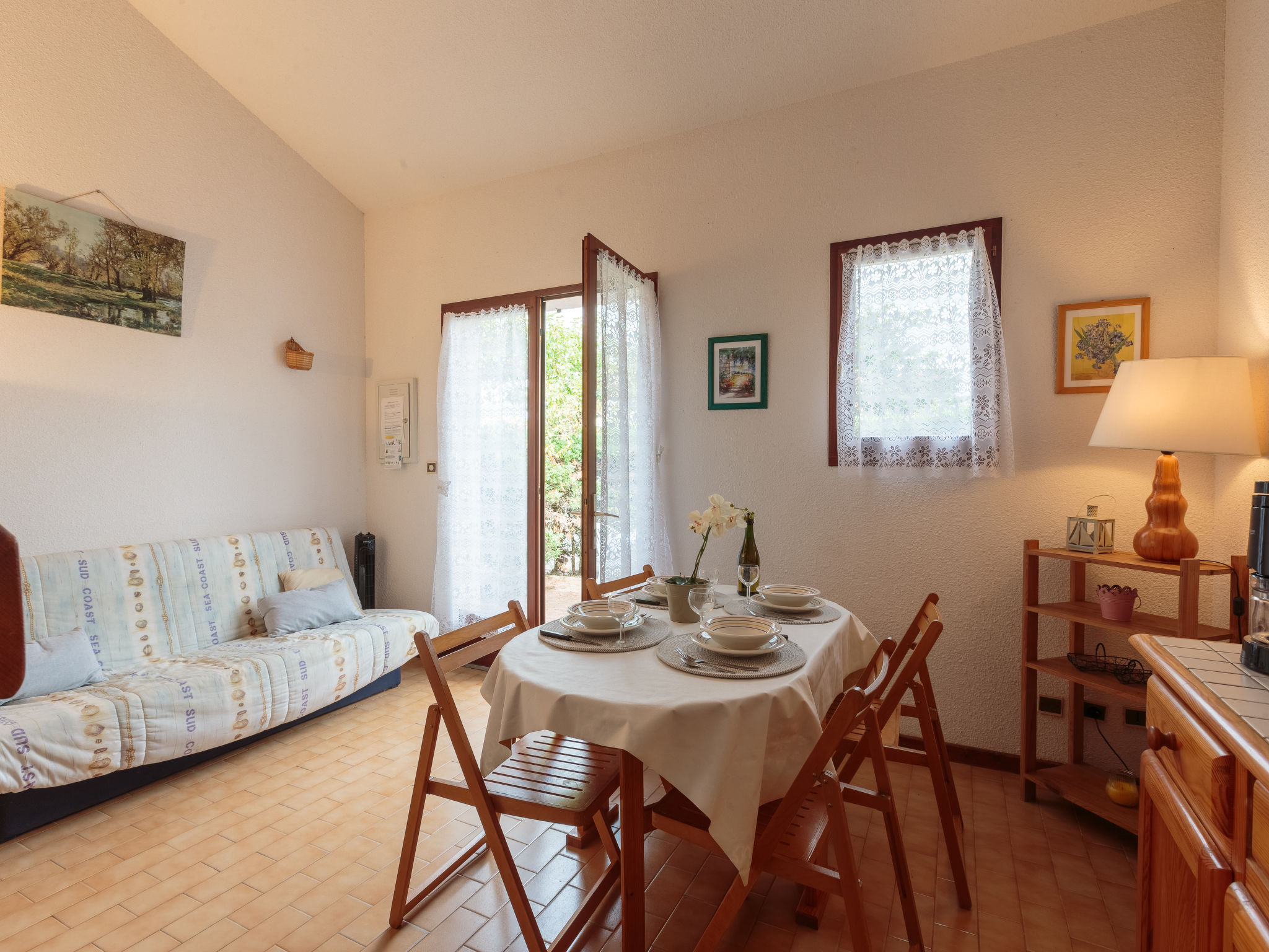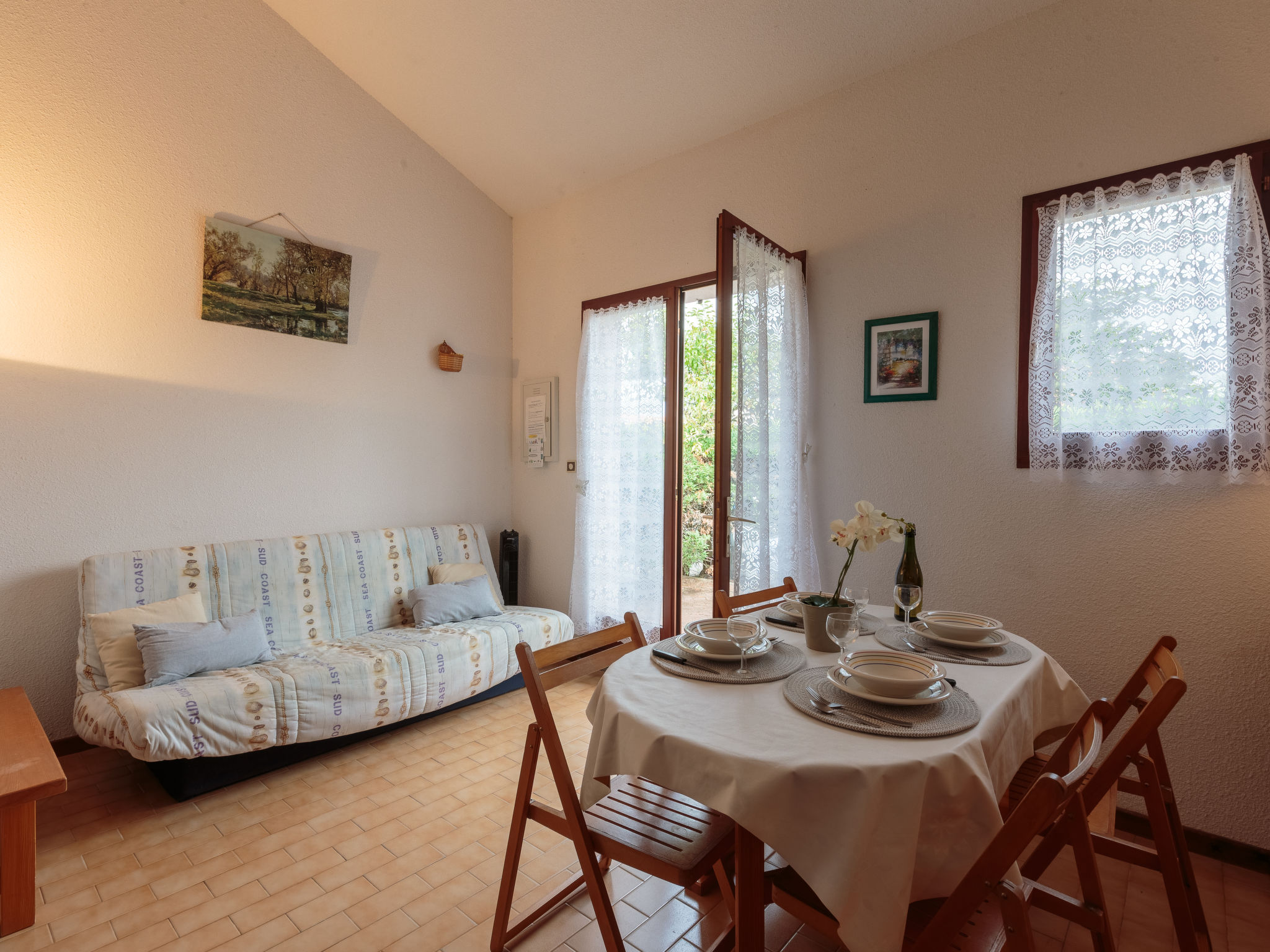 2-Zimmer-Reihenhaus 35 m2 auf 2 Stockwerken. Objekt geeignet für 2 Erwachsene + 2 Kinder. Wohn-/Esszimmer. 1 Zimmer mit 1 franz. Bett (1 x 140 cm, Länge 190 cm). Kochnische (2 Kochplatten, Mini-Backofen, Mikrowelle, elektrische Kaffeemaschine). Bad/WC. Obergeschoss: Galerie mit 2 Betten (80 cm, Länge 190 cm). Terrasse 12 m2, Ostlage. Terrassenmöbel. Zur Verfügung: Internet (Wireless LAN, extra). Parkplatz Nr. 66. Bitte beachten: Maximal 1 Haustier/Hund erlaubt. Rauchmelder.