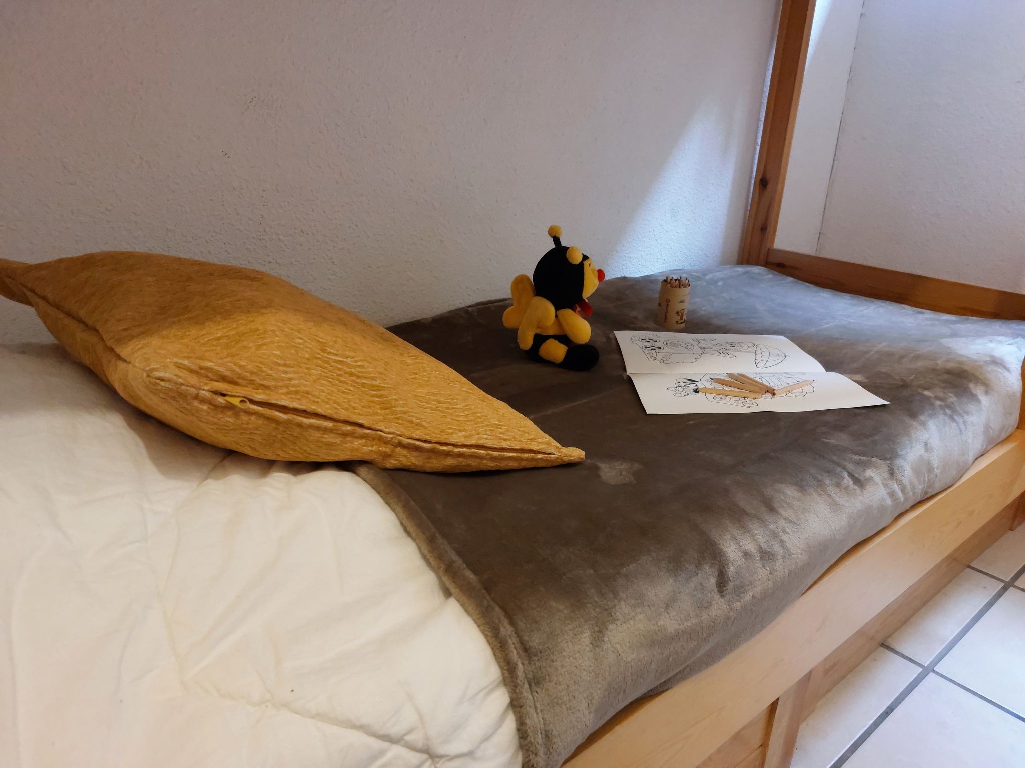 1-Zimmer-Studio 21 m2, im Erdgeschoss. Wohn-/Esszimmer mit 1 Doppeldiwanbett (140 cm, Länge 190 cm), TV. Ausgang zur Terrasse. Schlafnische mit 1 x 2 Etagenbetten (80 cm, Länge 190 cm). Kochnische (2 Kochplatten, Mini-Backofen, Toaster, Wasserkocher, elektrische Kaffeemaschine, Kombinationsmikrowelle). Bad/WC. E-Heizung, Boiler. Kleine Terrasse, Nordlage. Terrassenmöbel. Zur Verfügung: Internet (Wireless LAN, extra). Parkplatz in 75 m. Bitte beachten: Maximal 1 kleines Haustier/Hund erlaubt. TV nur FR. Rauchmelder, kein Fahrstuhl. Inserat einer Privatperson nach Artikel 155, IV, CGI.