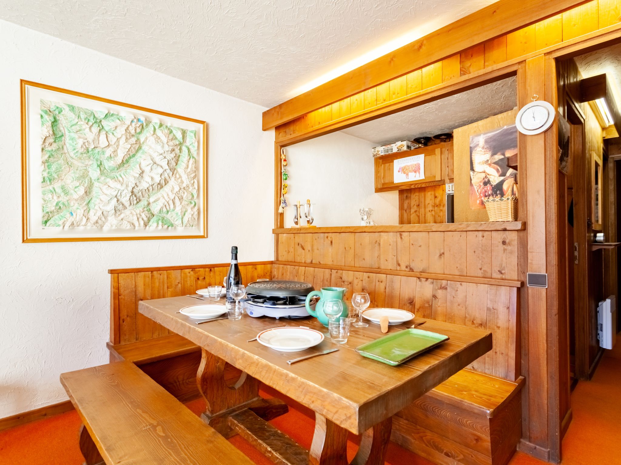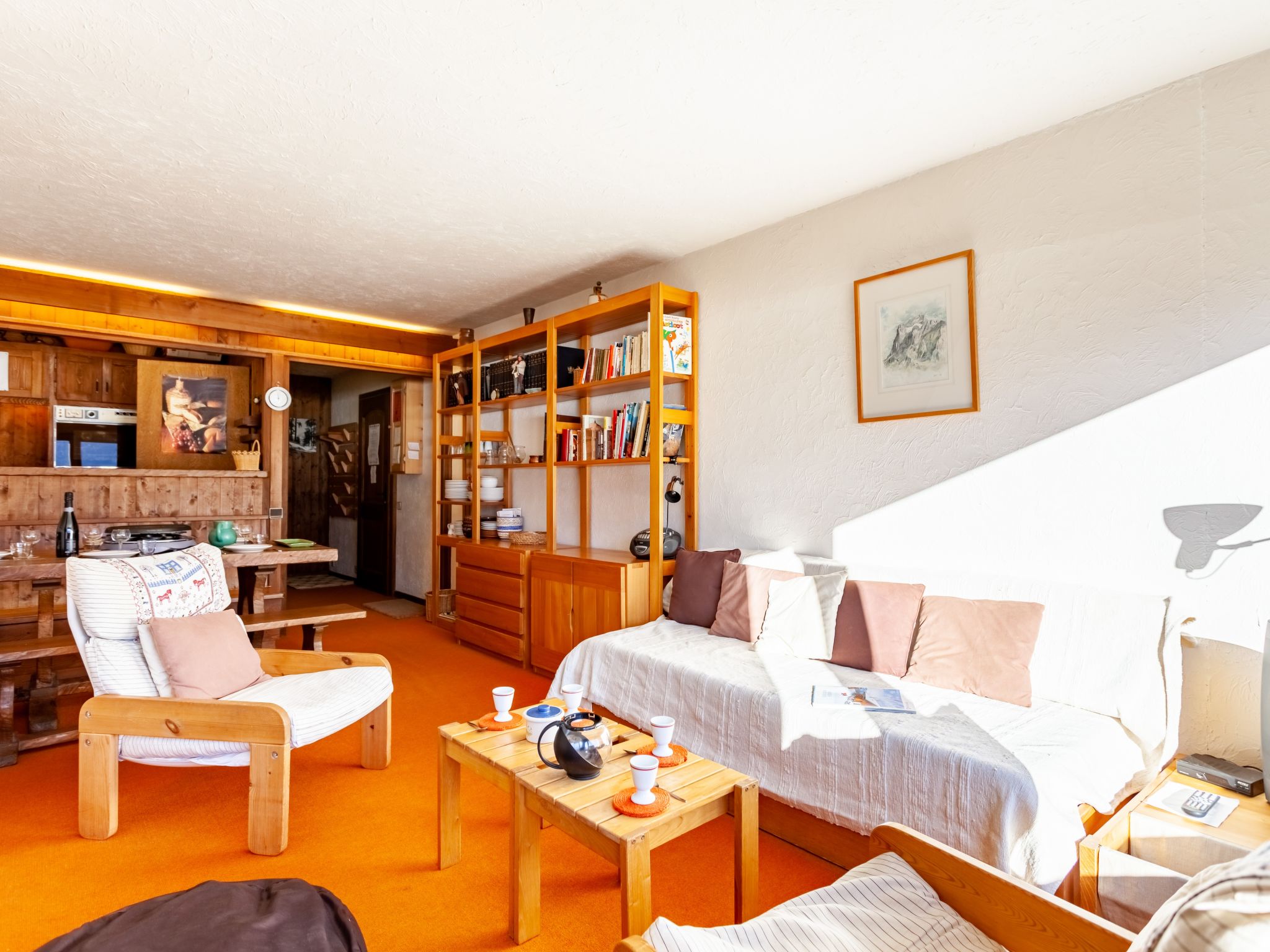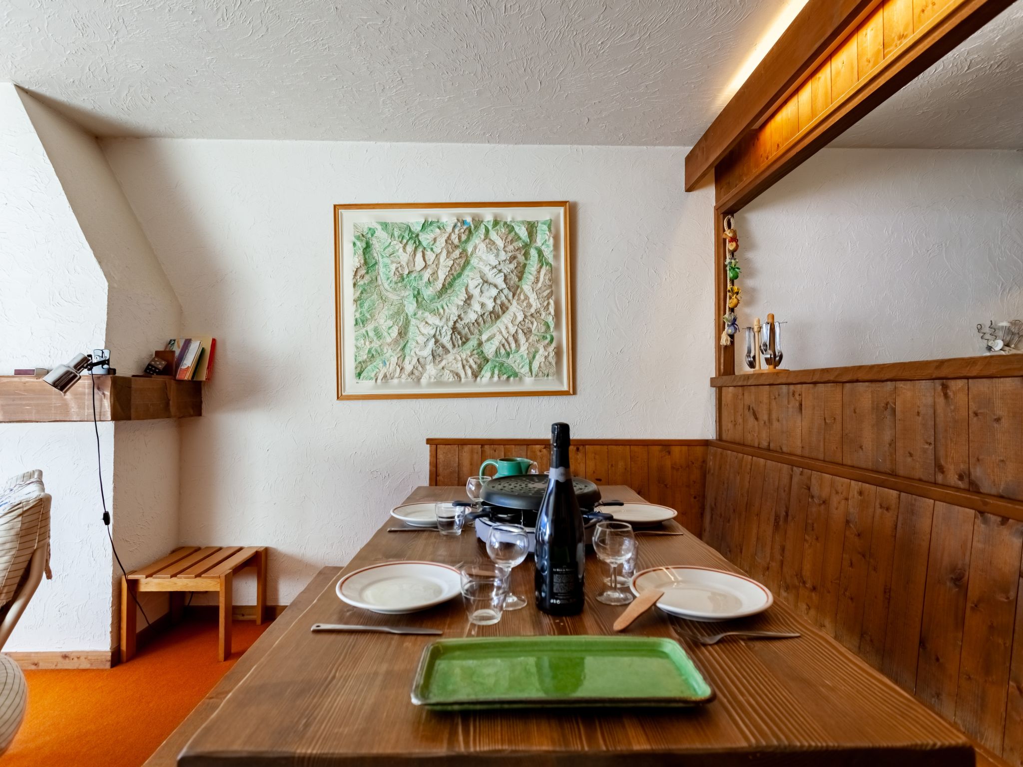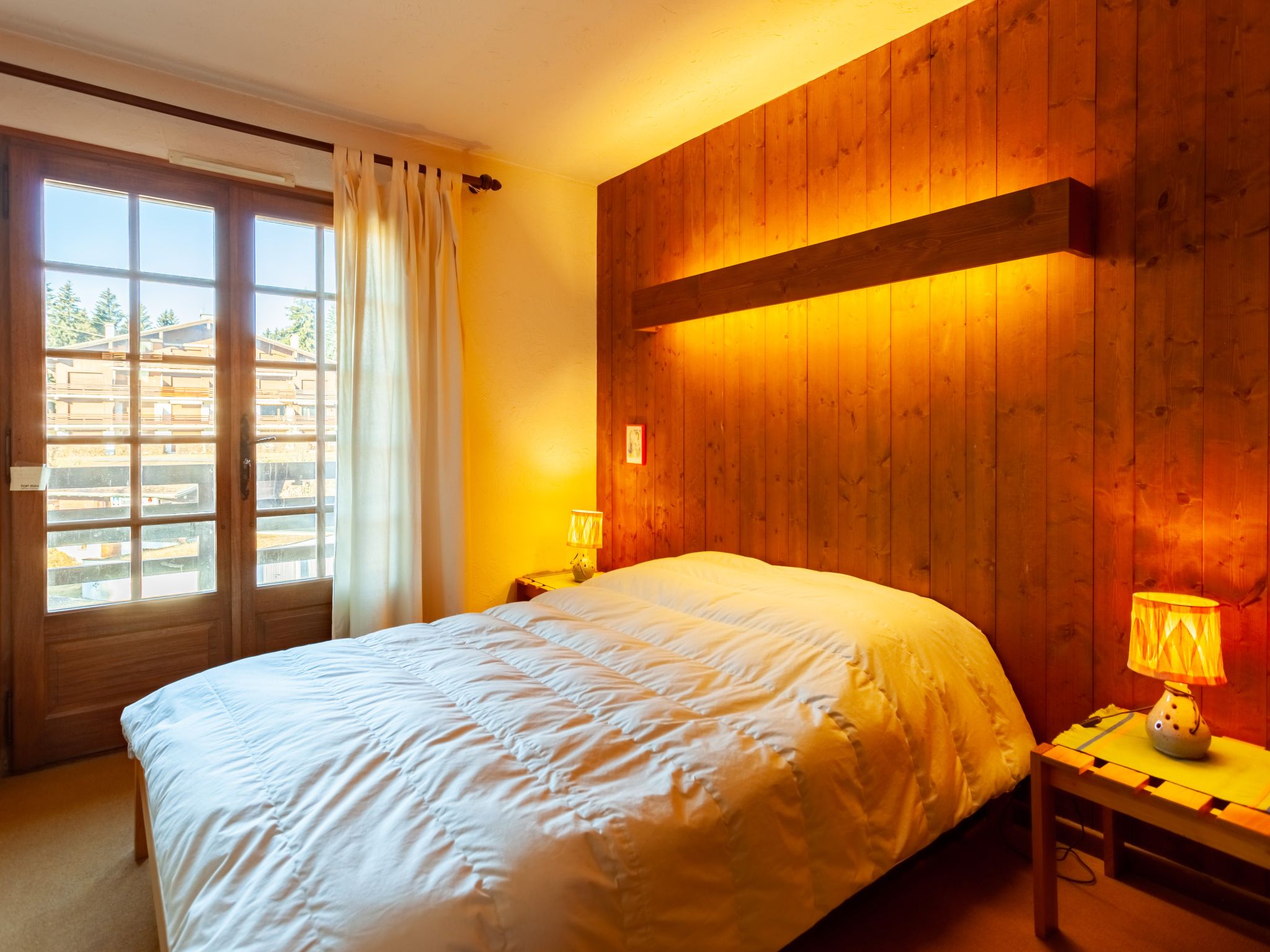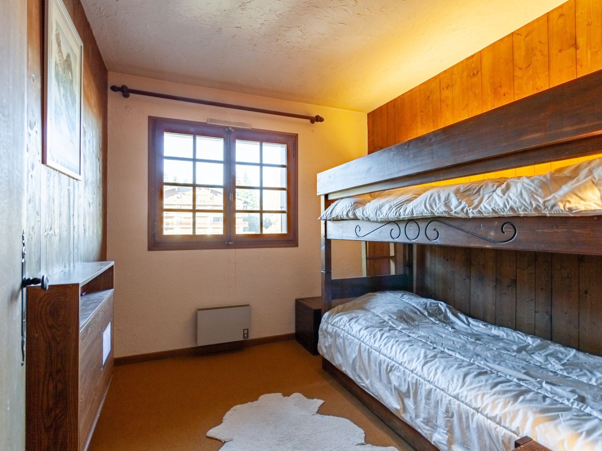 3-Zimmer-Wohnung 73 m2 im 3. Stock. Wohn-/Esszimmer mit 1 Schlafmöglichkeit (80 cm, Länge 190 cm), offenem Kamin (nur Deko), TV. Ausgang zum Balkon. 1 Zimmer mit 1 franz. Bett (140 cm, Länge 190 cm). Ausgang zum Balkon, Richtung Westen. 1 Zimmer mit 1 x 2 Etagenbetten (80 cm, Länge 190 cm). Offene Küche (4 Kochplatten, Backofen, Toaster, Wasserkocher, elektrische Kaffeemaschine, Racletteofen). Bad, Bidet, sep. WC. E-Heizung. Balkon, Ostlage und Südostlage. Sehr schöne Sicht auf die Berge und das Schwimmbad. Zur Verfügung: Internet (Wireless LAN, extra). Parkplatz (1 Auto). Bitte beachten: Kühlschrank ohne Gefrierfach. TV nur FR. Rauchmelder, kein Fahrstuhl.