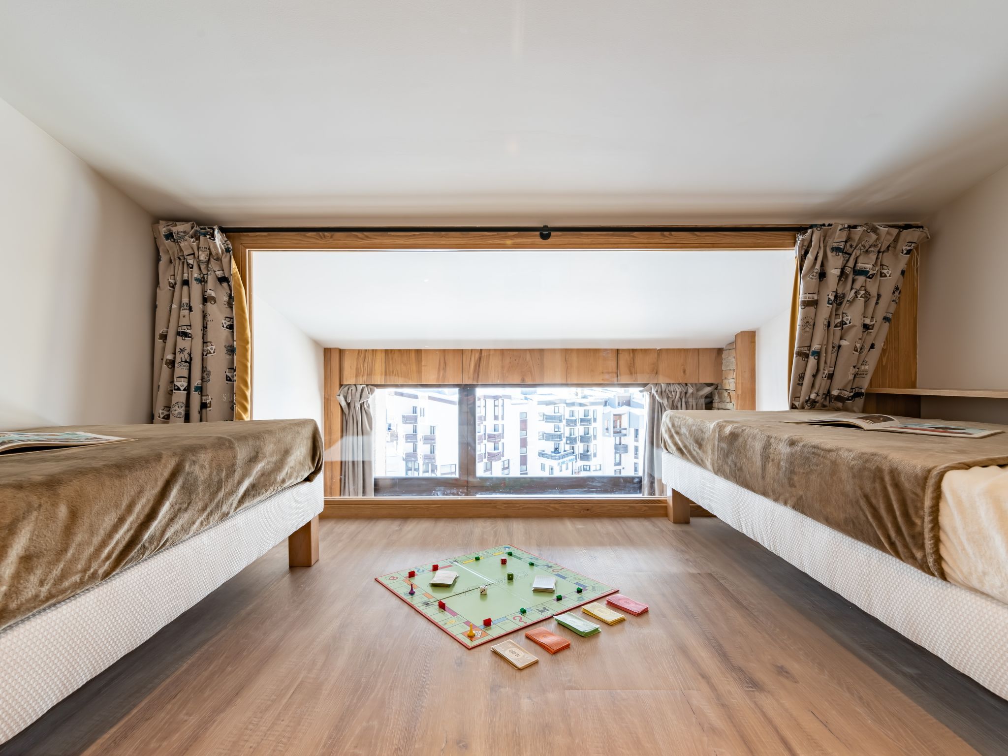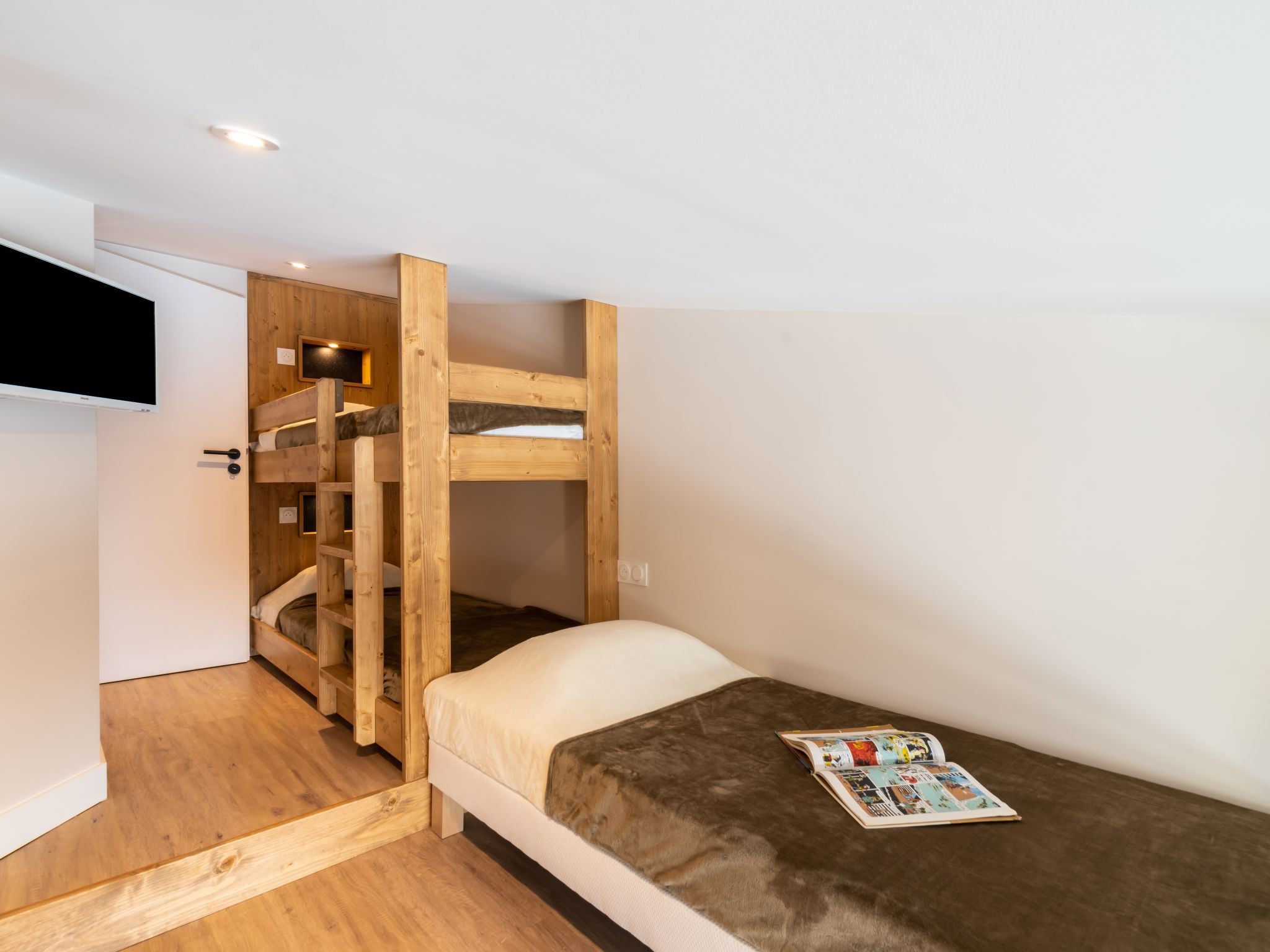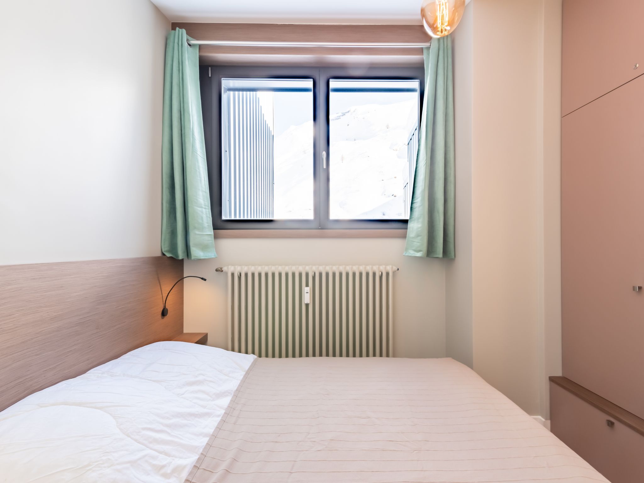 3-Zimmer-Maisonette-Wohnung 56 m2 im 4. Stock. Einfach und zweckmässig eingerichtet: Wohn-/Esszimmer mit TV (Flachbildschirm). Ausgang zum Balkon, Richtung Süden. 1 Zimmer mit 1 franz. Bett (140 cm, Länge 190 cm). Ausgang zum Balkon, Richtung Norden. Kochnische (Geschirrspüler, 3 Glaskeramikherd Platten, Toaster, Wasserkocher, Mikrowelle, elektrische Kaffeemaschine). Bad, sep. WC. Obergeschoss: Galerie mit 2 x 2 Etagenbetten (80 cm, Länge 190 cm). Panoramasicht auf die Berge und die Skipiste. Zur Verfügung: Internet (Wireless LAN, gratis). Bitte beachten: Nichtraucher-Unterkunft. Rauchmelder. Inserat eines gewerblichen Vermieters nach Artikel 155, IV, CGI
