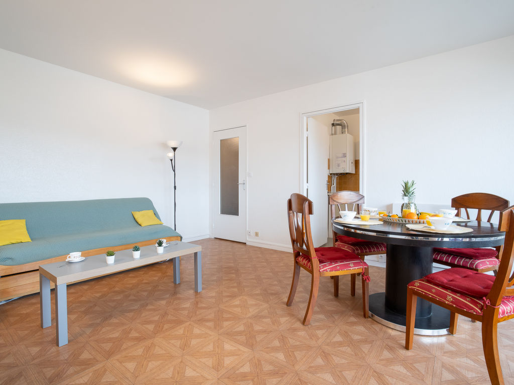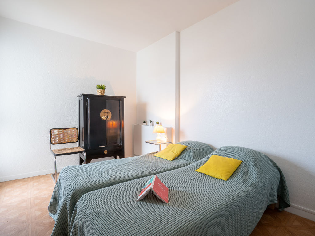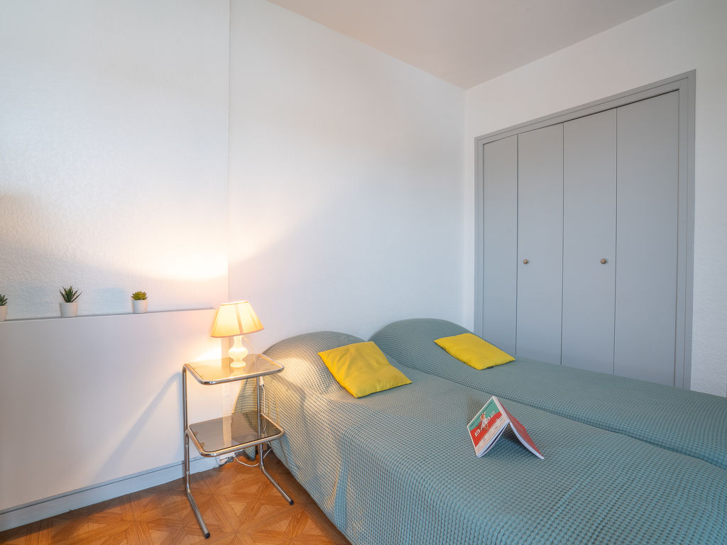 2-Zimmer-Wohnung 48 m2 im 4. Stock, Südlage. Einfach und zweckmässig eingerichtet: Wohn-/Esszimmer mit 2 Ausziehbetten (2 x 90 cm, Länge 180 cm), TV (Flachbildschirm). Ausgang zum Balkon, Richtung Süden. 1 Zimmer mit 1 Doppelbett (2 x 70 cm, Länge 180 cm). Küche (4 Kochplatten, Backofen, Mikrowelle). Bad, sep. WC. Zur Verfügung: Waschmaschine. Internet (Wireless LAN, extra). Parkplatz. Bitte beachten: Rauchmelder. 64122000148C0