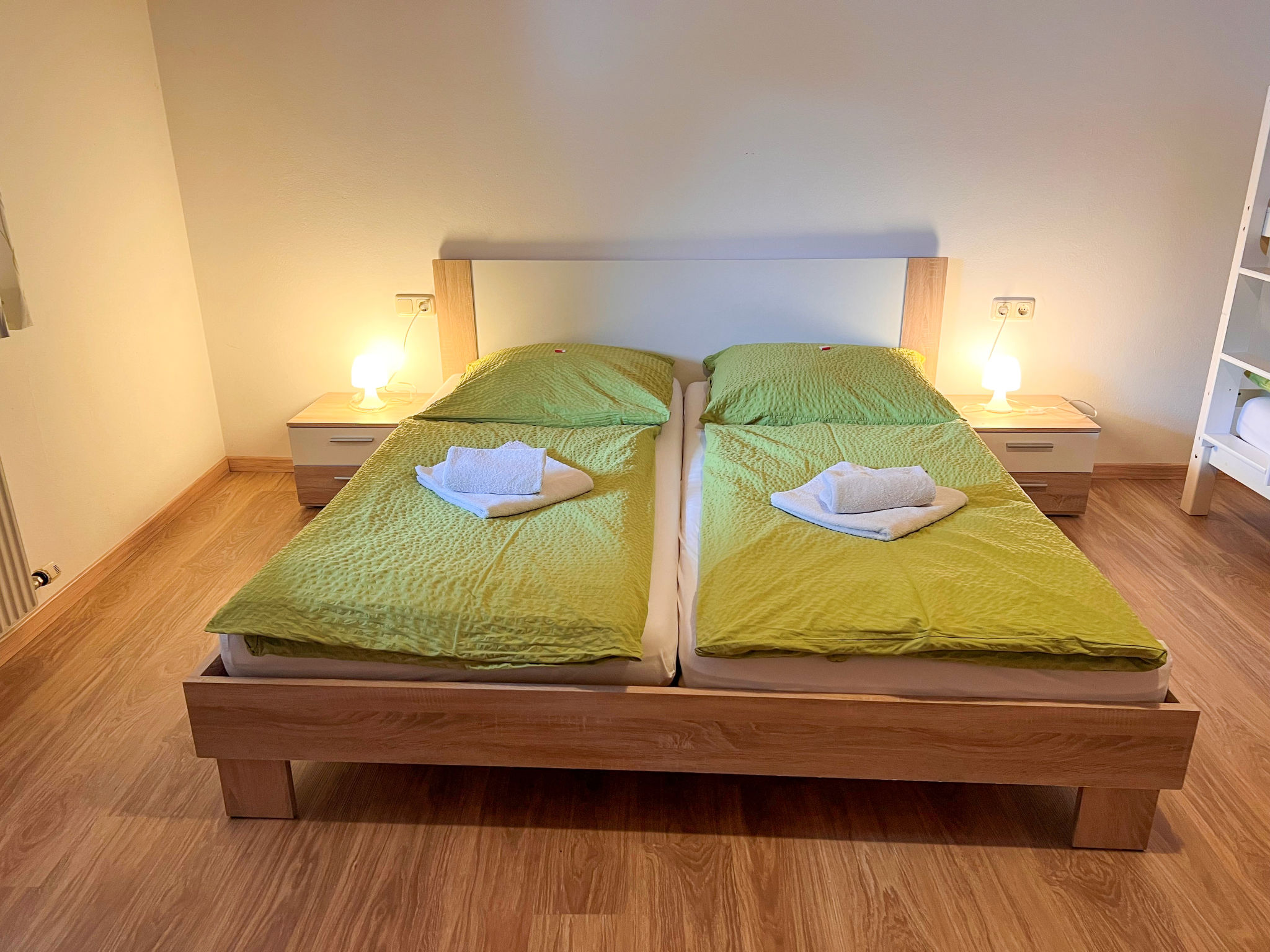 3-Zimmer-Wohnung, 1. Etage, ca. 70 m². Flur mit Garderobe. Wohnraum mit Sitzgruppe, Essplatz (Eckbank), Küchenzeile (4 Ceranfelder, Backofen, Geschirrspüler, Kühlschrank, Kaffeemaschine, Wasserkocher, Toaster) und Balkonausgang. Doppelzimmer mit Balkonausgang. Schlafzimmer mit Doppelbett und Etagenbett. Dusche/Doppelwaschbecken. Sep.WC. Bei Belegung mit weniger Personen als der maximalen Personenzahl stehen nicht alle Wohneinheiten zur Verfügung. 50616-001082-2020