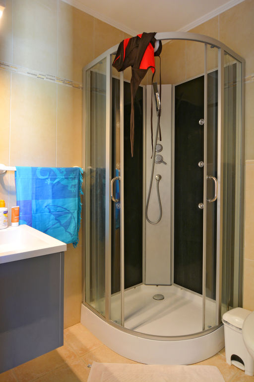 3-Zimmer-Wohnung, Erdgeschoss oder 1. Etage, ca. 65 m². Wohn-/Schlafraum mit Doppelbettcouch (1,60 m breit), Essplatz, Küchenzeile (4 Ceranfelder, Mikrowelle, Geschirrspüler, Kühlschrank, kleiner Gefrierschrank, Kaffeemaschine, Toaster). Schlafzimmer mit franz. Bett (1,60 m breit). Dreibettzimmer. 2x Dusche/WC. Die Wohnung kann auch auf 2 Ebenen angelegt sein.