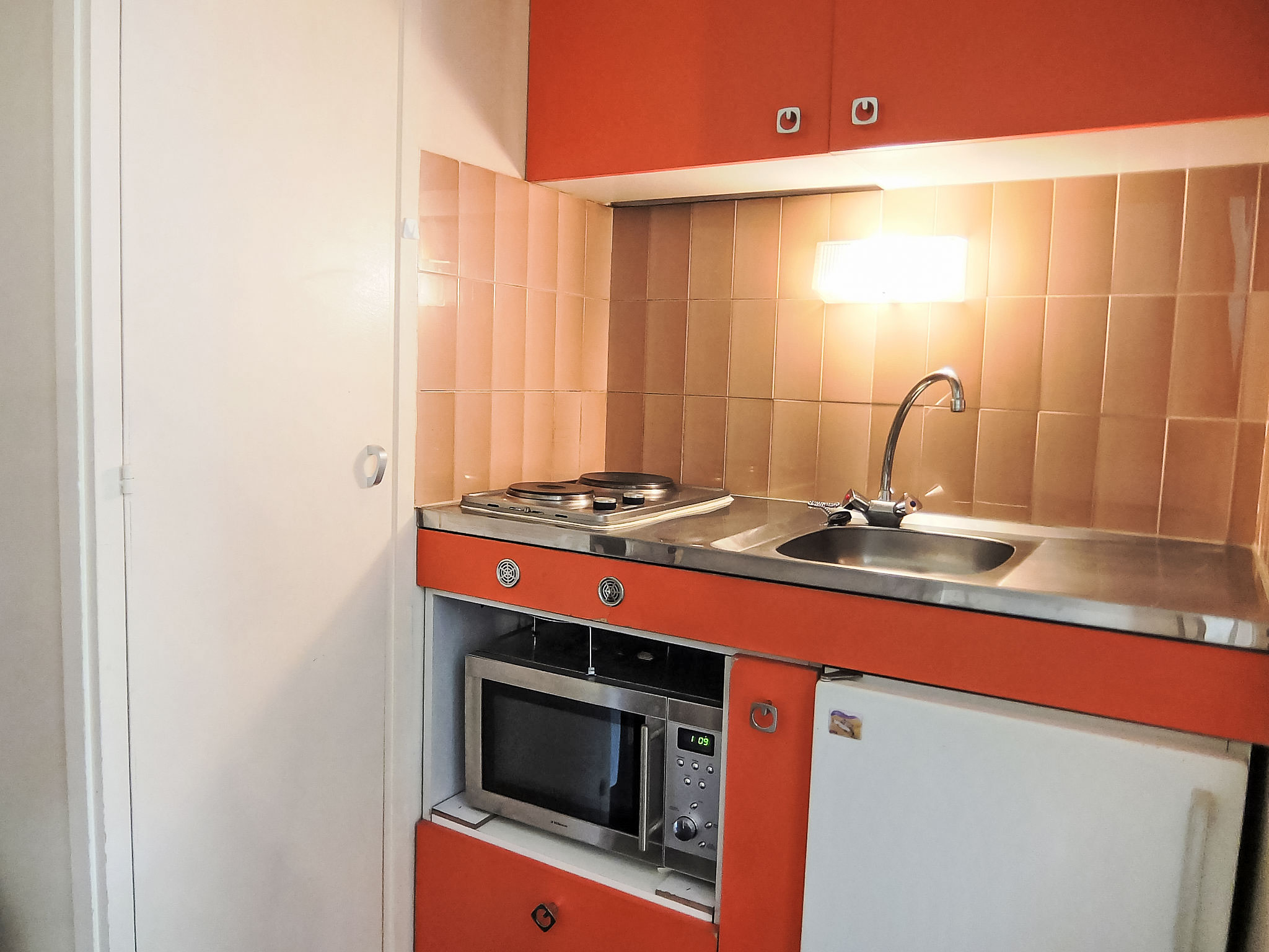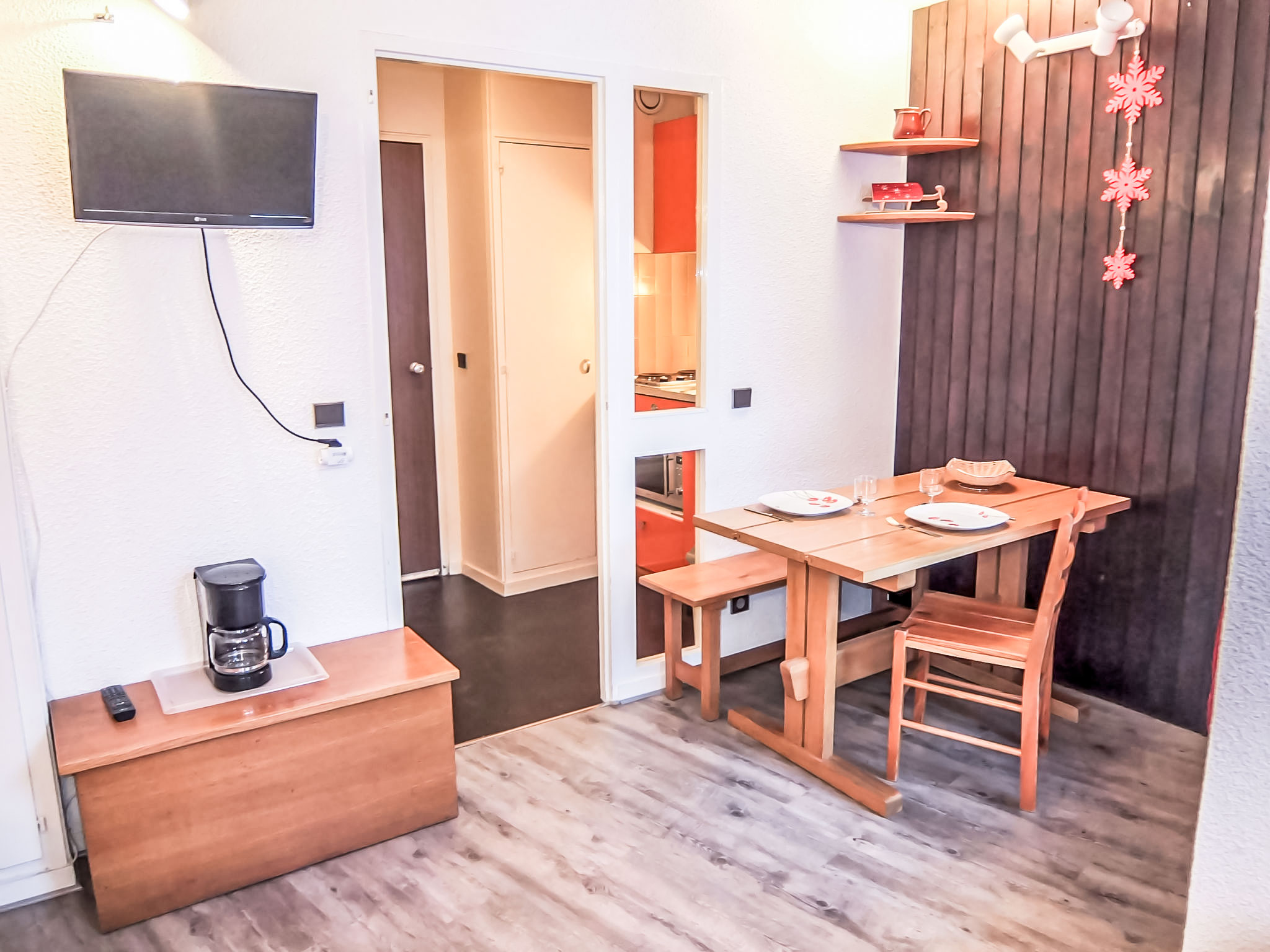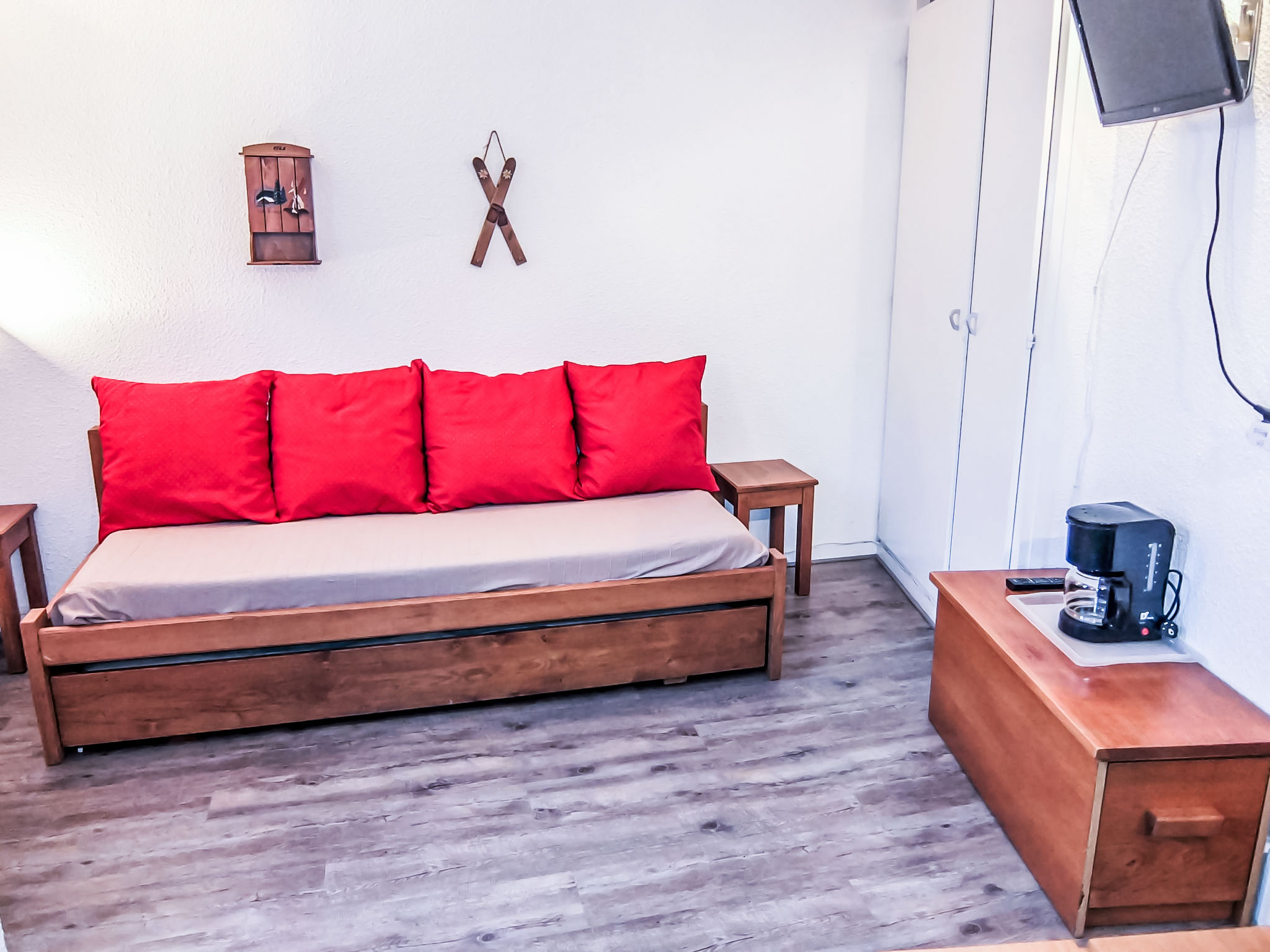 "Armoise 51", 1-Zimmer-Wohnung 18 m2 im 4. Stock. Komfortabel und schön eingerichtet: Wohn-/Esszimmer mit 1 Ausziehbett (2 Pers. 2 x 80 cm), TV (Flachbildschirm). Ausgang zum Balkon. Kochnische im Eingang (2 Kochplatten, Wasserkocher, Mikrowelle, elektrische Kaffeemaschine). Dusche/WC. E-Heizung. Balkon, Nordostlage. Zur Verfügung: Internet (Wireless LAN, extra). Bitte beachten: Rauchmelder. Inserat einer Privatperson nach Artikel 155, IV, CGI.