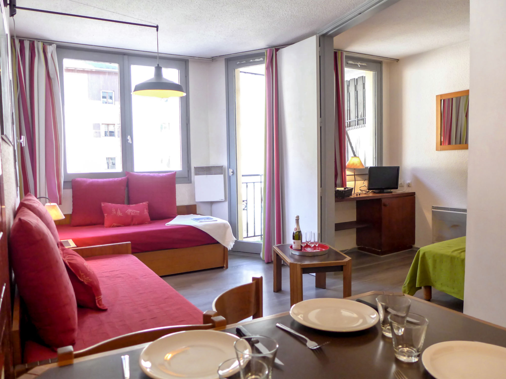 2-Zimmer-Wohnung 28 m2 im 2. Stock. Esszimmer mit 2 Betten (80 cm, Länge 190 cm), TV. Ausgang zum Balkon. Schlafnische mit 1 franz. Bett (140 cm, Länge 190 cm). Kochnische (4 Kochplatten, Geschirrspüler, Wasserkocher, Mikrowelle, elektrische Kaffeemaschine). Bad, sep. WC. E-Heizung. Kleiner Balkon, Südlage. Schöne Sicht auf die Berge. Zur Verfügung: Internet (Wireless LAN, extra). Bitte beachten: kein Parkplatz. TV nur FR. Rauchmelder. Inserat einer Privatperson nach Artikel 155, IV, CGI.