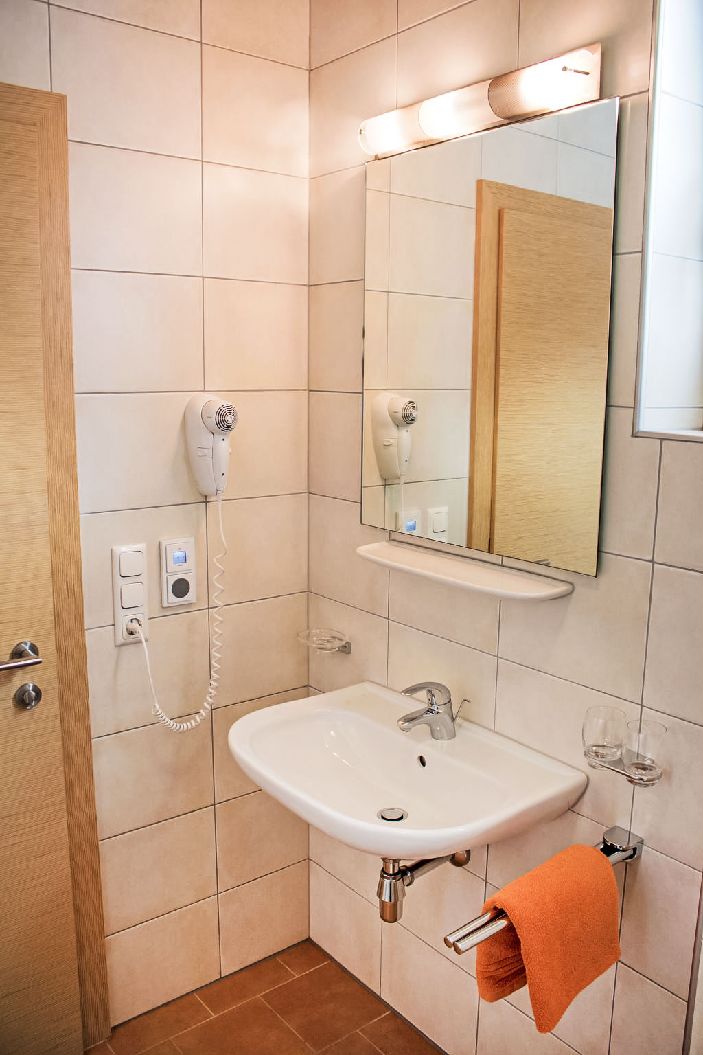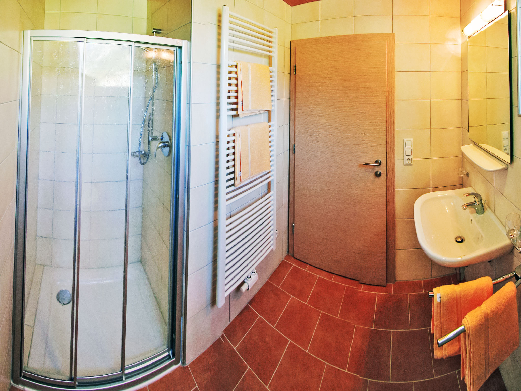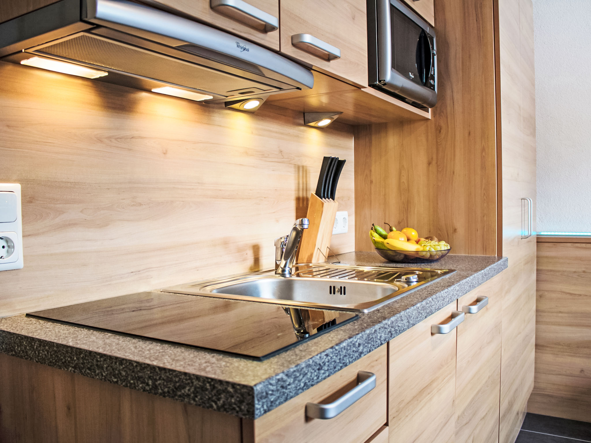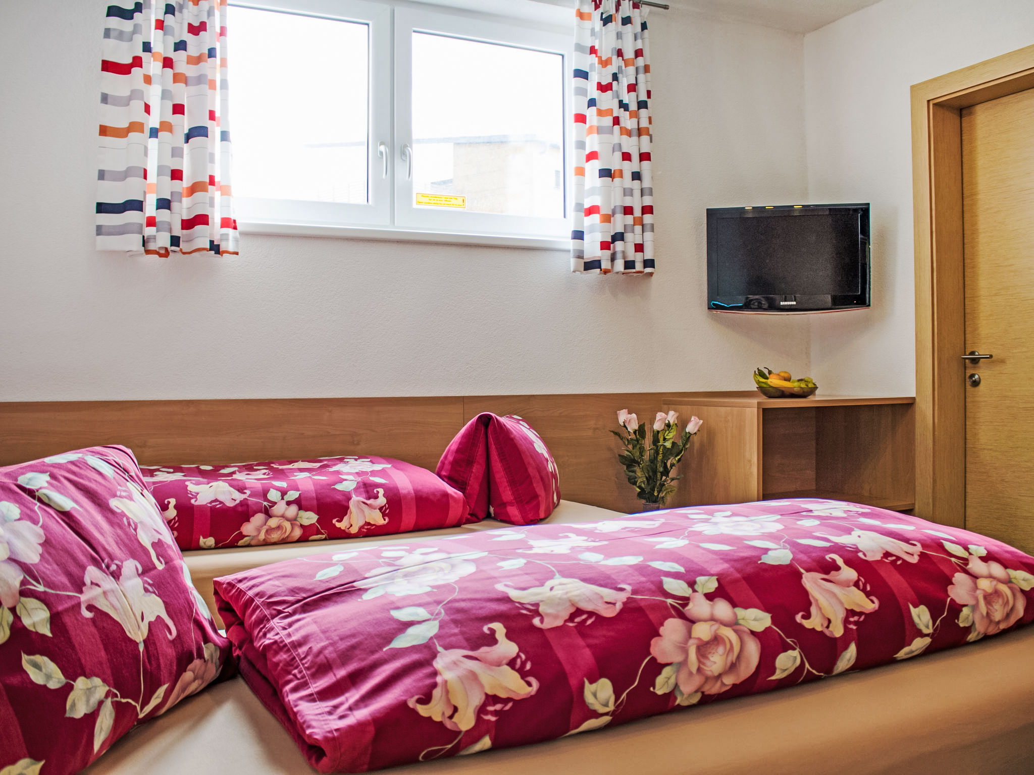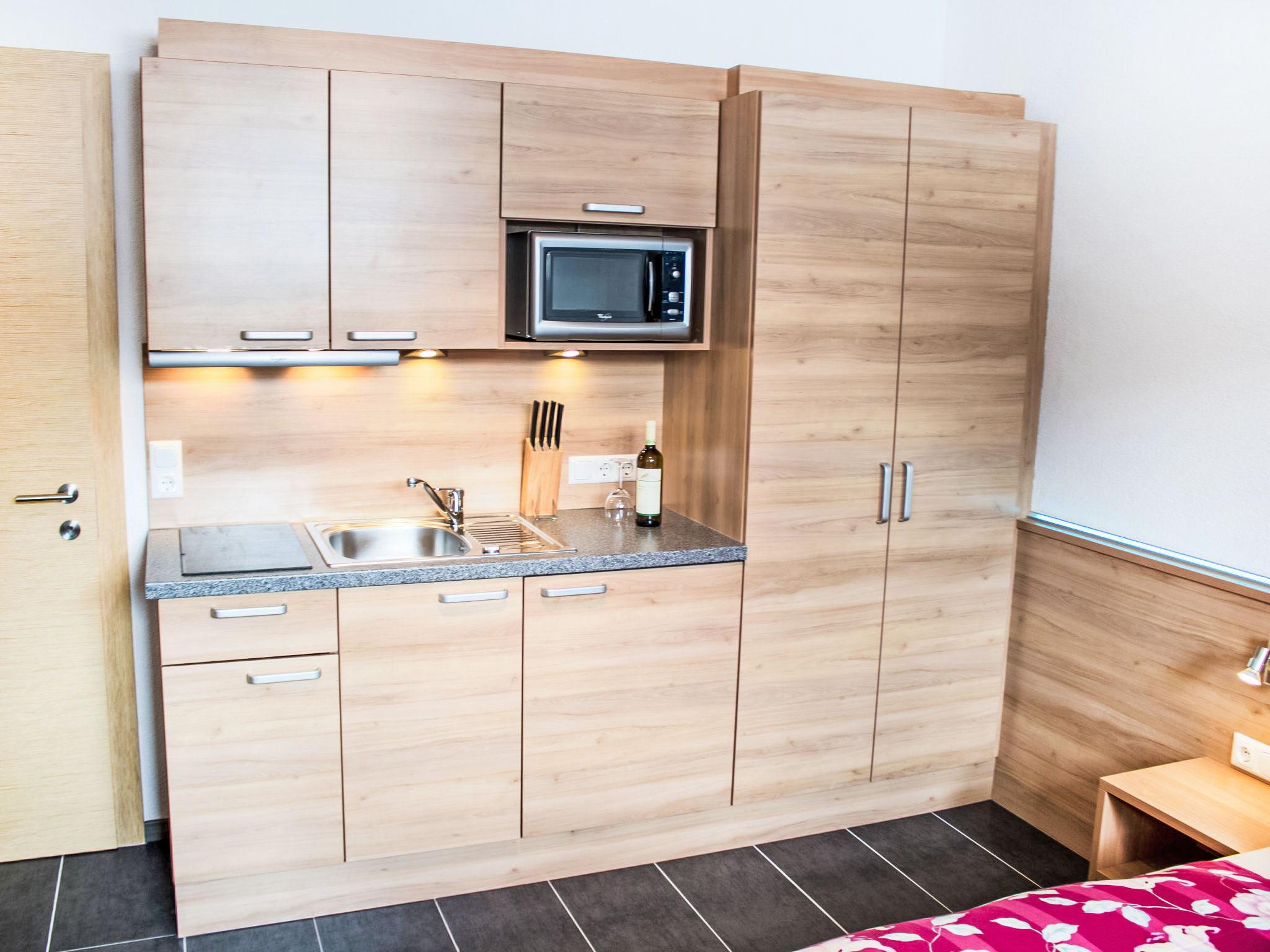1-Zimmer-Wohnung 20 m2, unteres Geschoss. Gemütlich eingerichtet: Wohn-/Schlafzimmer mit 1 Doppelbett, Esstisch und Kabel-TV (Flachbildschirm). Kochnische (2 Glaskeramikherd Platten, Toaster, Wasserkocher, Mikrowelle, elektrische Kaffeemaschine). Dusche/WC. Zur Verfügung: Internet (Wireless LAN, gratis). Bitte beachten: Nichtraucher-Unterkunft. 1 Haustier/Hund erlaubt. Boxspringbett auch zum Auseinanderschieben in 2 Einzelbetten.