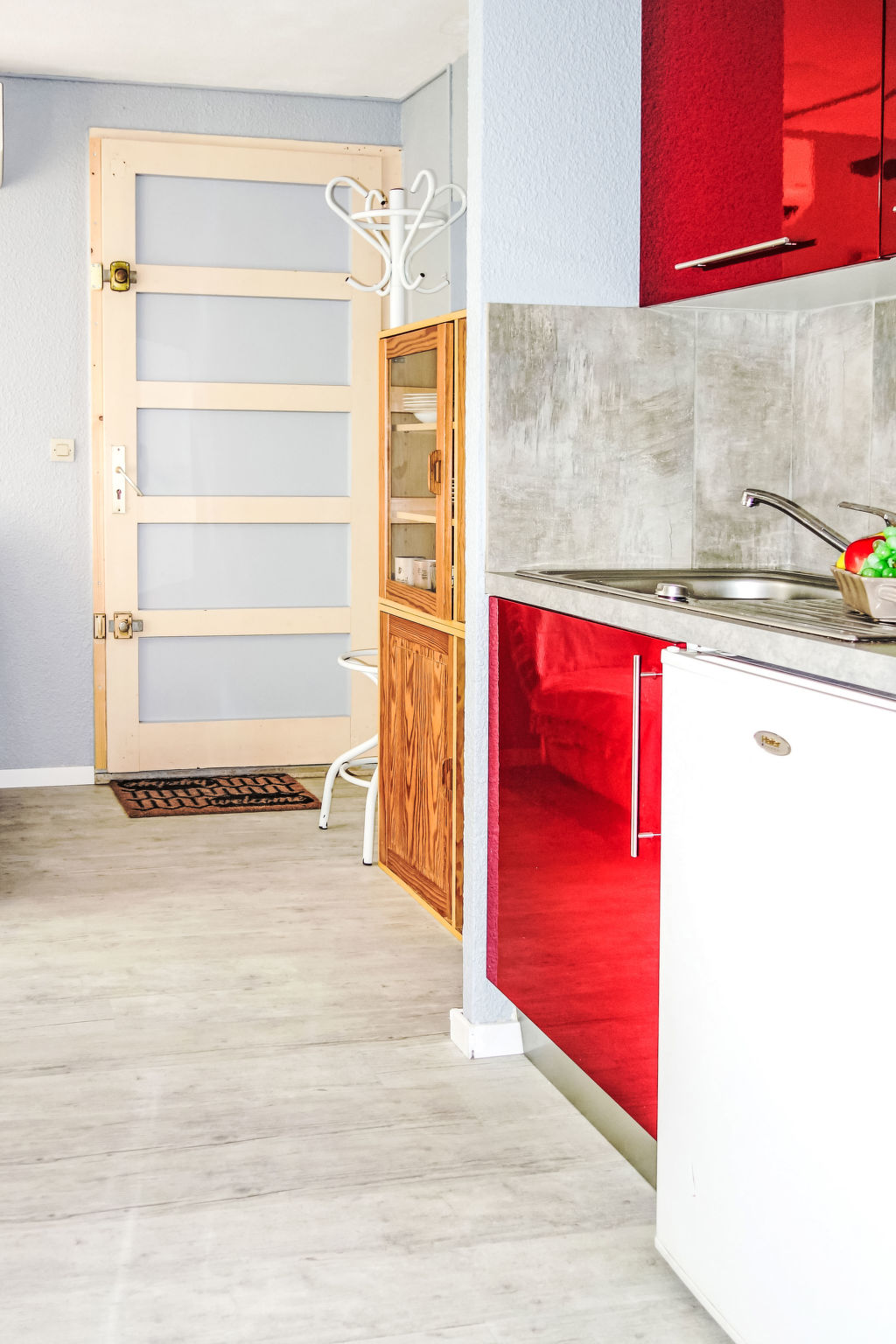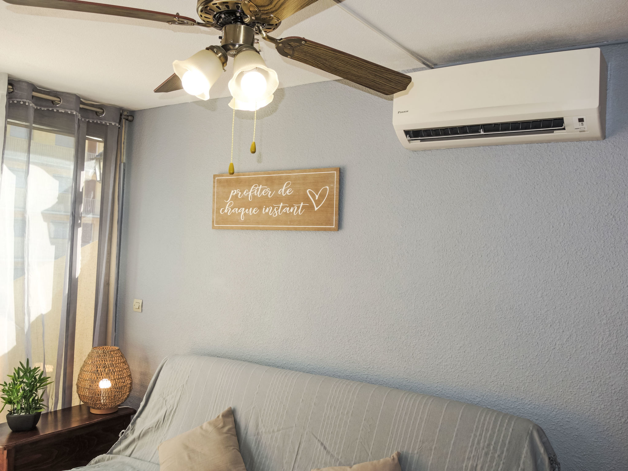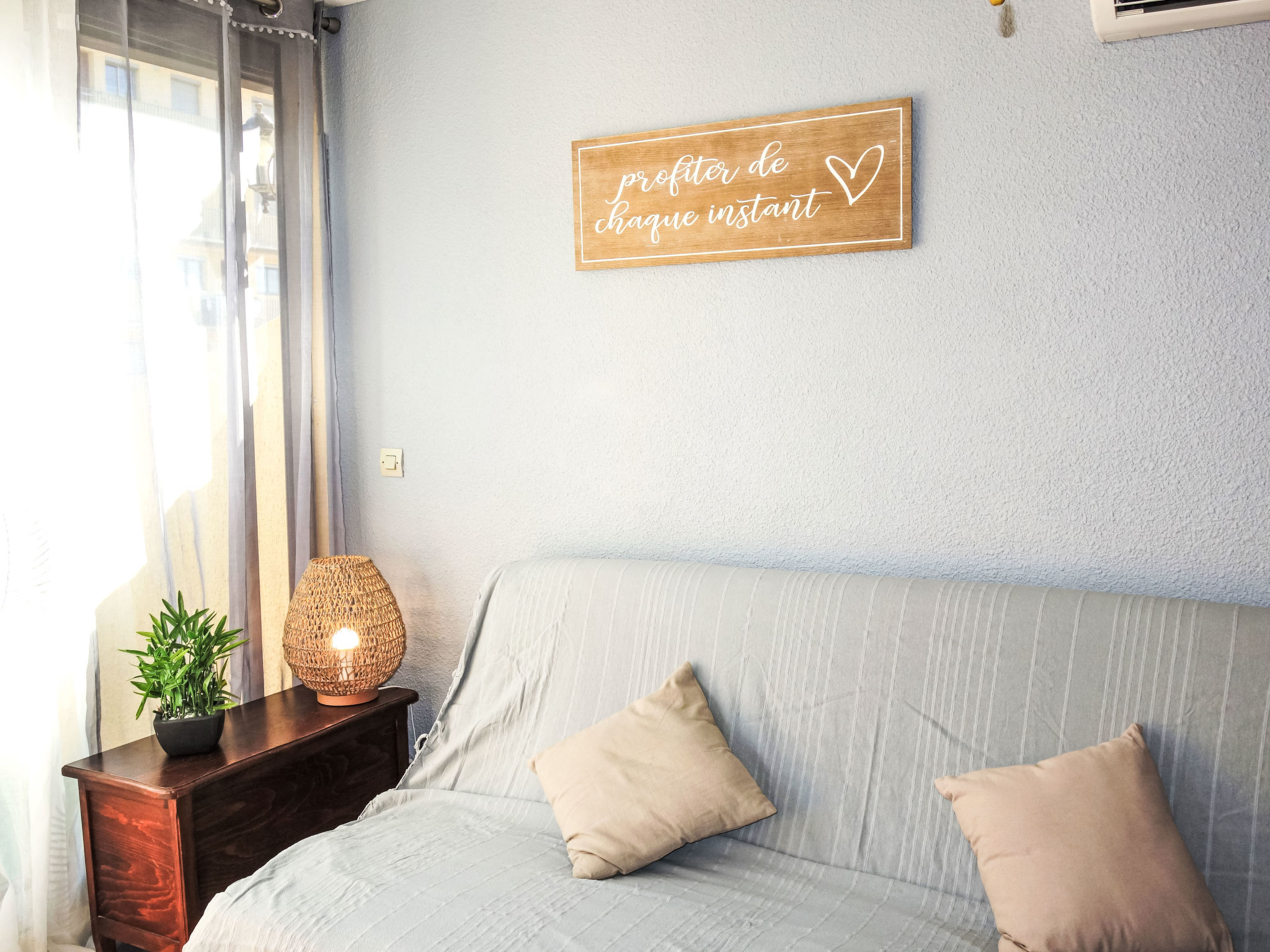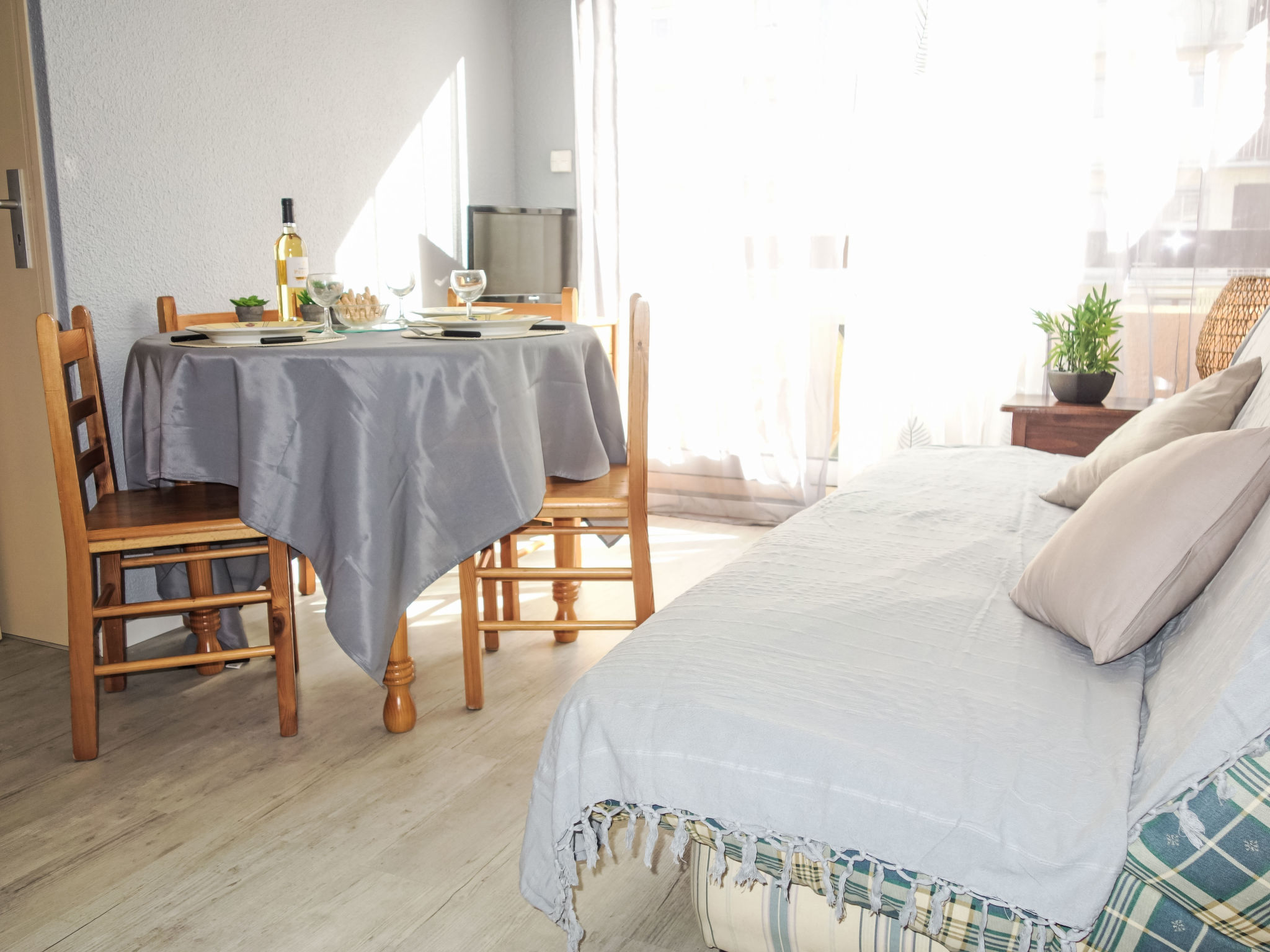 2-Zimmer-Wohnung 20 m2 im 2. Stock. Wohn-/Esszimmer mit 1 Doppeldiwanbett (130 cm, Länge 190 cm), TV (Flachbildschirm). Ausgang zum Balkon. 1 kleines Zimmer mit 1 franz. Bett (140 cm, Länge 190 cm). Kochnische (2 Kochplatten, Mikrowelle, elektrische Kaffeemaschine). Dusche/WC. Klimaanlage. Kleiner Balkon. Balkonmöbel. Zur Verfügung: Internet (Wireless LAN, extra). Bitte beachten: Rauchmelder. Inserat einer Privatperson nach Artikel 155, IV, CGI.