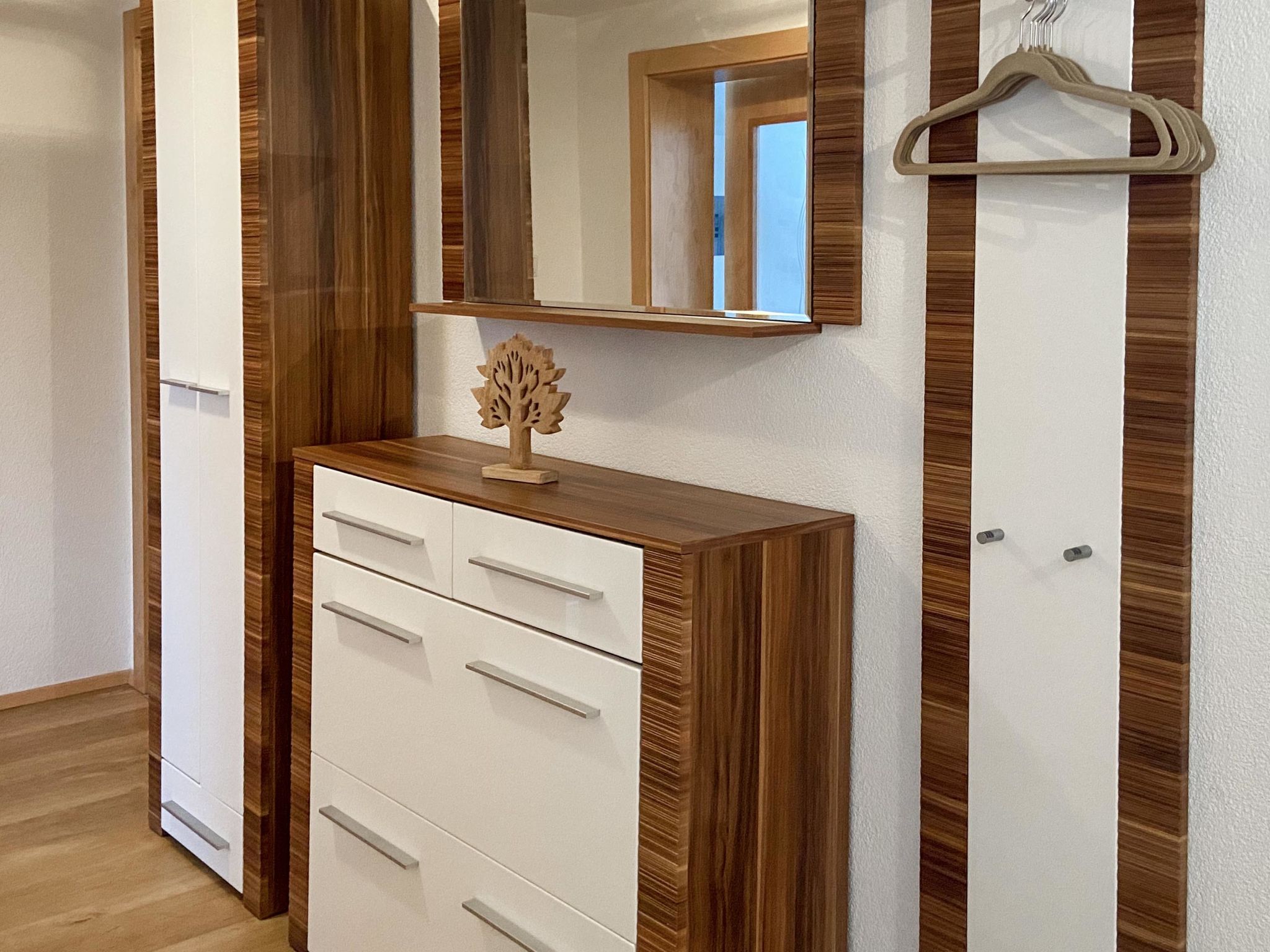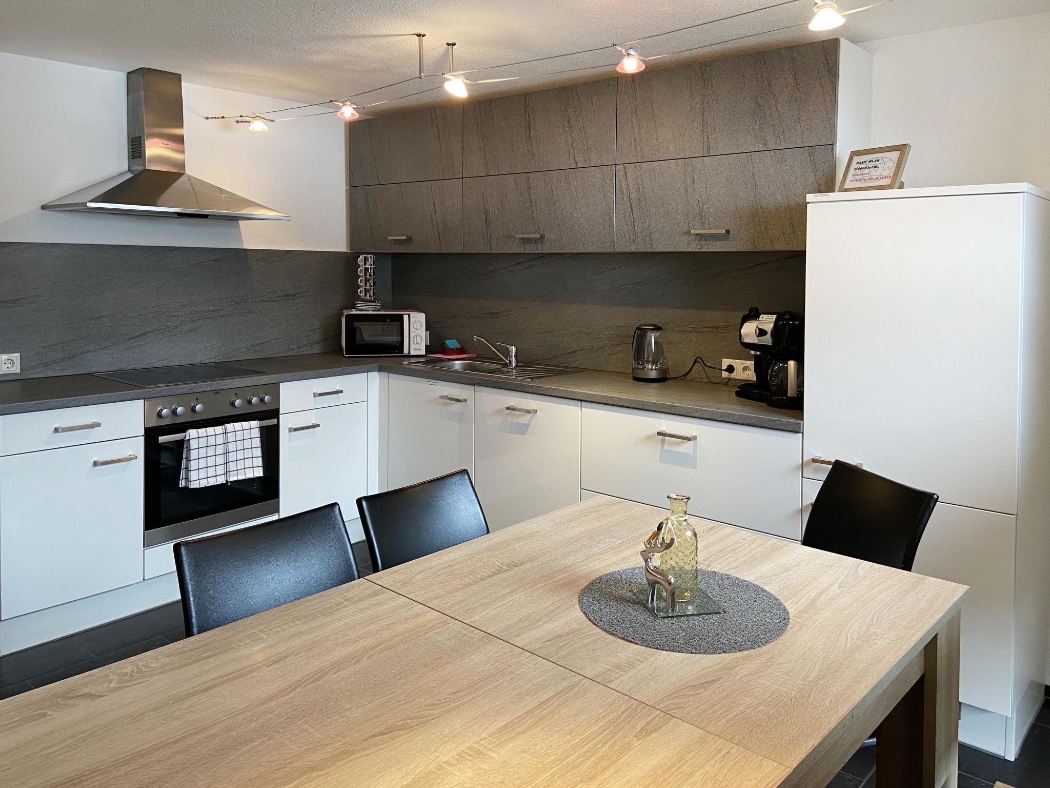 3-Zimmer-Wohnung, 1. Etage (leichte Dachschräge), ca. 80 m². Diele. Wohn-/Schlafraum mit Sitzgruppe/Doppelbettcouch, Essplatz (Bank, Stühle), Küchenzeile (4 Ceranfelder, Backofen, Mikrowelle, Geschirrspüler, Kühlschrank, kleiner Gefrierschrank, Kaffeemaschine, Wasserkocher, Toaster) und Balkonausgang. Doppelzimmer mit Balkonausgang. Zweibettzimmer. Bad/Dusche. Sep.WC.