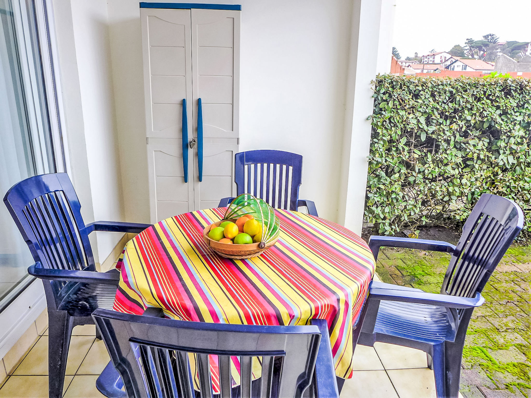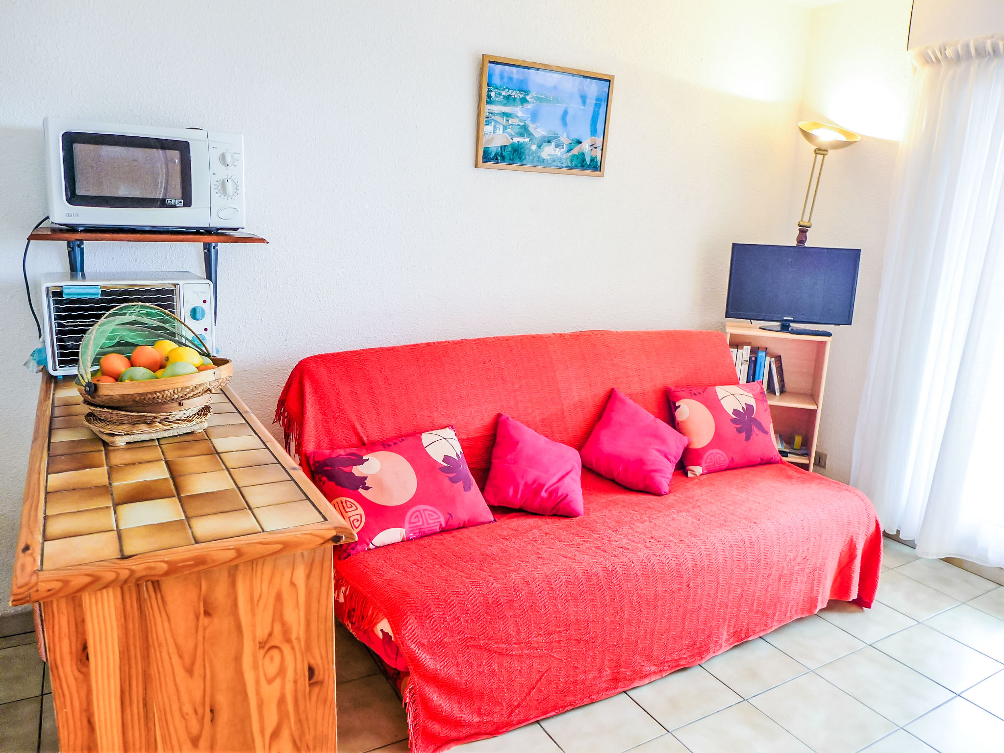1-Zimmer-Wohnung 29 m2, im Erdgeschoss. Einfach und schön eingerichtet: Wohn-/Esszimmer mit 1 Wandklappbett (140 cm, Länge 190 cm), TV (Flachbildschirm). Ausgang zur Terrasse. Kabine mit 1 x 2 Etagenbetten (90 cm, Länge 190 cm). Offene Küche (Mini-Backofen, 2 Glaskeramikherd Platten, Mikrowelle, elektrische Kaffeemaschine). Dusche, sep. WC. E-Heizung. Terrasse 8 m2, Westlage, Gartensitzplatz 25 m2. Terrassenmöbel. Zur Verfügung: Waschmaschine, Bügeleisen, Haartrockner. Parkplatz Nr. 125. Inserat einer Privatperson nach Artikel 155, IV, CGI. 641250005327D