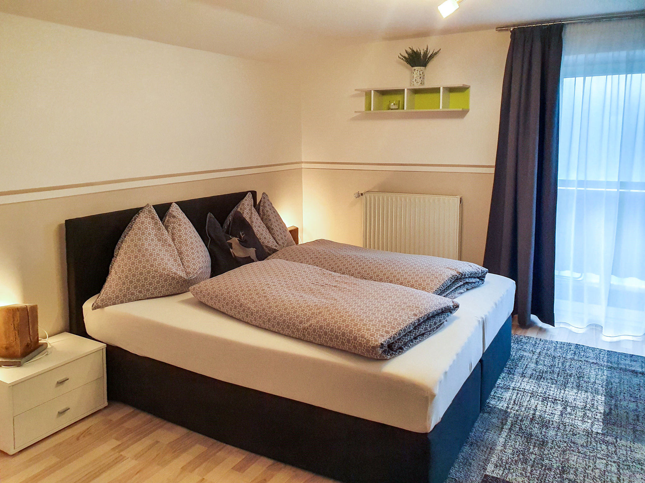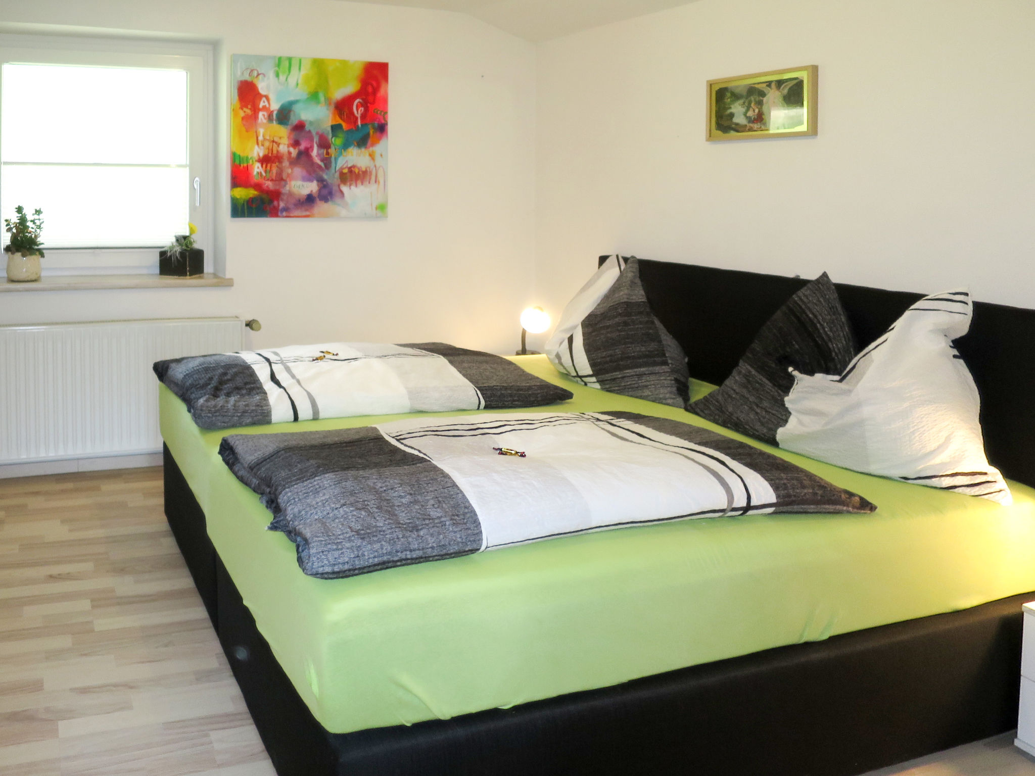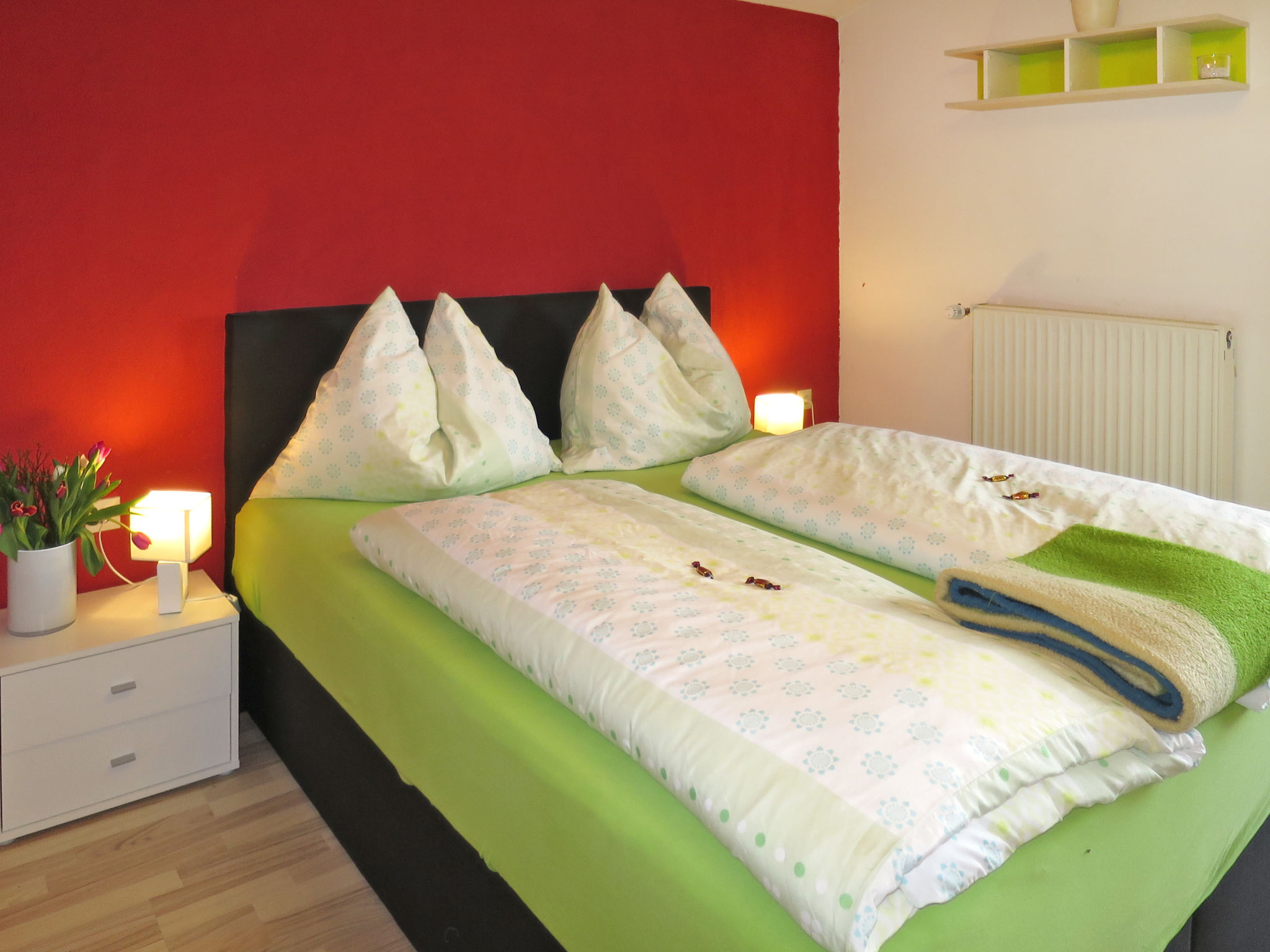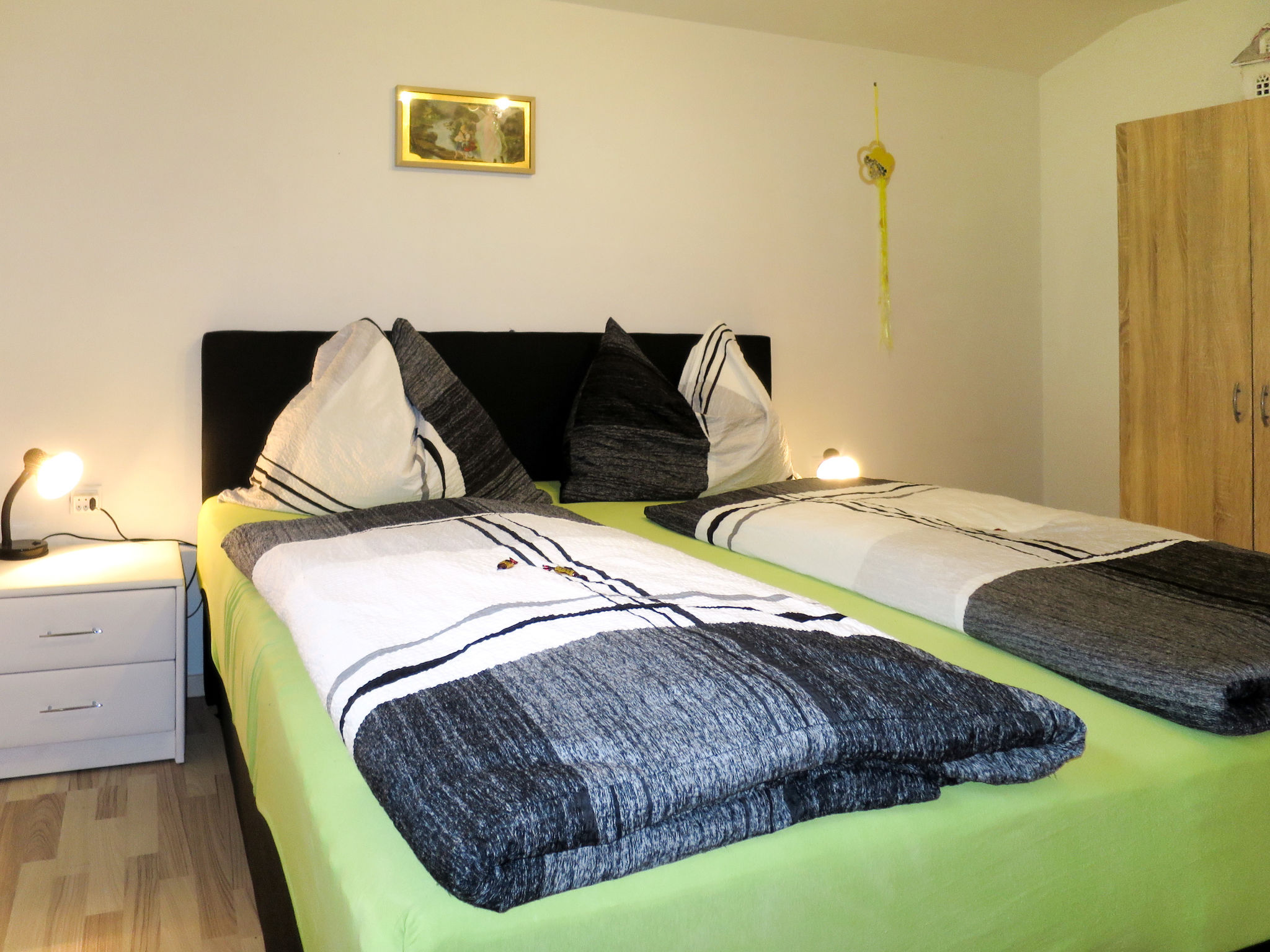 4-Zimmer-Wohnung, 2. Etage (zum Hang 1. Etage), ca. 80 m². Separater Zugang über Außentreppe. Flur mit Garderobe. Wohn-/Schlafraum mit Doppelbettcouch (als Zusatzbett, siehe Nebenkosten), Balkonausgang. Küche (4 Ceranfelder, Backofen, Mikrowelle, Geschirrspüler, Kühlschrank, Kaffeemaschine, Wasserkocher, Toaster) mit Essplatz (Eckbank), Balkonausgang. 2 Doppelzimmer. Schlafzimmer mit Doppelbett und Einzelbett. Dusche. Sep.WC. Bei Belegung mit weniger Personen als der maximalen Personenzahl stehen nicht alle Wohneinheiten zur Verfügung. 50417-000437-2020