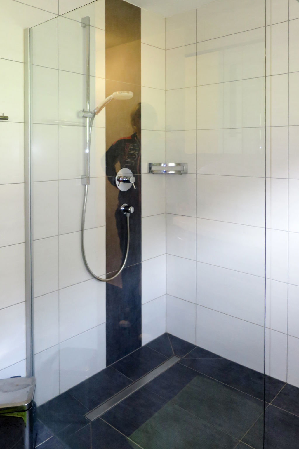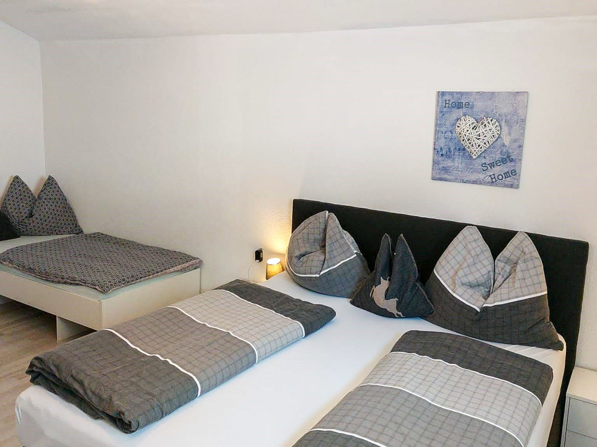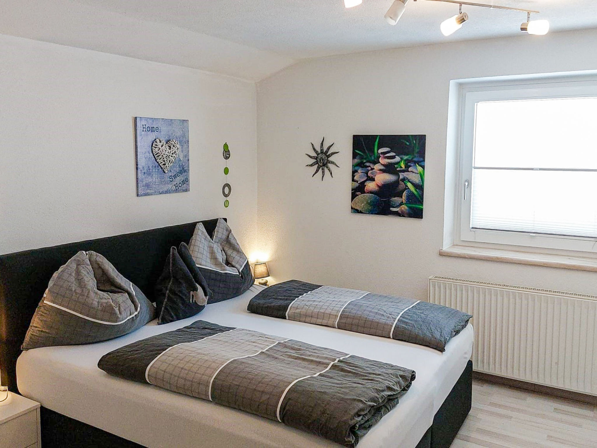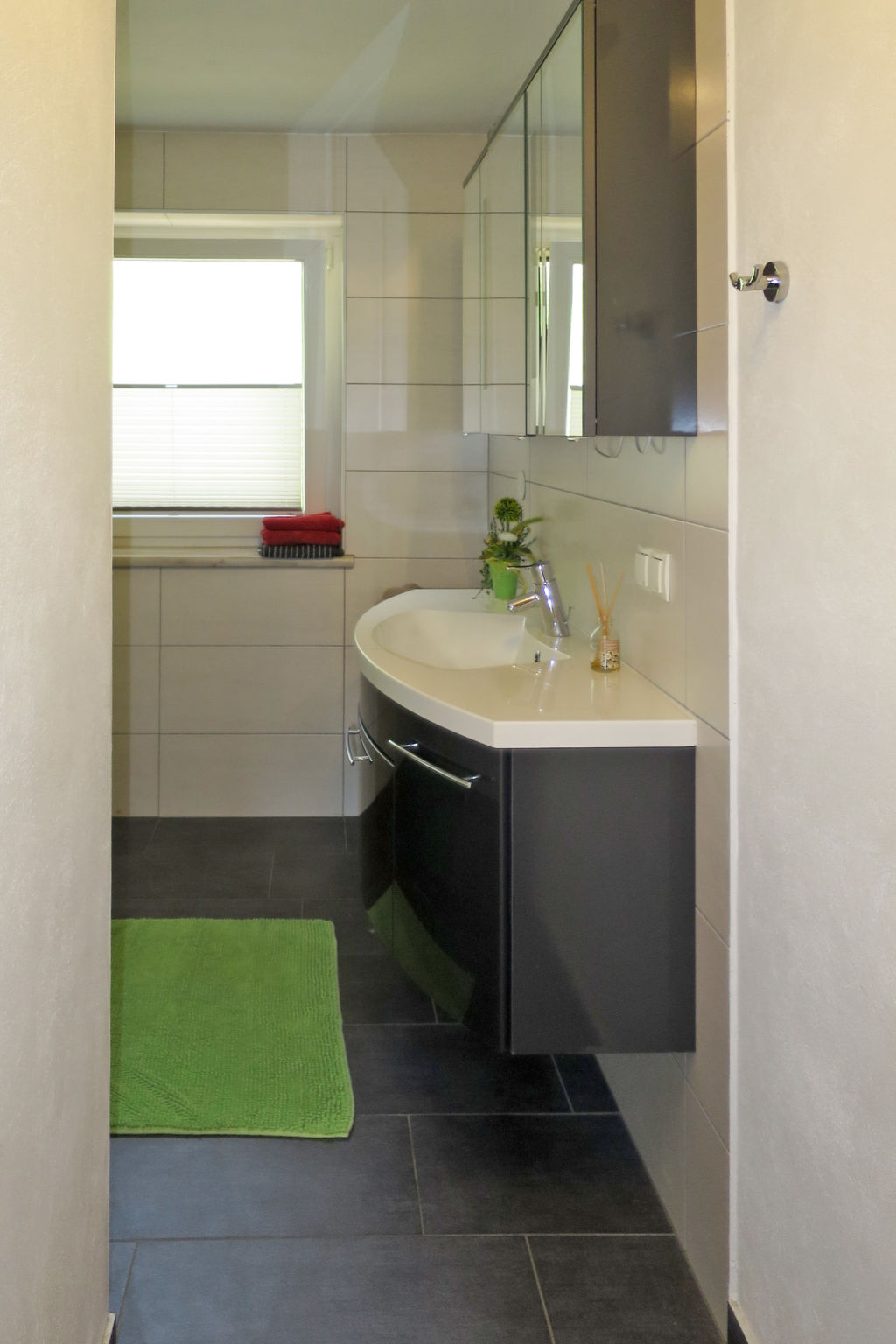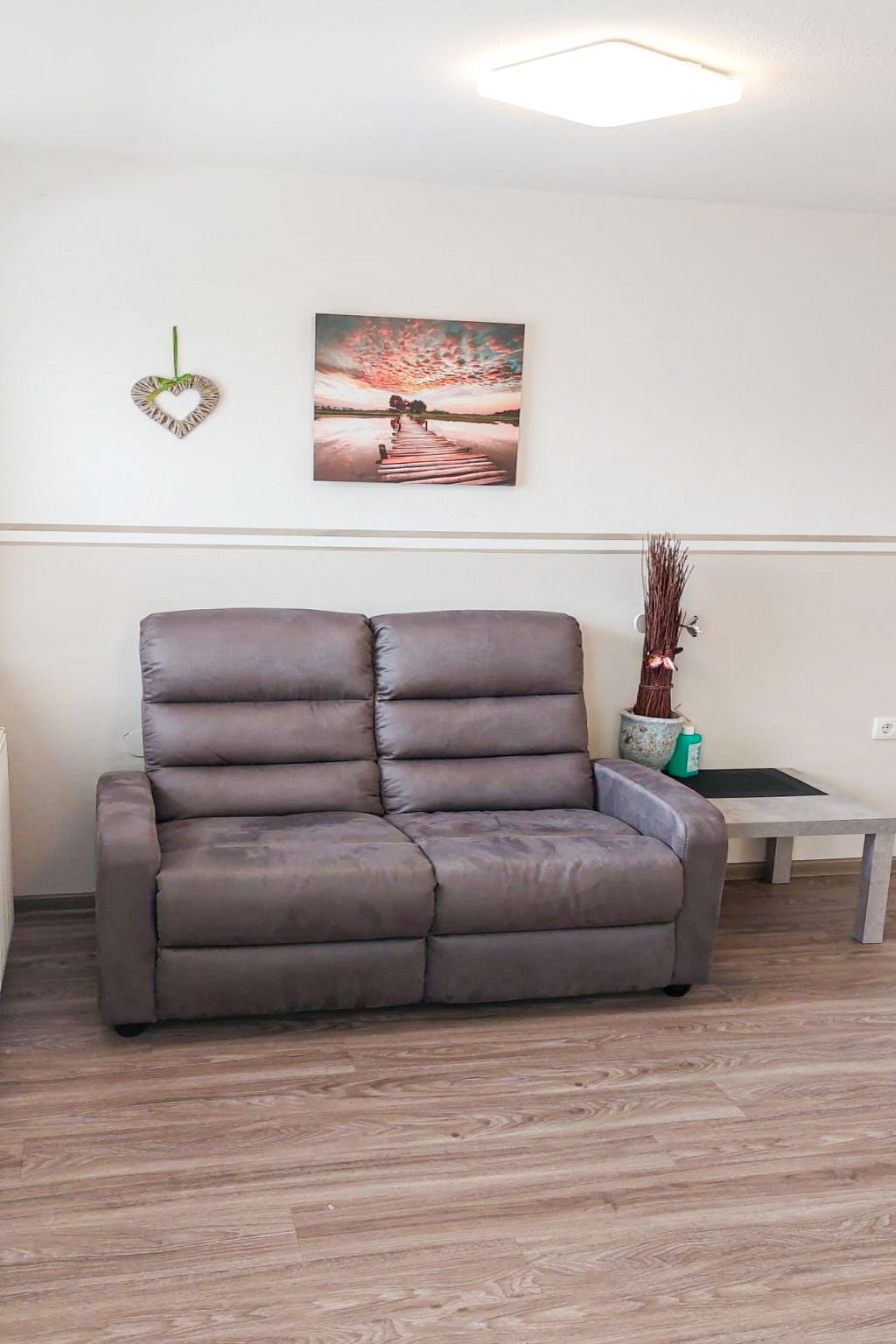 4-Zimmer-Wohnung, 2. Etage (zum Hang 1. Etage), ca. 80 m². Separater Zugang über Außentreppe. Flur mit Garderobe. Wohn-/Schlafraum mit Doppelbettcouch (als Zusatzbett, siehe Nebenkosten), Balkonausgang. Küche (4 Ceranfelder, Backofen, Mikrowelle, Geschirrspüler, Kühlschrank, Kaffeemaschine, Wasserkocher, Toaster) mit Essplatz (Eckbank), Balkonausgang. 2 Doppelzimmer. Schlafzimmer mit Doppelbett und Einzelbett. Dusche. Sep.WC. Bei Belegung mit weniger Personen als der maximalen Personenzahl stehen nicht alle Wohneinheiten zur Verfügung. 50417-000437-2020