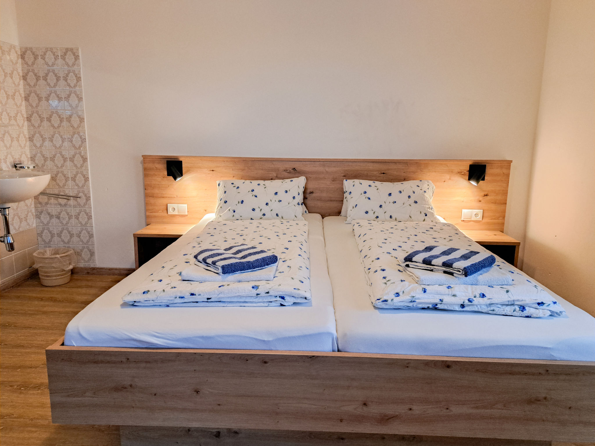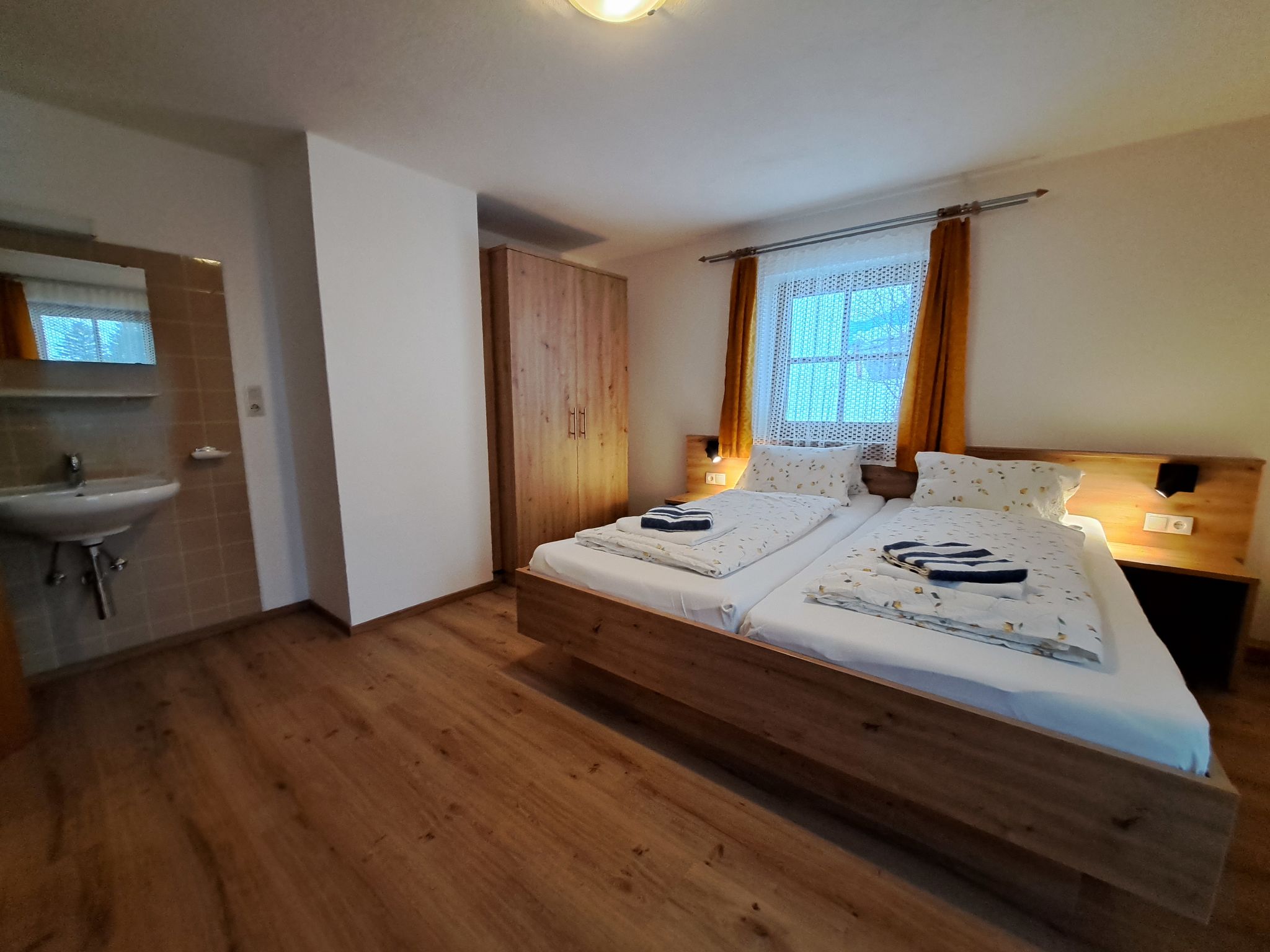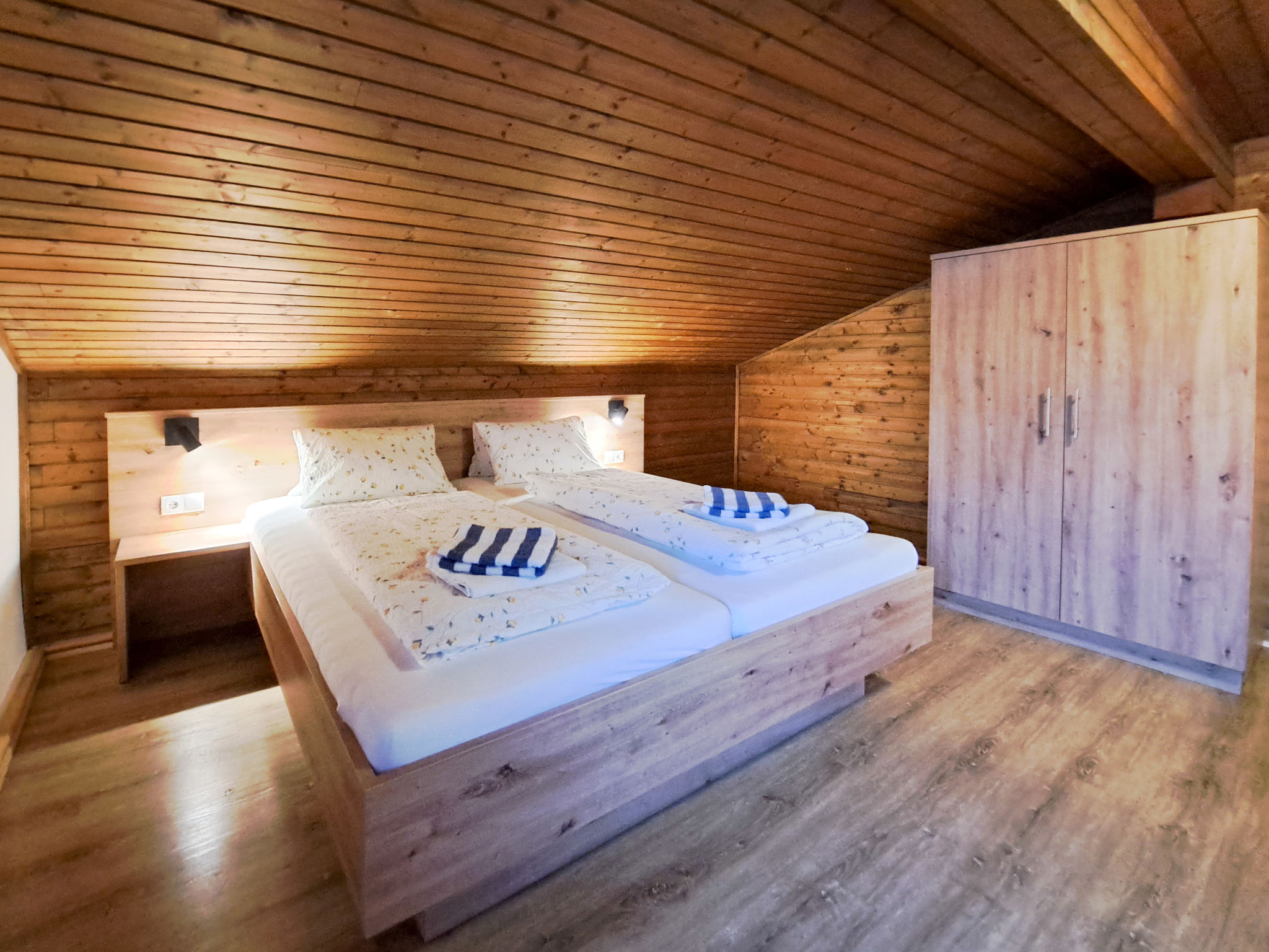 3-Zimmer-Wohnung, 2. Etage, ca. 60 m². Wohnraum mit Sitzgruppe, Essplatz (Eckbank), Küchenzeile (2 Platten, Mikrowelle, Geschirrspüler, Kühlschrank, Kaffeemaschine, Wasserkocher, Toaster) und Balkonausgang. Doppelzimmer. Schlafzimmer mit Doppelbett und Bettcouch. Dusche/WC. Bei Belegung mit weniger Personen als der maximalen Personenzahl stehen nicht alle Wohneinheiten zur Verfügung.