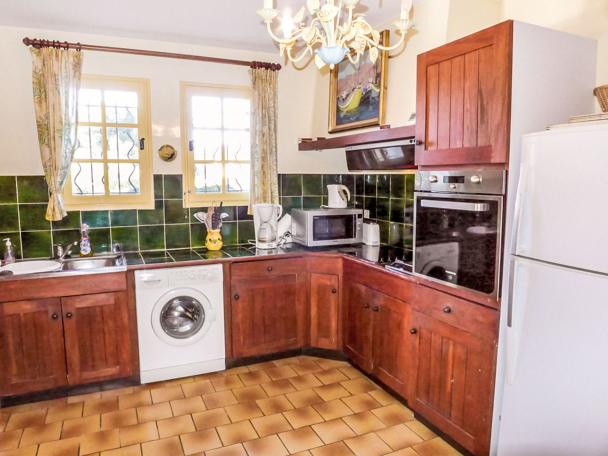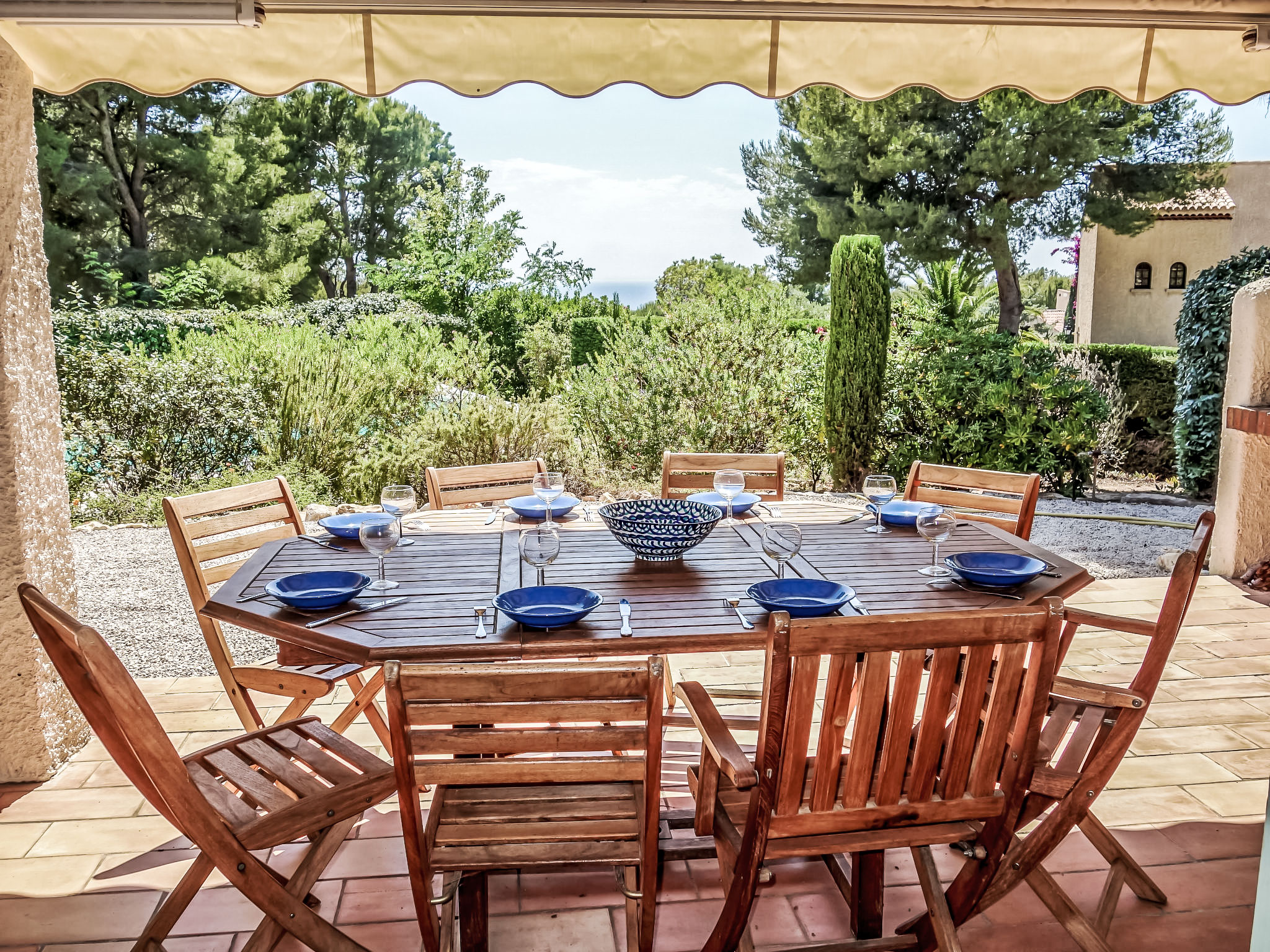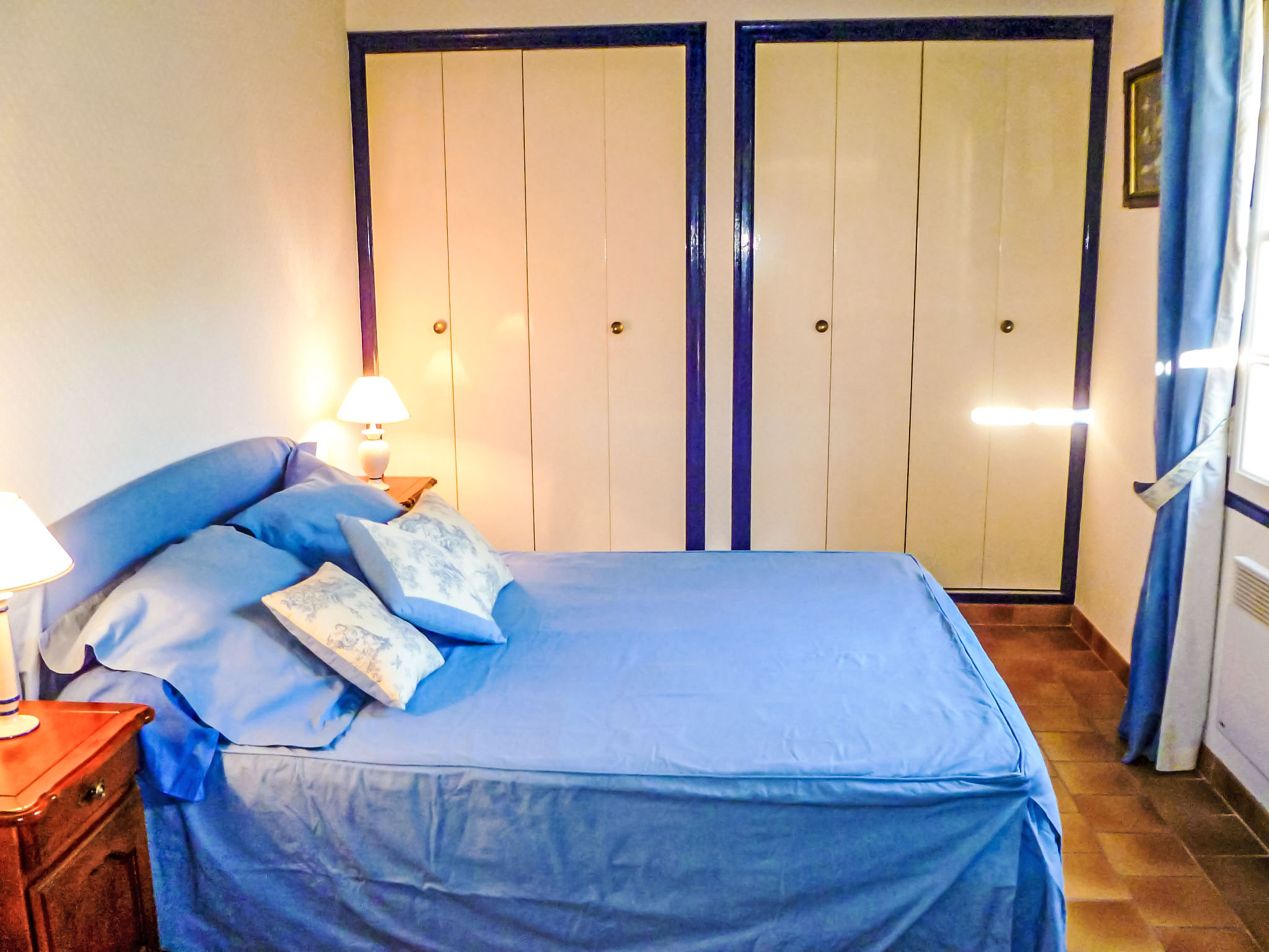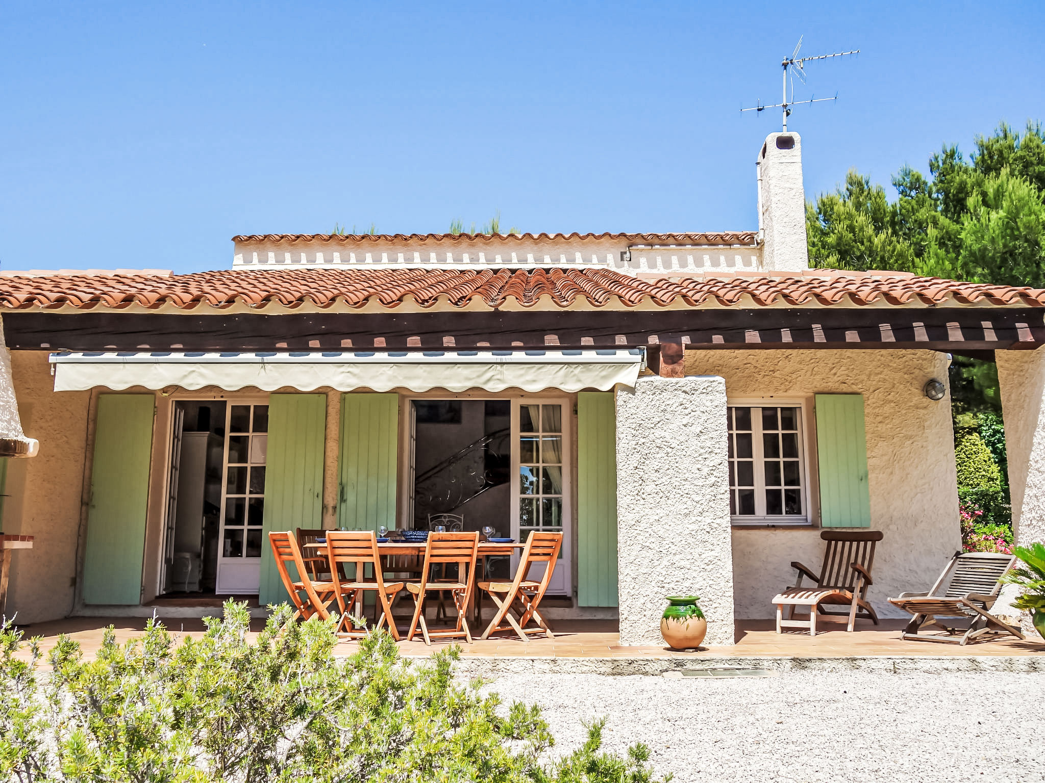 5-Zimmer-Villa 145 m2 auf 2 Stockwerken. Komfortabel eingerichtet: Wohn-/Esszimmer mit TV, Stereoanlage, DVD und Klimaanlage. Ausgang zur Terrasse. 1 Zimmer mit 1 franz. Bett (160 cm, Länge 200 cm), Bad/Dusche und Klimaanlage. Küche (Backofen, Geschirrspüler, 4 Glaskeramikherd Platten, Tiefkühler, elektrische Kaffeemaschine, Kombinationsmikrowelle). Sep. WC. Obergeschoss: 1 Zimmer mit 2 Betten (90 cm, Länge 200 cm). 1 Zimmer mit 2 Betten (80 cm, Länge 190 cm). 1 Zimmer mit 1 franz. Bett (160 cm, Länge 200 cm). Ausgang zum Balkon. Dusche, sep. WC, Doppelwaschbecken. E-Heizung. Balkon 10 m2, Südlage, Terrasse 30 m2, überdacht, Südlage. Terrassenmöbel, Elektrogrill. Eingeschränkte Sicht auf das Meer. Zur Verfügung: Waschmaschine, Bügeleisen, Babybett bis 2 Jahre. Internet (Wireless LAN, gratis). Parkplatz (eingezäunt, 3 Autos). Bitte beachten: TV nur FR. Rauchmelder. Inserat eines gewerblichen Vermieters nach Artikel 155, IV, CGI 83112 000182 WX