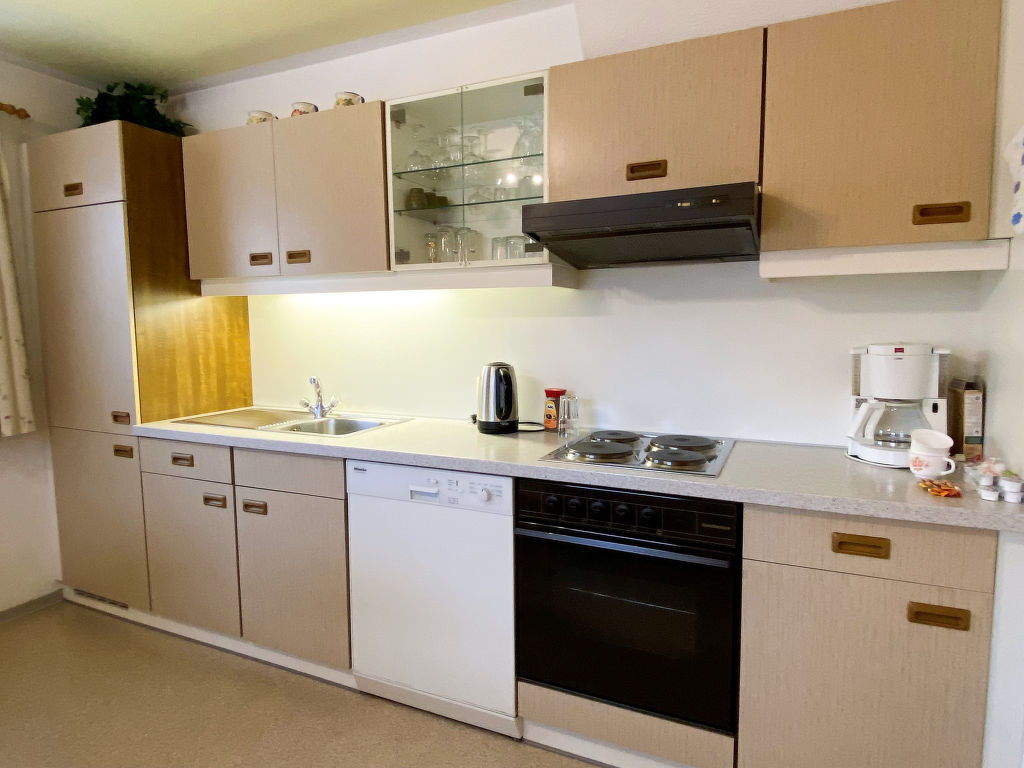 5-Zimmer-Haus, 2 Etagen, ca. 110 m²: Erdgeschoss: Flur mit Garderobe. Wohnraum mit Sitzgruppe. Küche (4 Platten, Backofen, Geschirrspüler, Kühlschrank, Kaffeemaschine, Wasserkocher) mit Essplatz (Eckbank). Bad. Sep.WC. Obergeschoss: Doppelzimmer mit Terrassenausgang. Schlafzimmer mit Doppelbett, Einzelbett (als Zusatzbett, siehe Nebenkosten) und Balkonausgang. Doppelzimmer mit Waschbecken und Balkonausgang. Kleines Schlafzimmer mit Etagenbett. Dusche/WC.